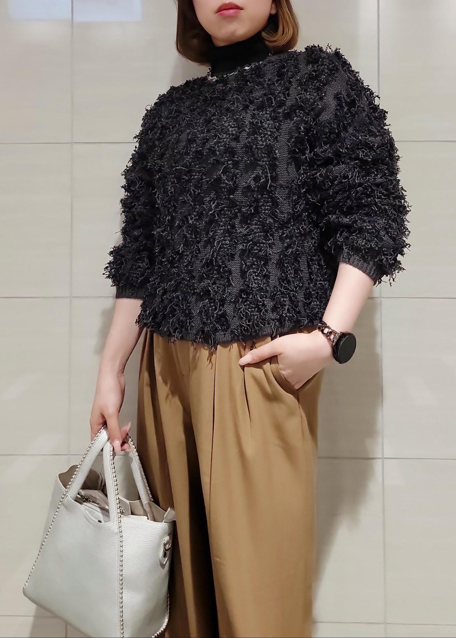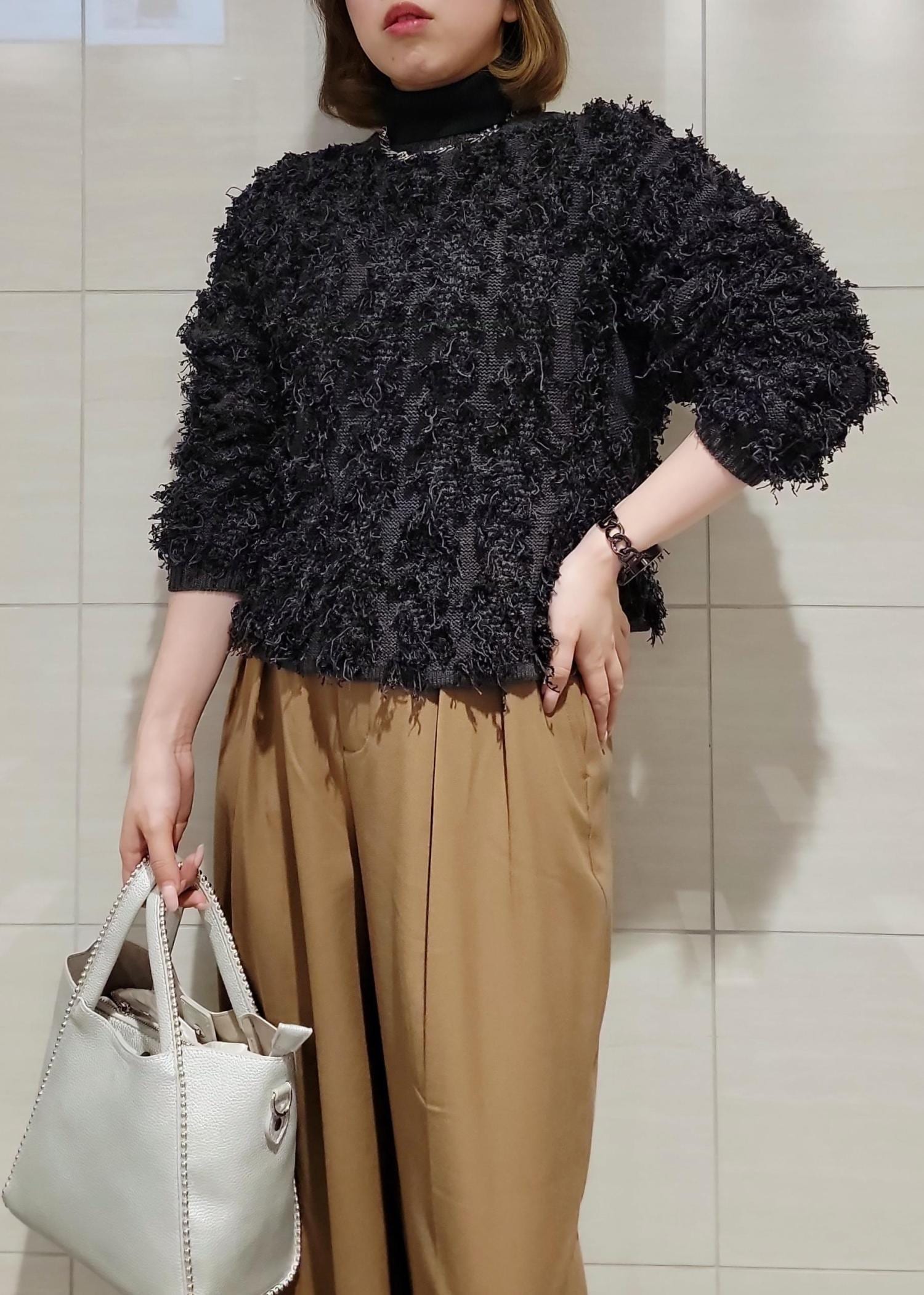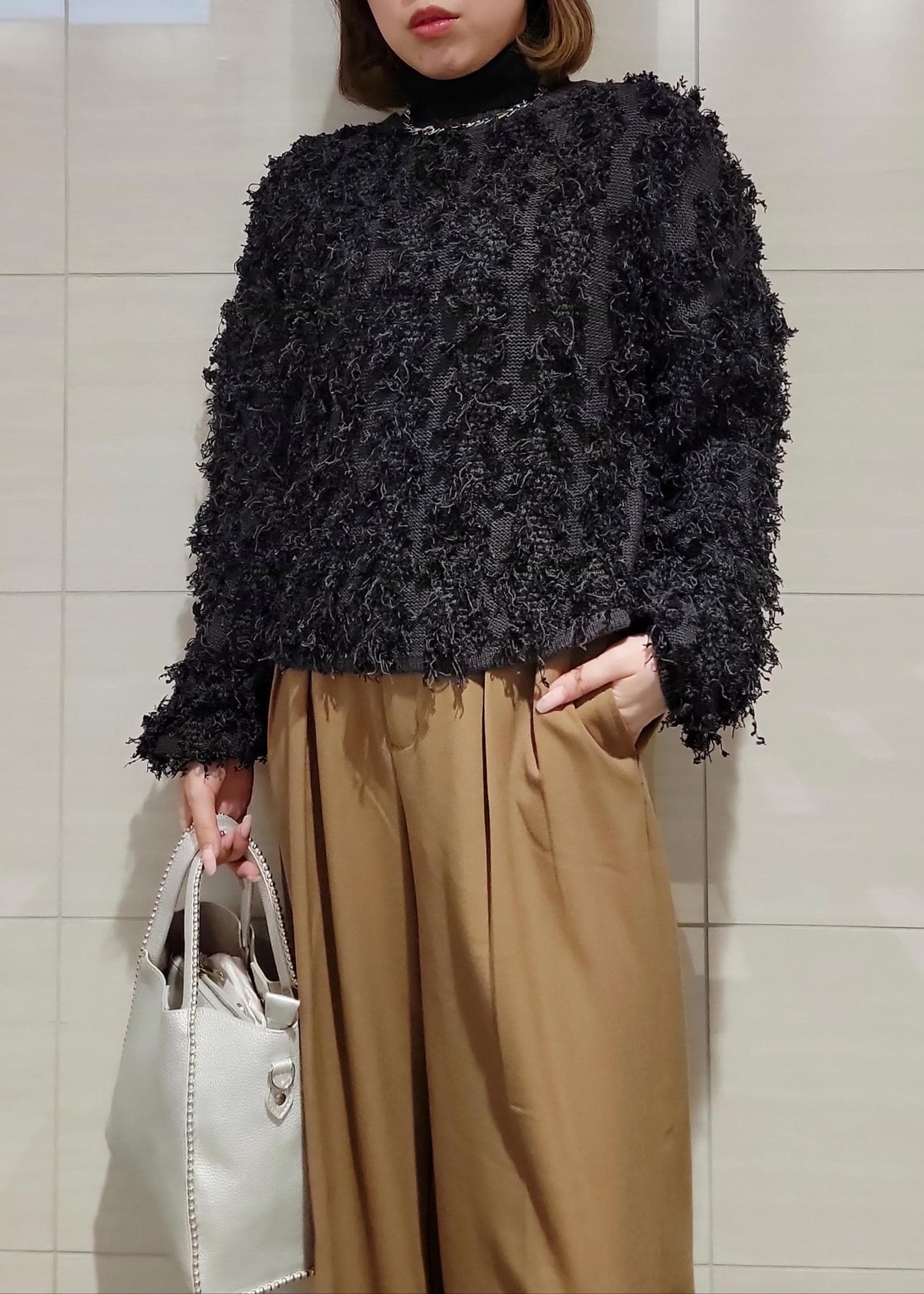 フリンジの毛足の長さがしっかりと出るデザインで、1枚着で着映えするアイテムです。