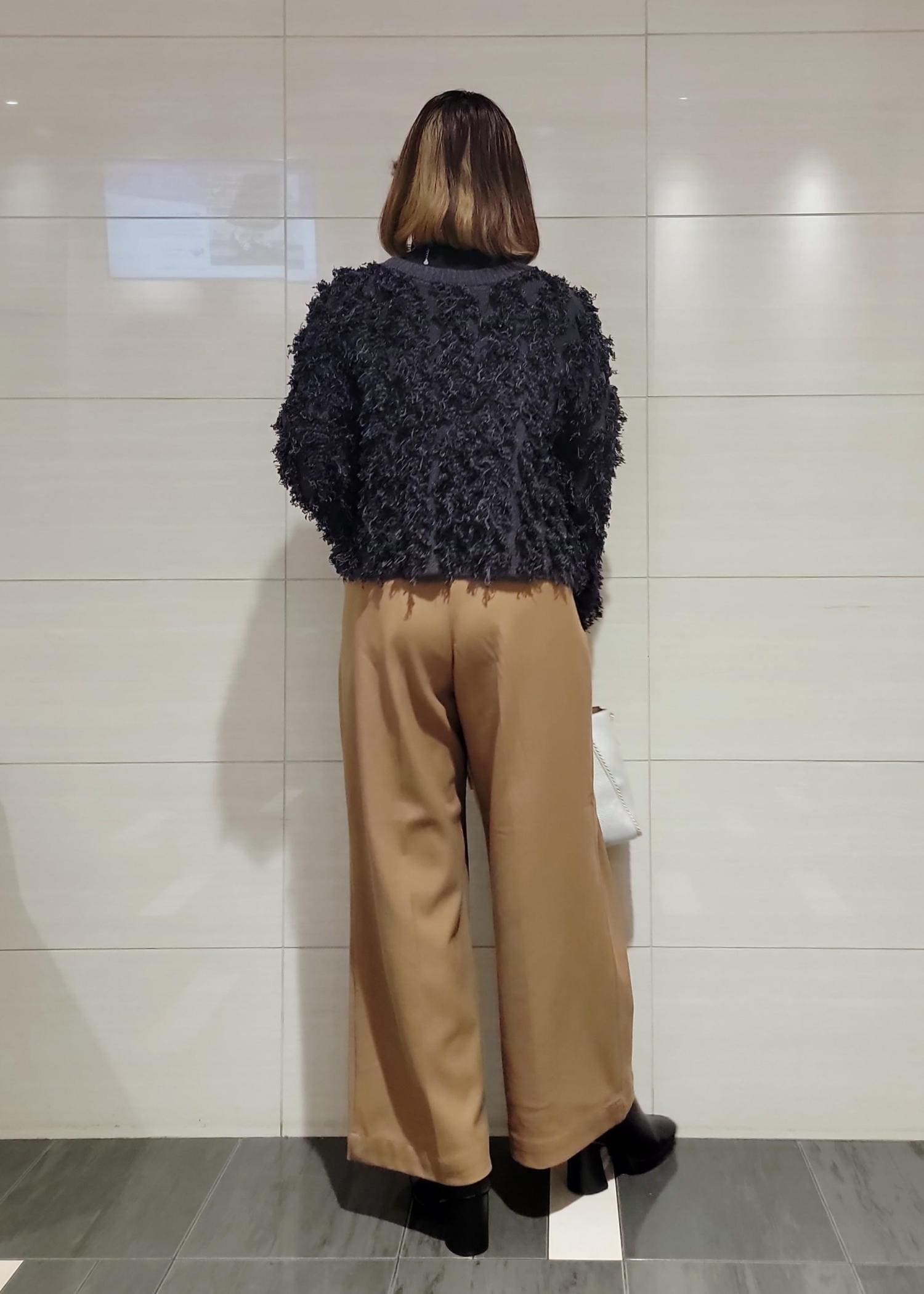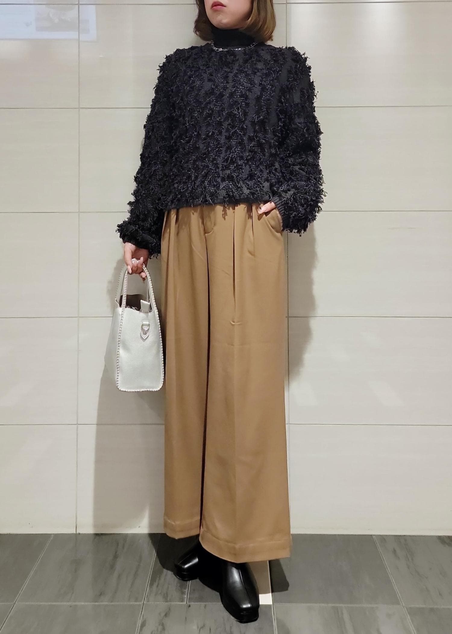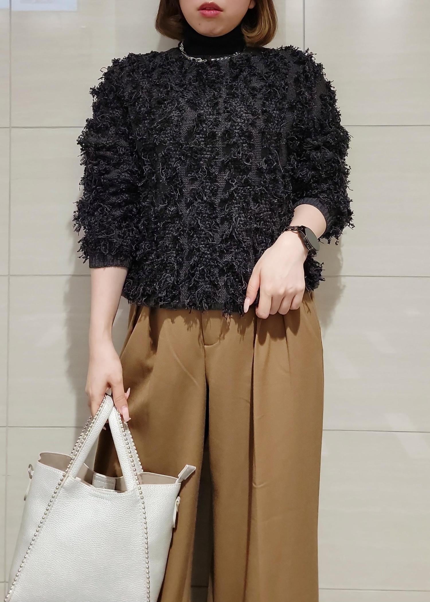 フリンジの毛足の長さがしっかりと出るデザインで、1枚着で着映えするアイテムです。
