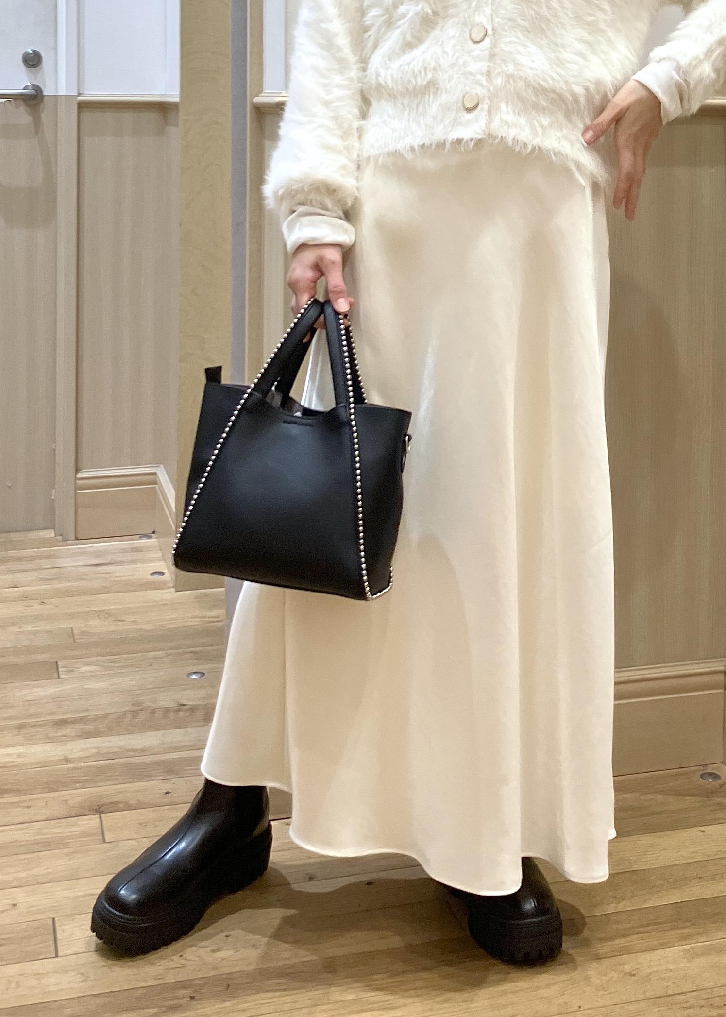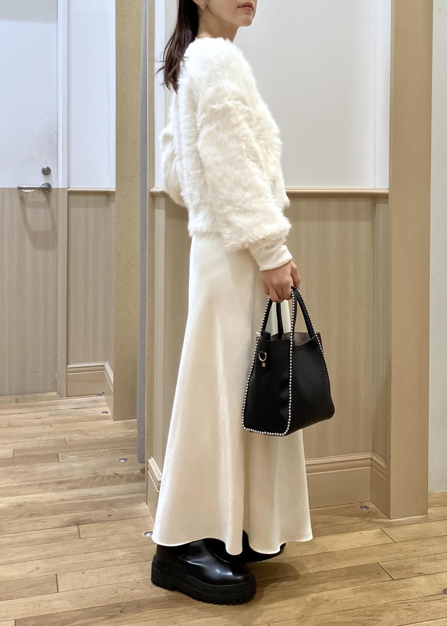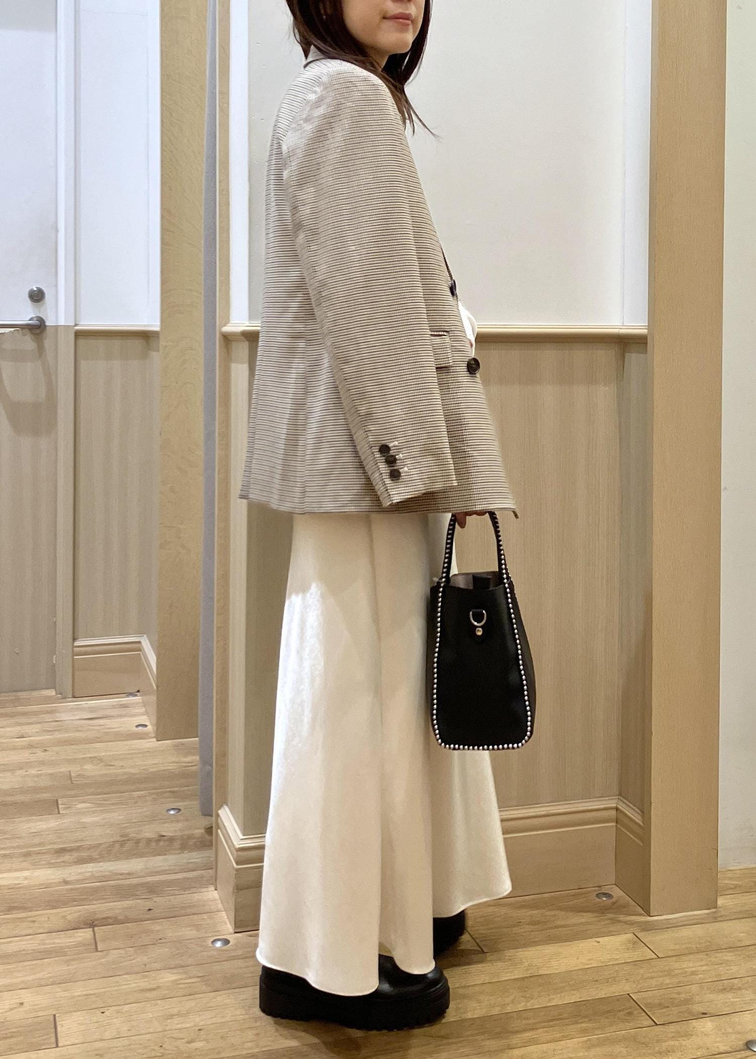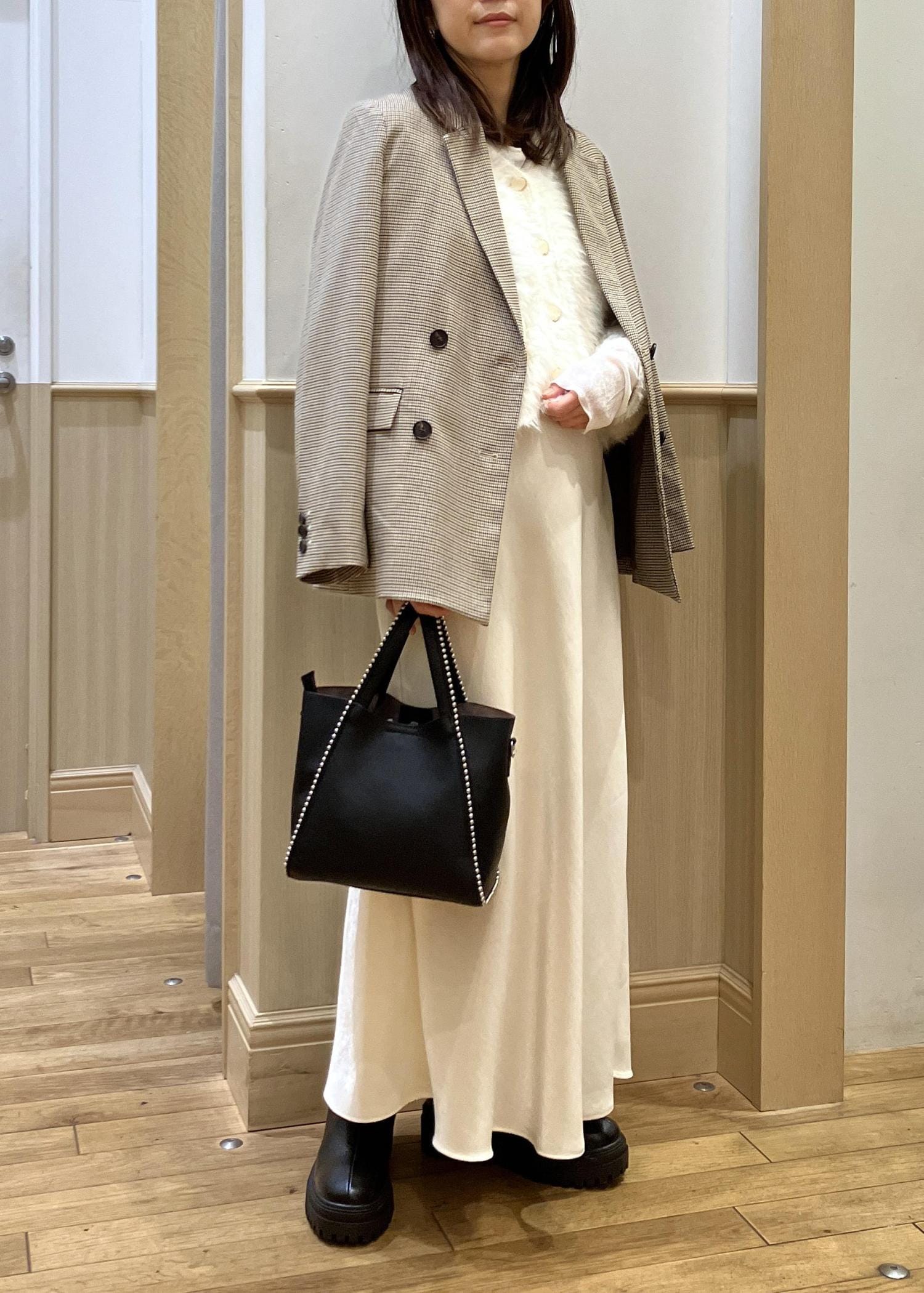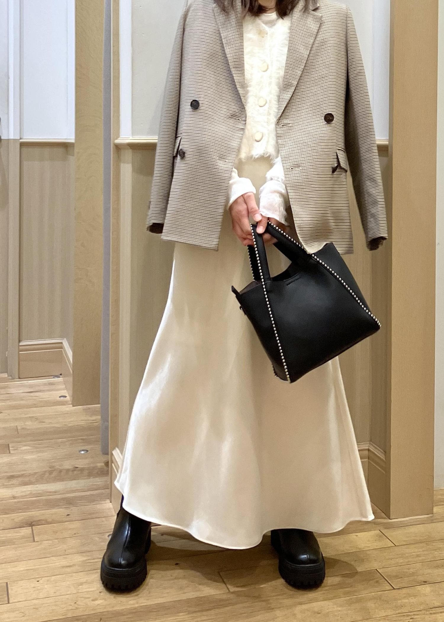 ふわふわニットと艶スカートを女子感高めにホワイトカラーで合わせてみました。甘め王道になり過ぎないようハンサムアイテムのチェックのジャケットを羽織ったのがポイントです。bagとブーツはブラックカラーでまとめてます。