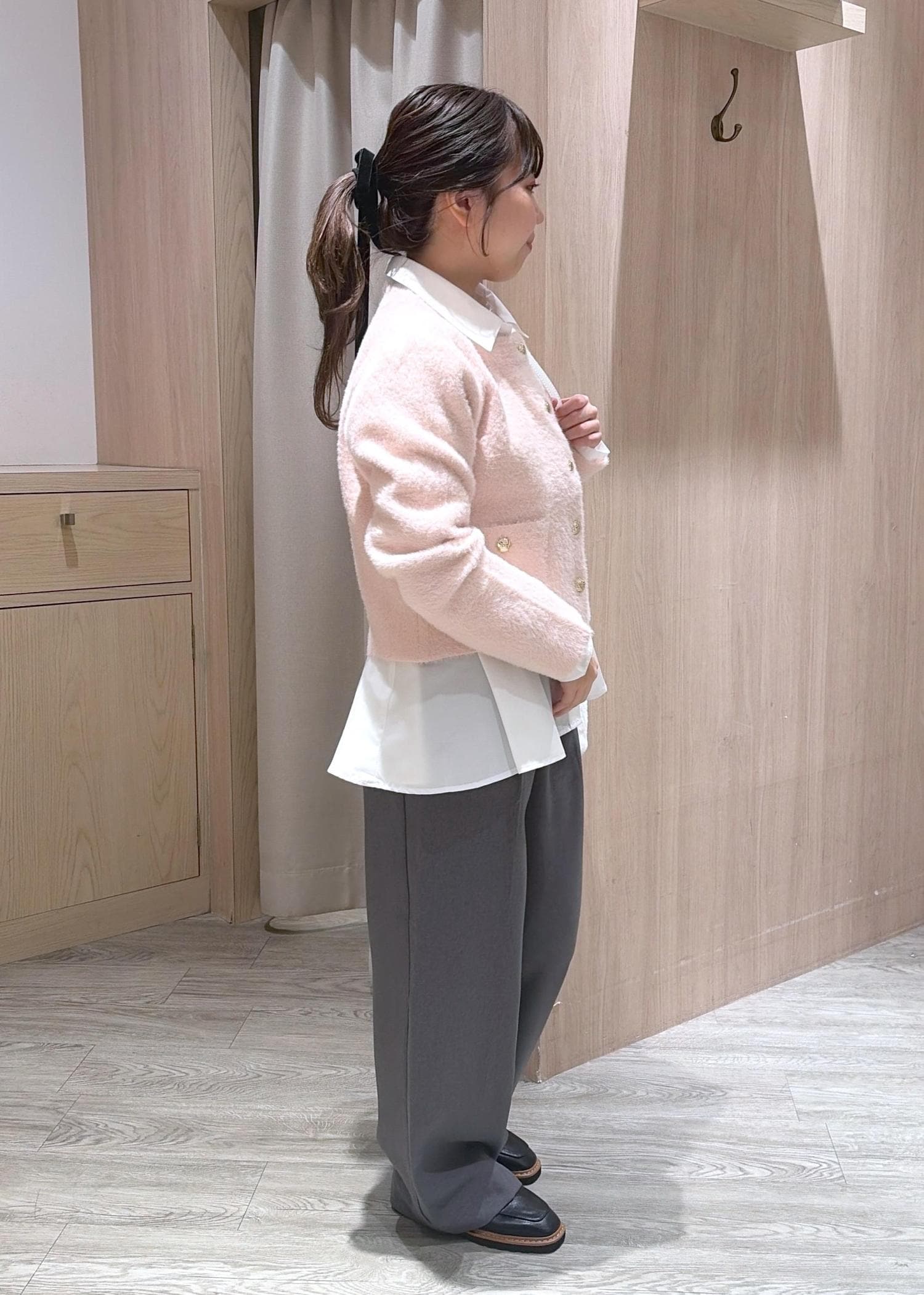 フレアシャツにピンクのカーディガンを合わせたトレンドのレイヤードスタイルです♪