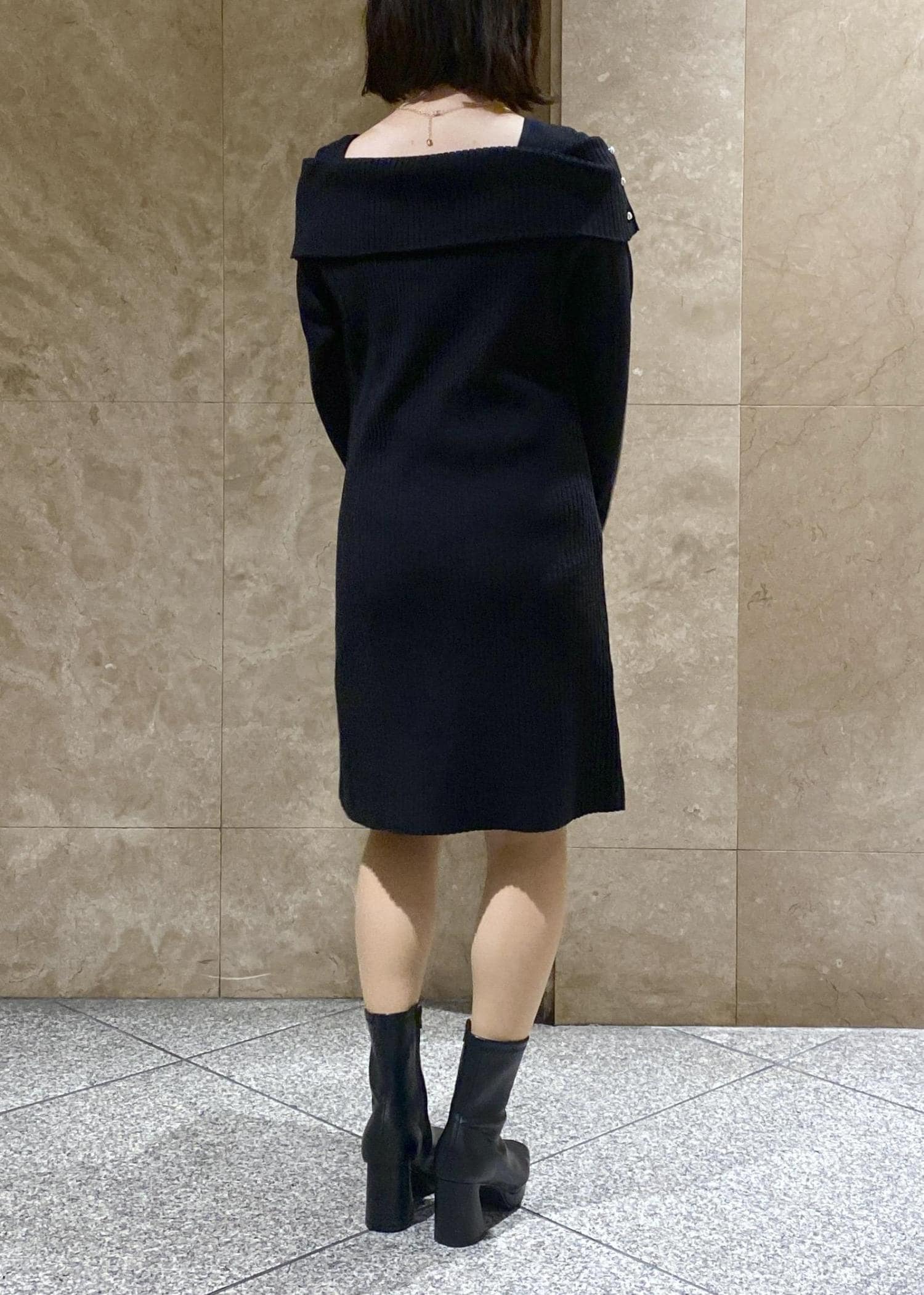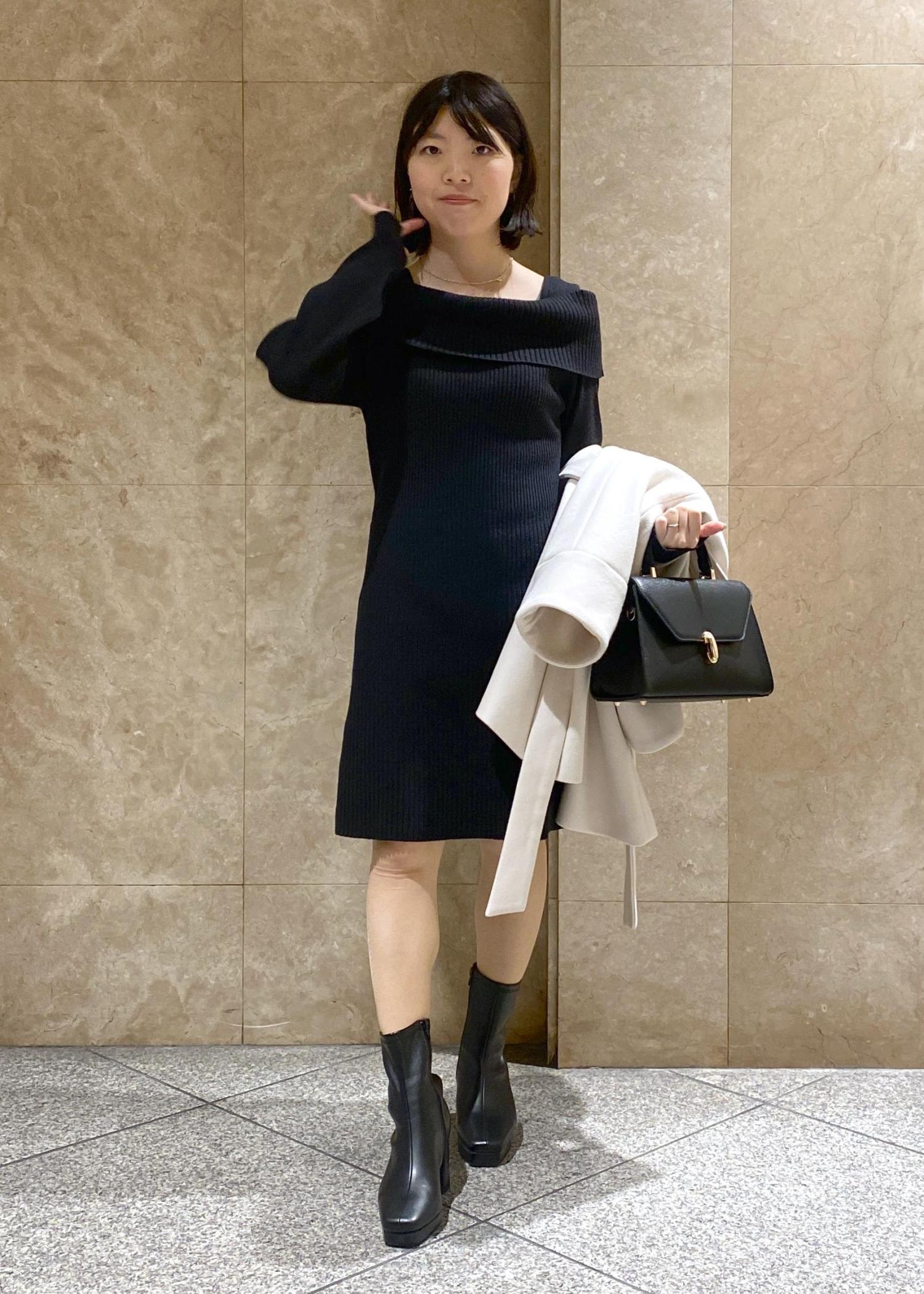 VISアシメオフショルリブニット美シルエットワンピース/着丈が選べるブラック / FS¥8,899レビュー150cmでFSサイズ着用しました!