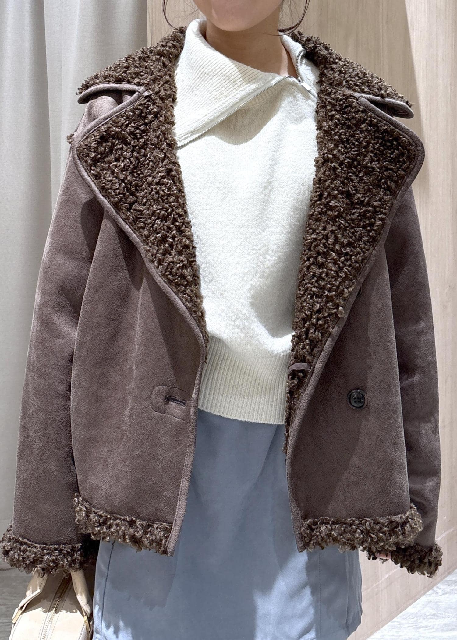 上はデザイン性のあるニットとムートンジャケットでよりオシャレに♪