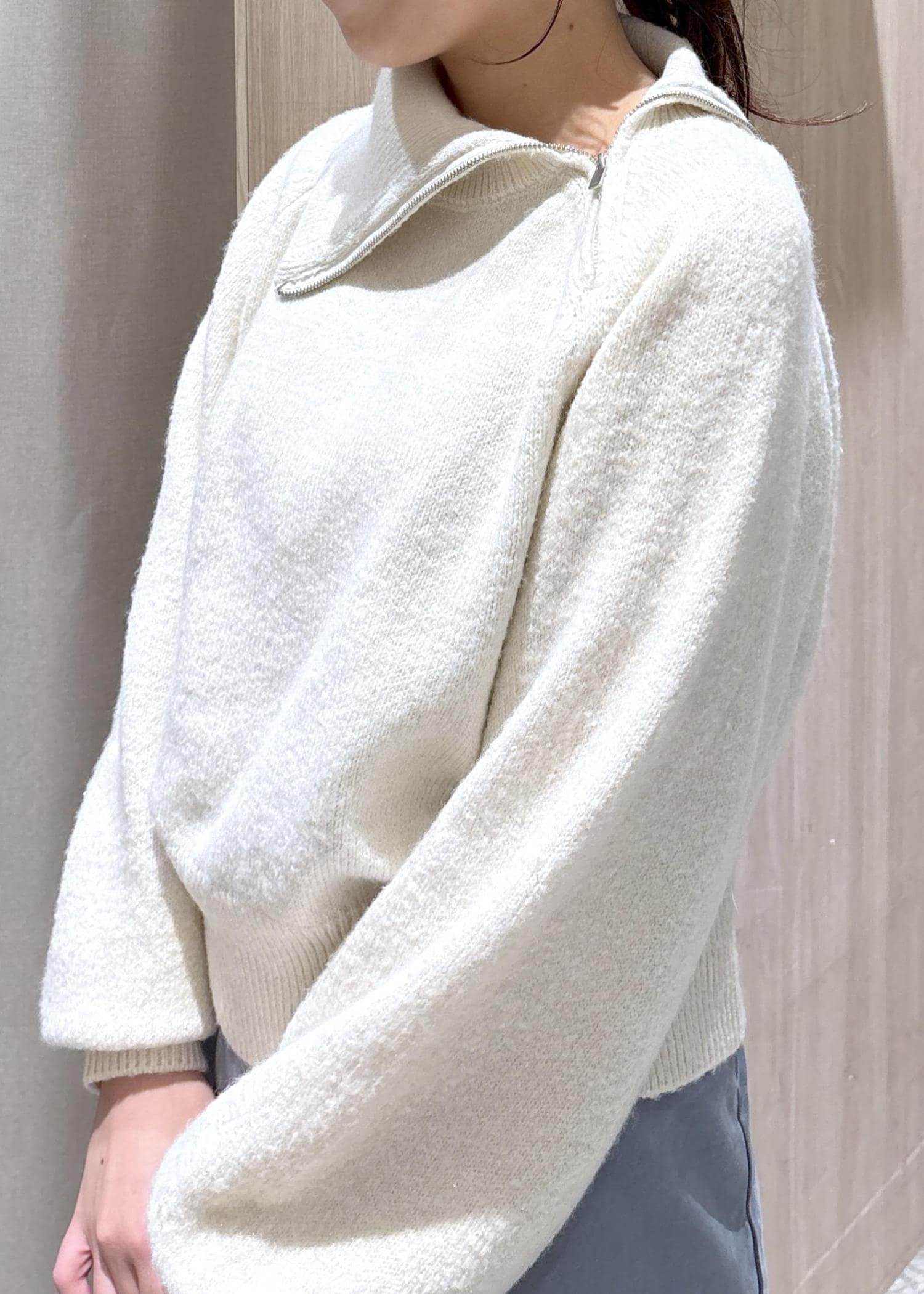 首周りはジップがついており、ジップを開けてヘルシーに見せたり、少し上げて首周りをあたたかくして着たりすることもできます。