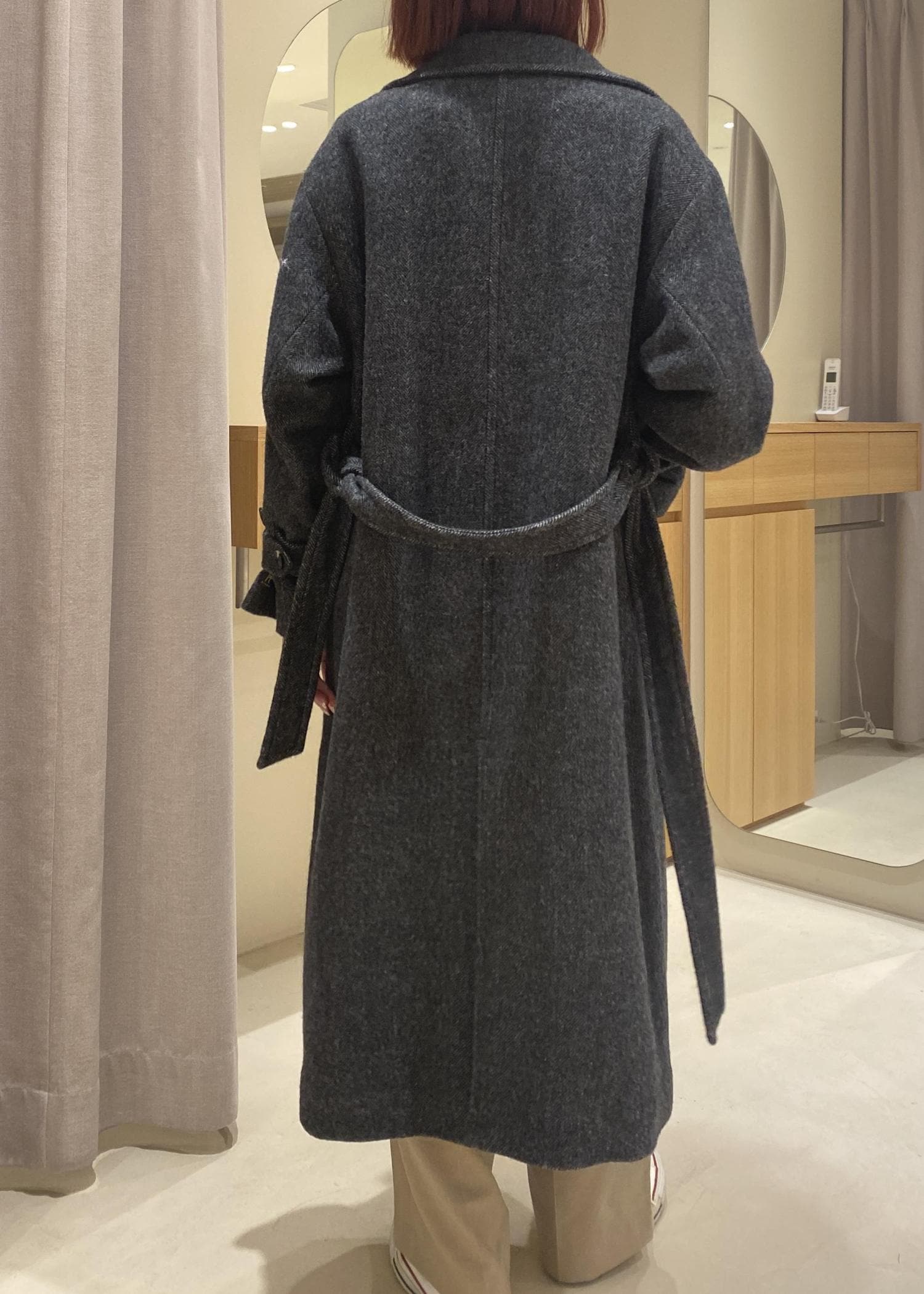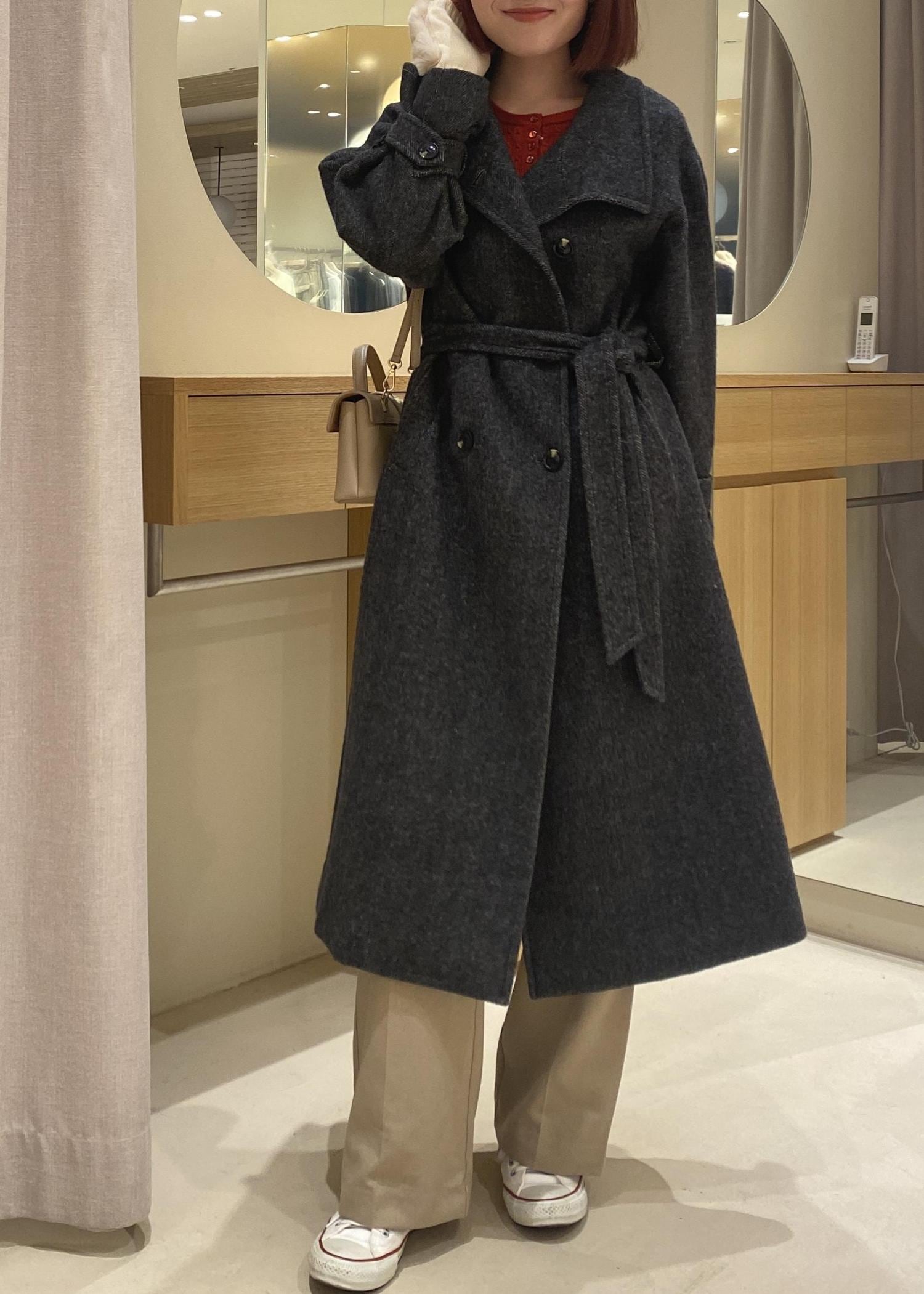 ワイドパンツにロング丈のコートを合わせ、ウエストマークをすることでシルエットにメリハリをつけたキレイめコーデです!