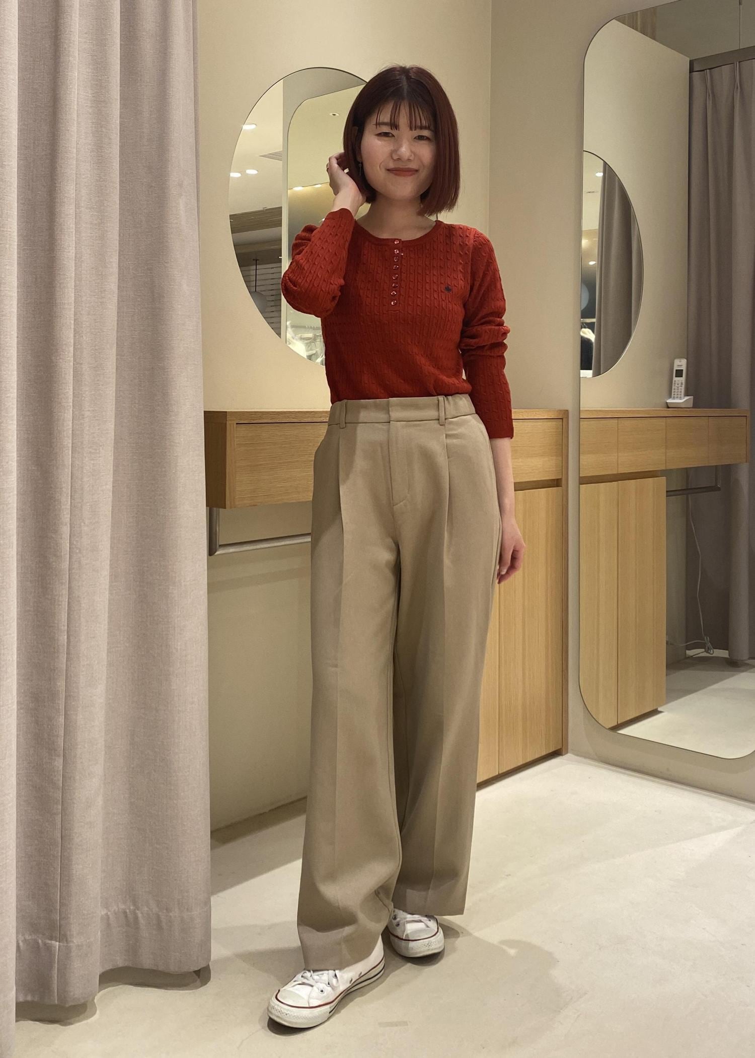167cmでMサイズ着用、足首がしっかり見える丈感でした。サイズ感はゆとりがあり、中に厚めのトップスを合わせても安心です◎