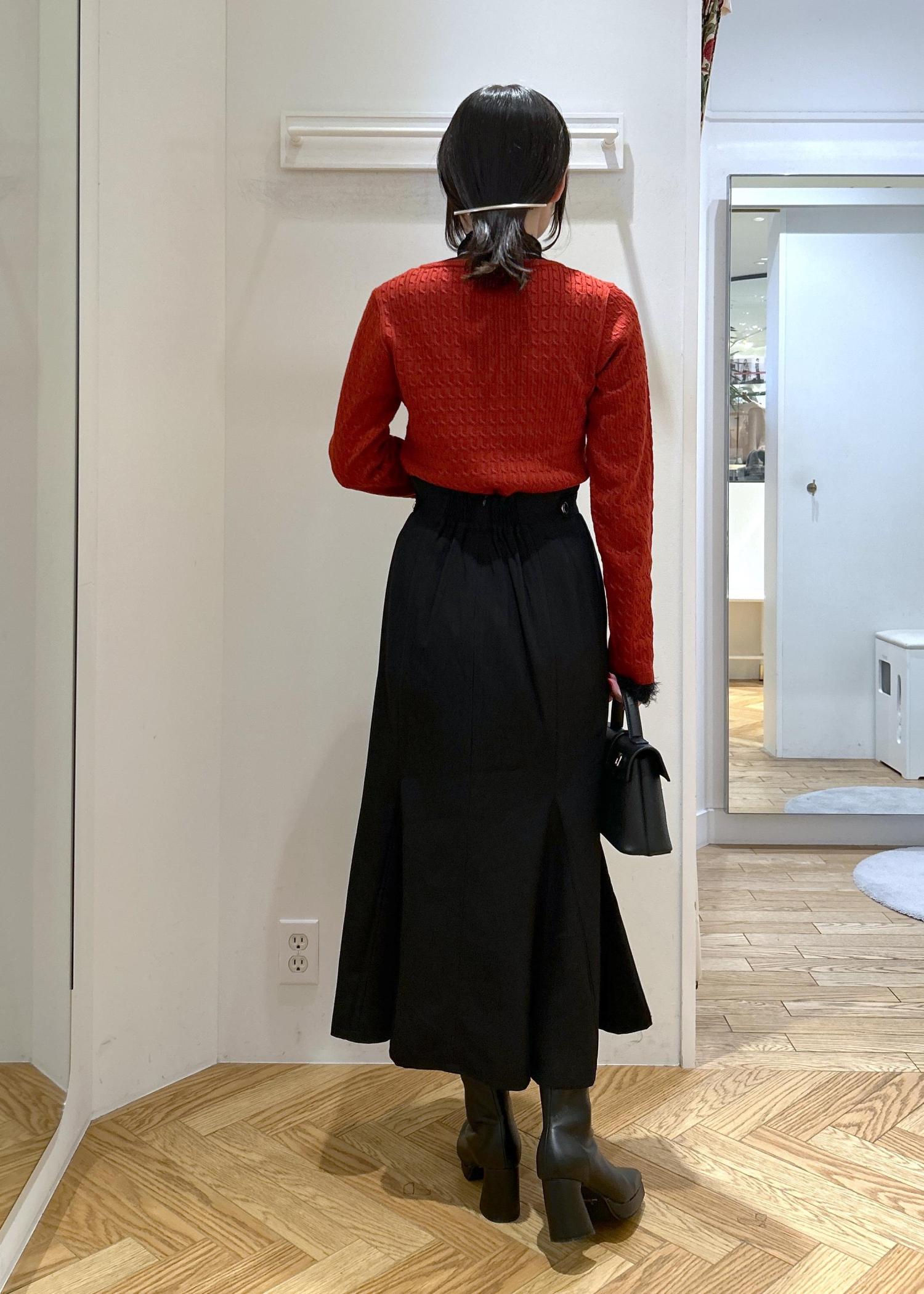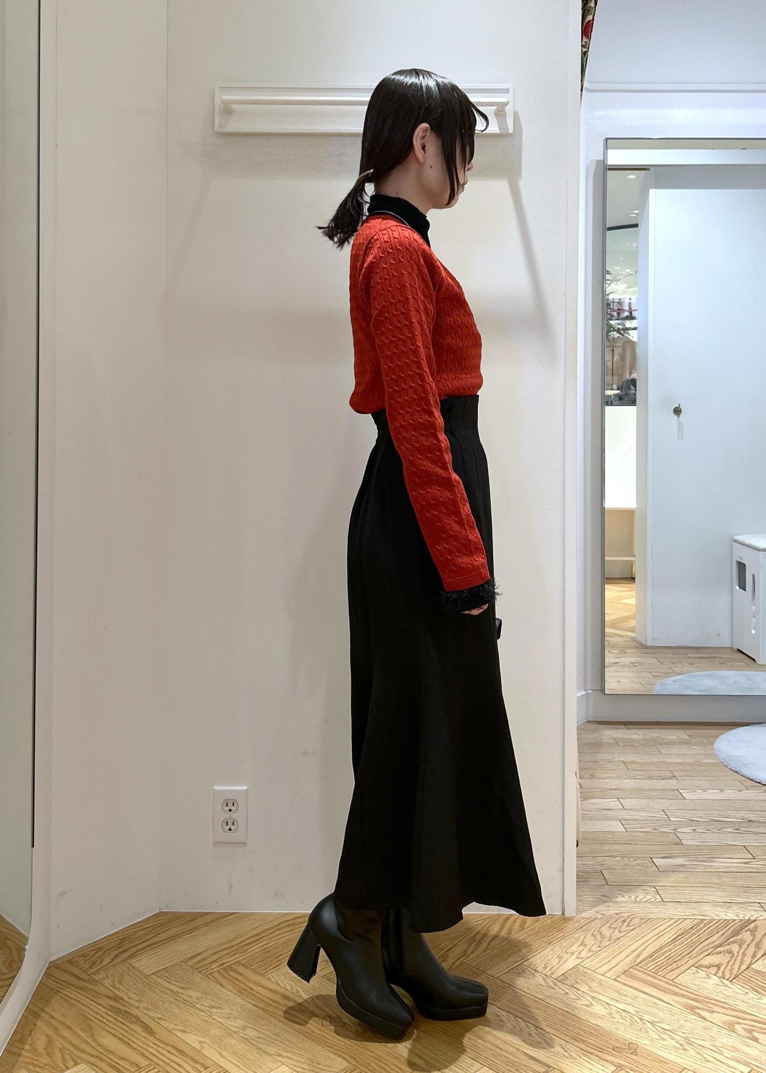 伸縮性があり、シャツやハイネックトップスとのレイヤードも相性が良いです◎
