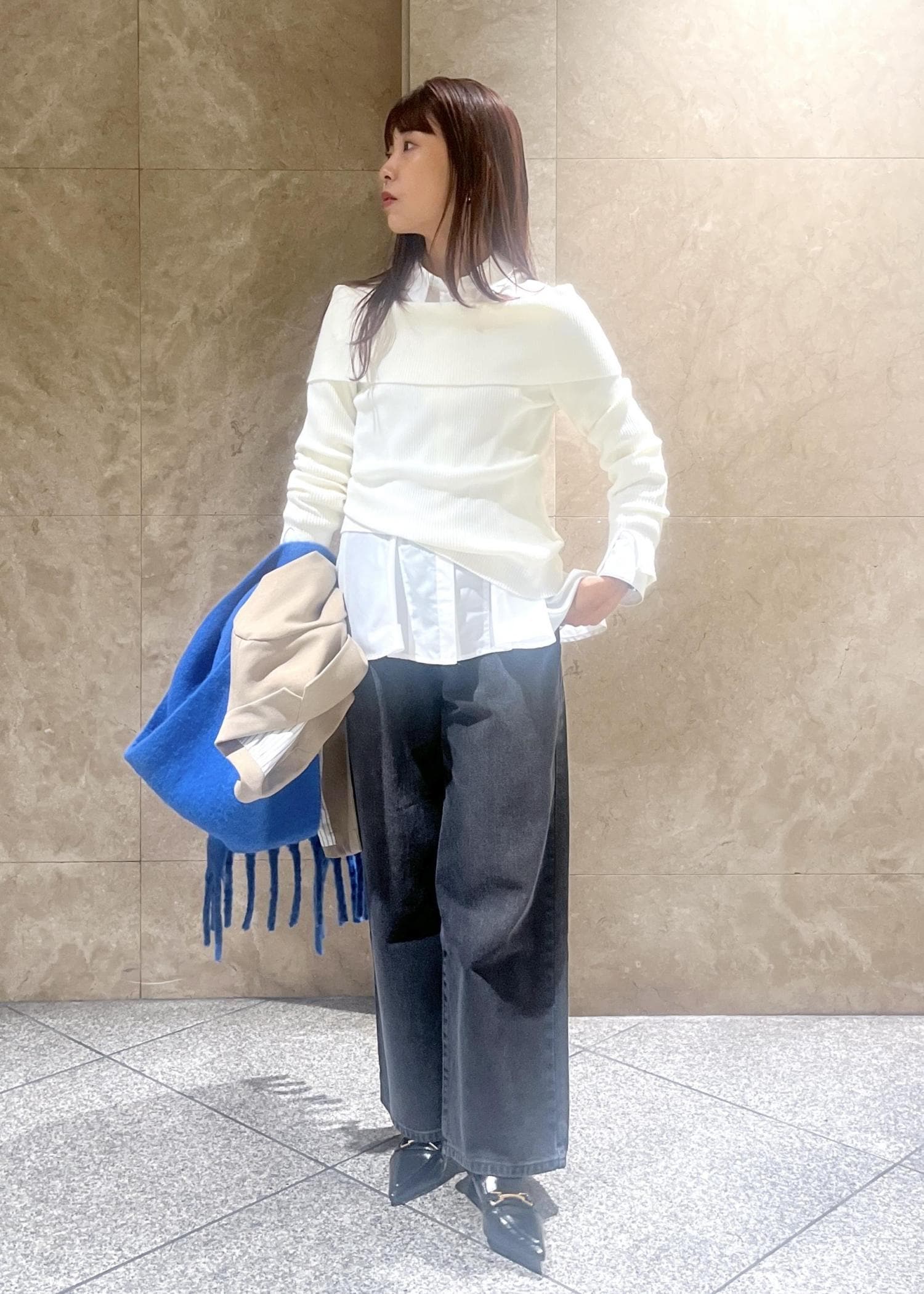 反対に肩周りや胸周りなどは意外にすっきりとジャストサイズで着用できるため、ボリュームが出すぎることもなく、上からニットやカーディガンなどレイヤードもしやすいデザインです◎