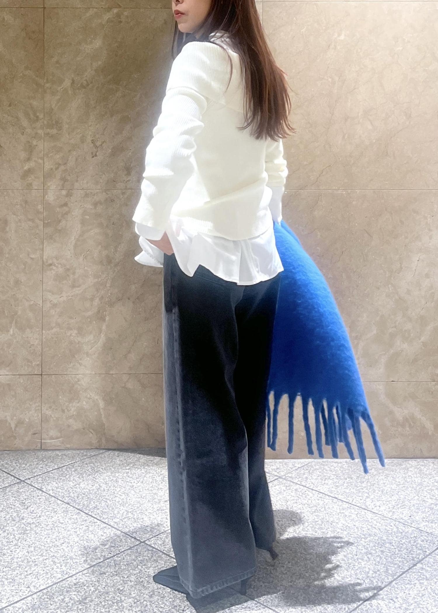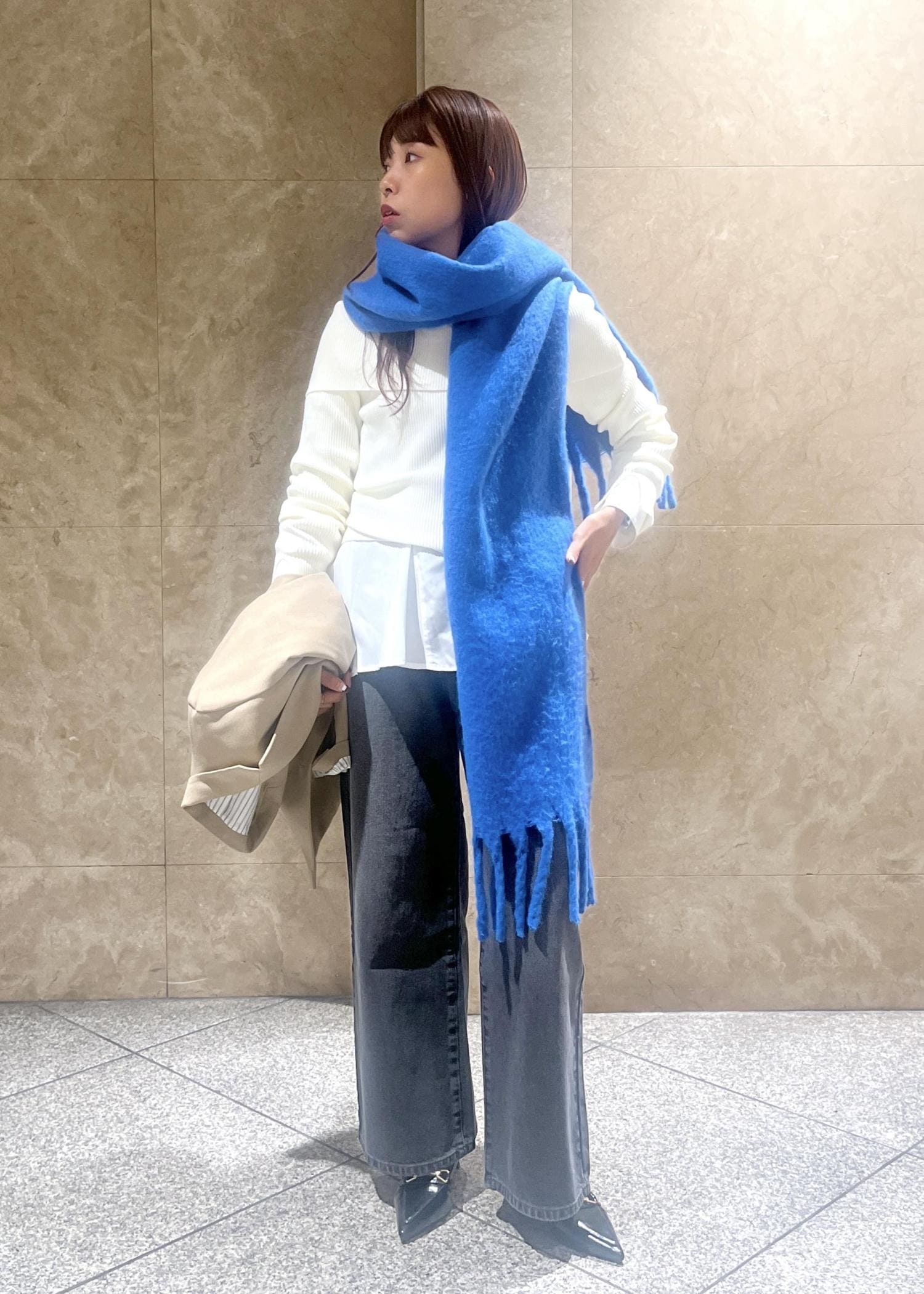 大判なので肩掛けで軽いアウターのようにも使えて、あたたかさだけでなく、カラーや存在感がコーディネートのポイントになるようなマフラーです!