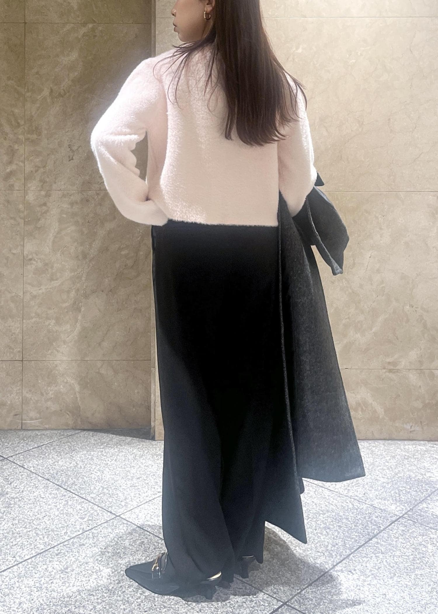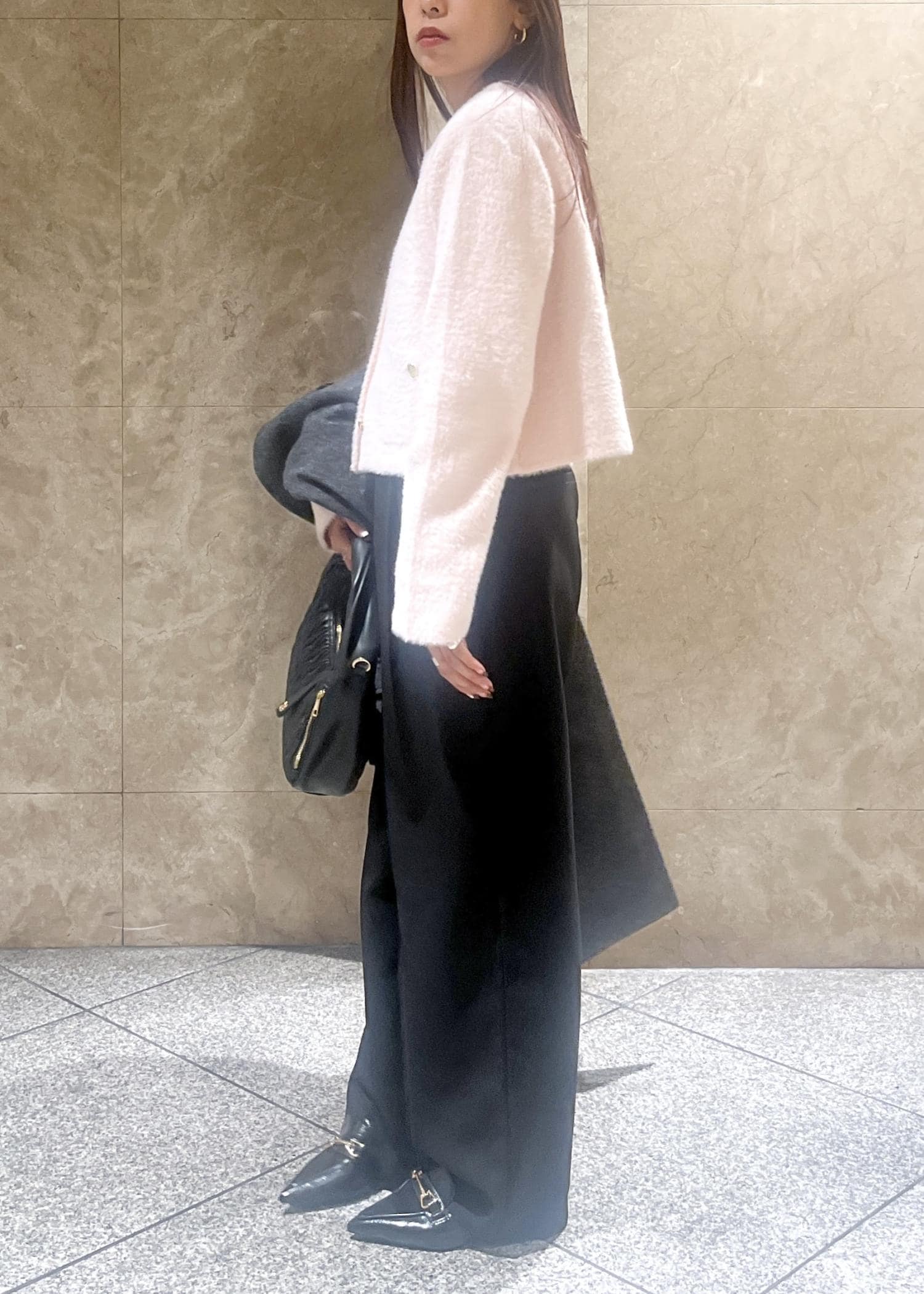 ふわっと素材のボリューム感はありますが、肩もジャストで全体的にコンパクトな印象、スカート、パンツスタイルはもちろんワンピースとのバランスも取りやすいデザインです◎