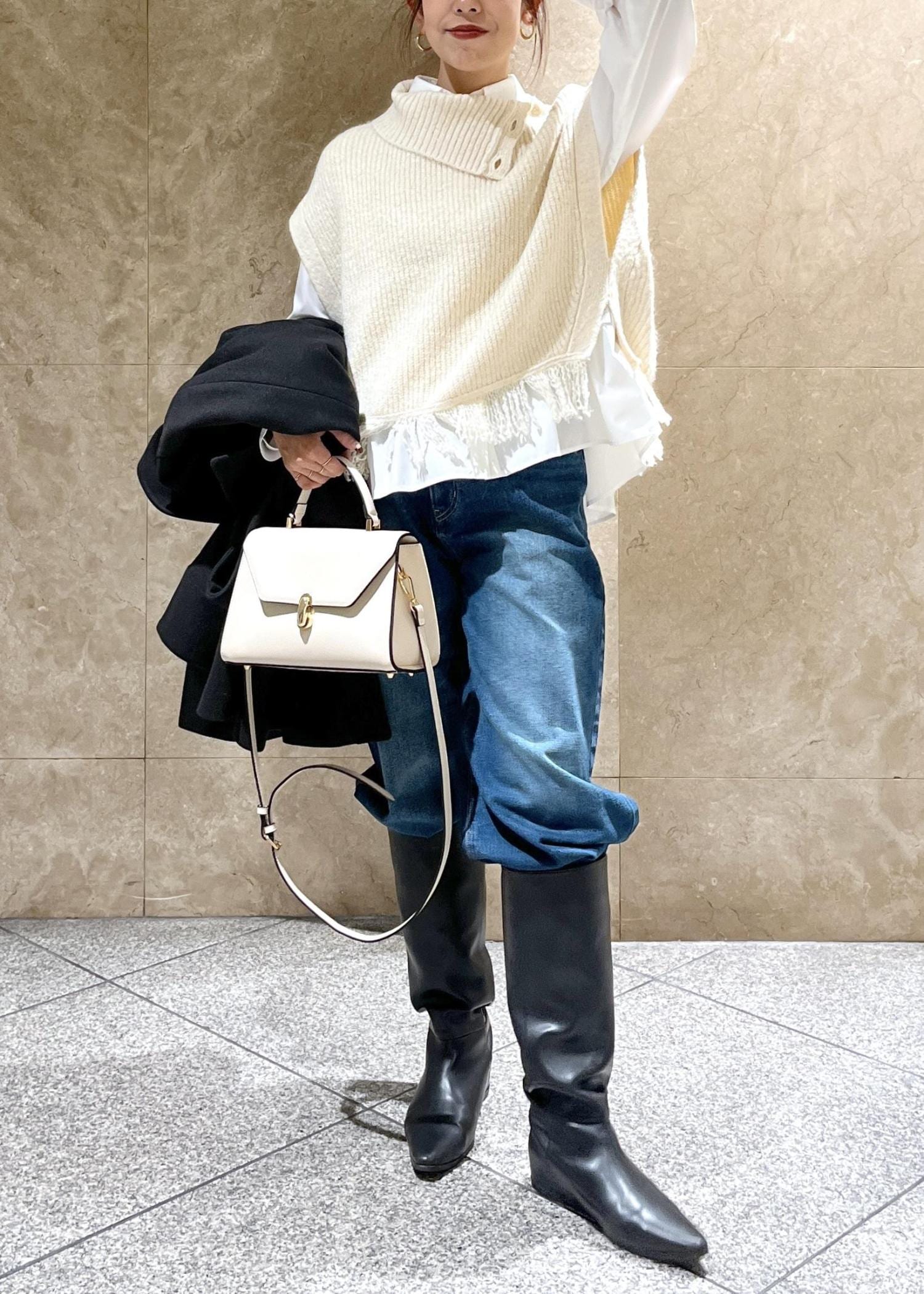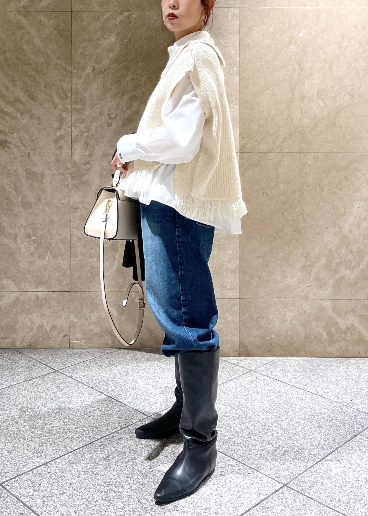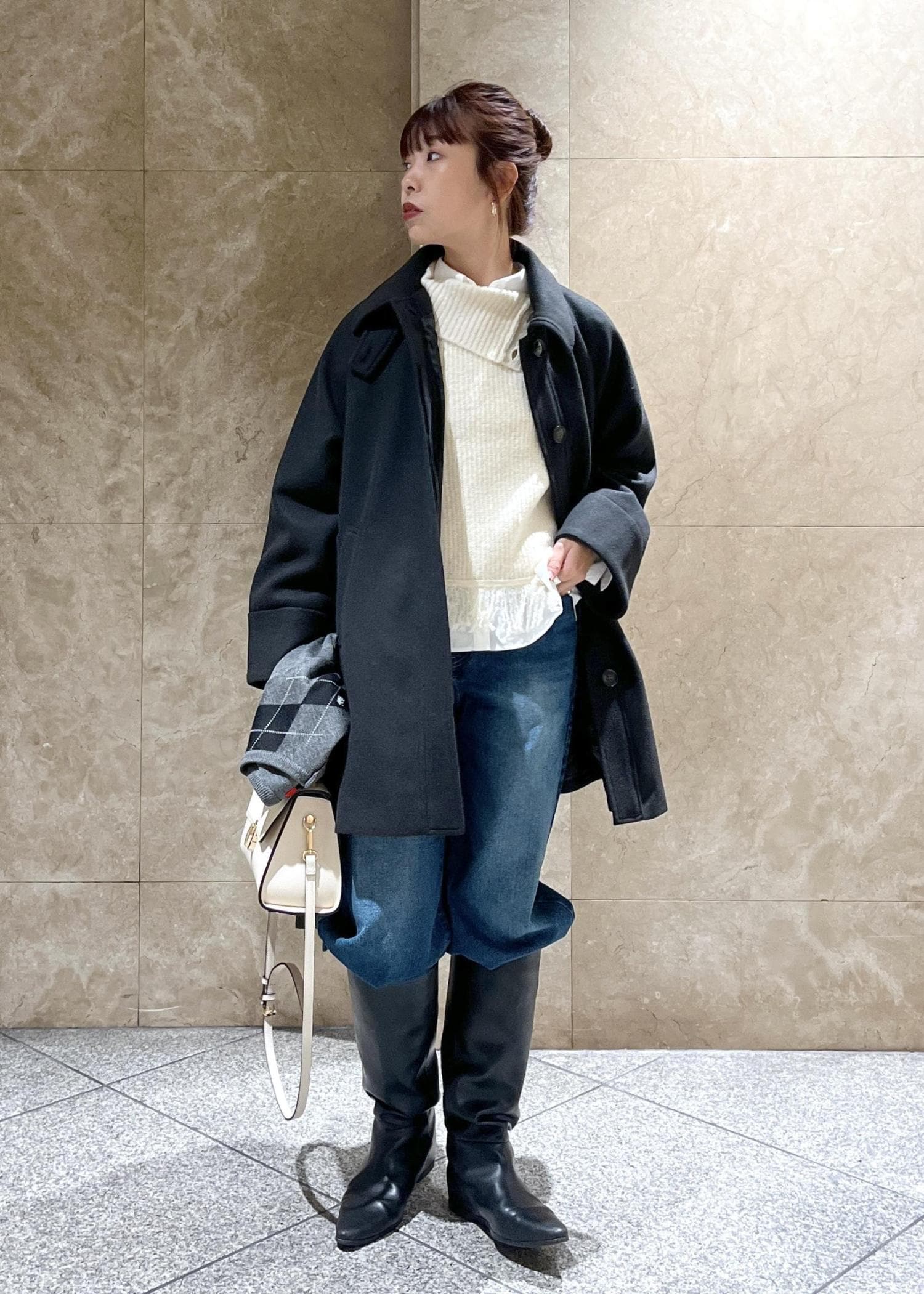 全体的にはAラインのスッキリとしたシルエットですが、身幅や腕周りなどはゆったりとしたサイズ感なので、インナーには厚手のニットも余裕で着られるサイジング◎