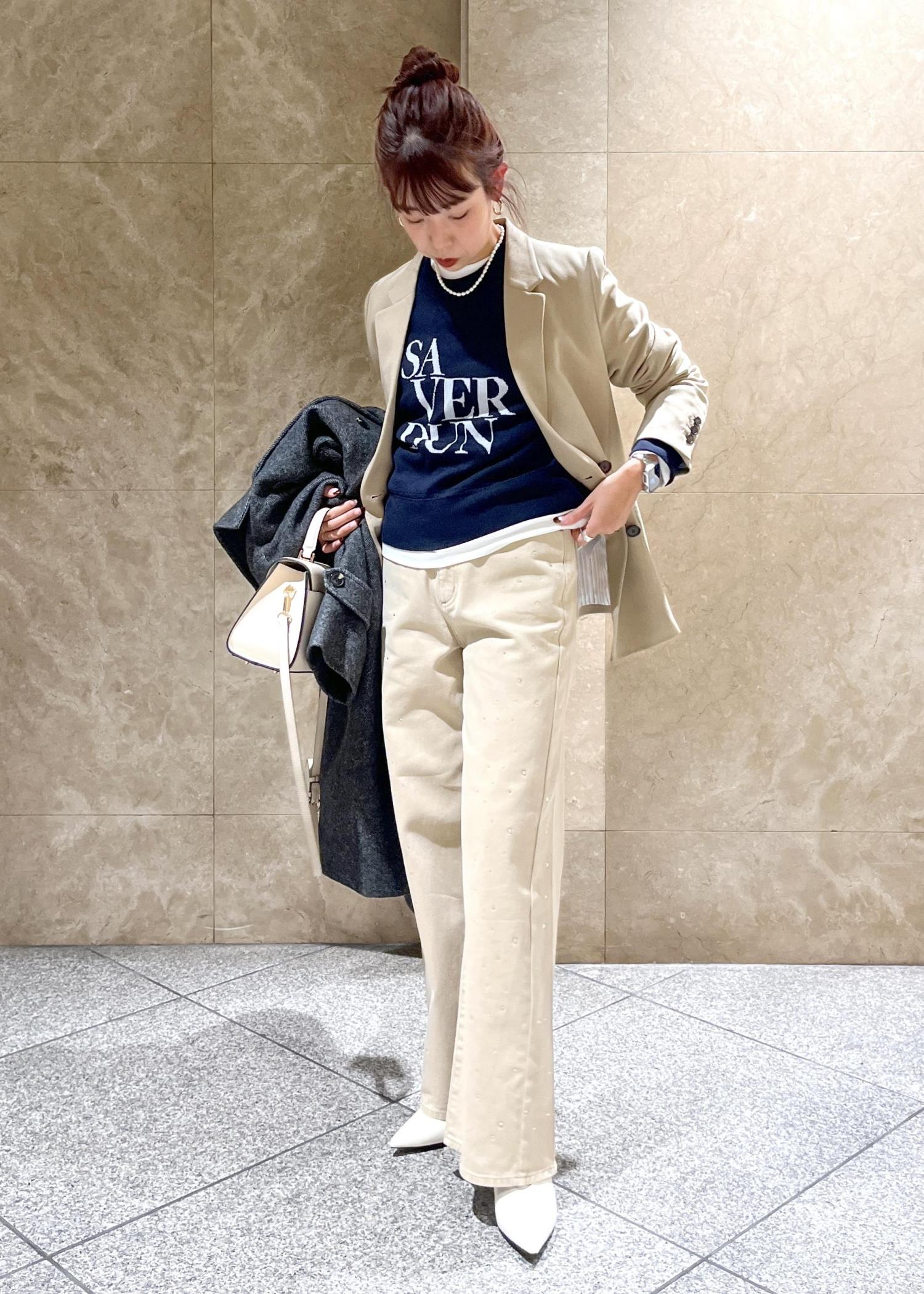 ベージュのデニムでセットアップ風に。