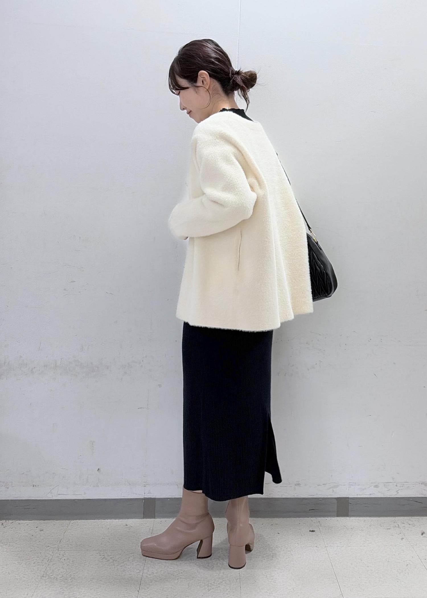 VIS接結メタルボタンミニフェザーニットコートオフホワイト / F¥9,999レビュー167cmでおしりまでしっかり隠れるロングカーディガンです!!