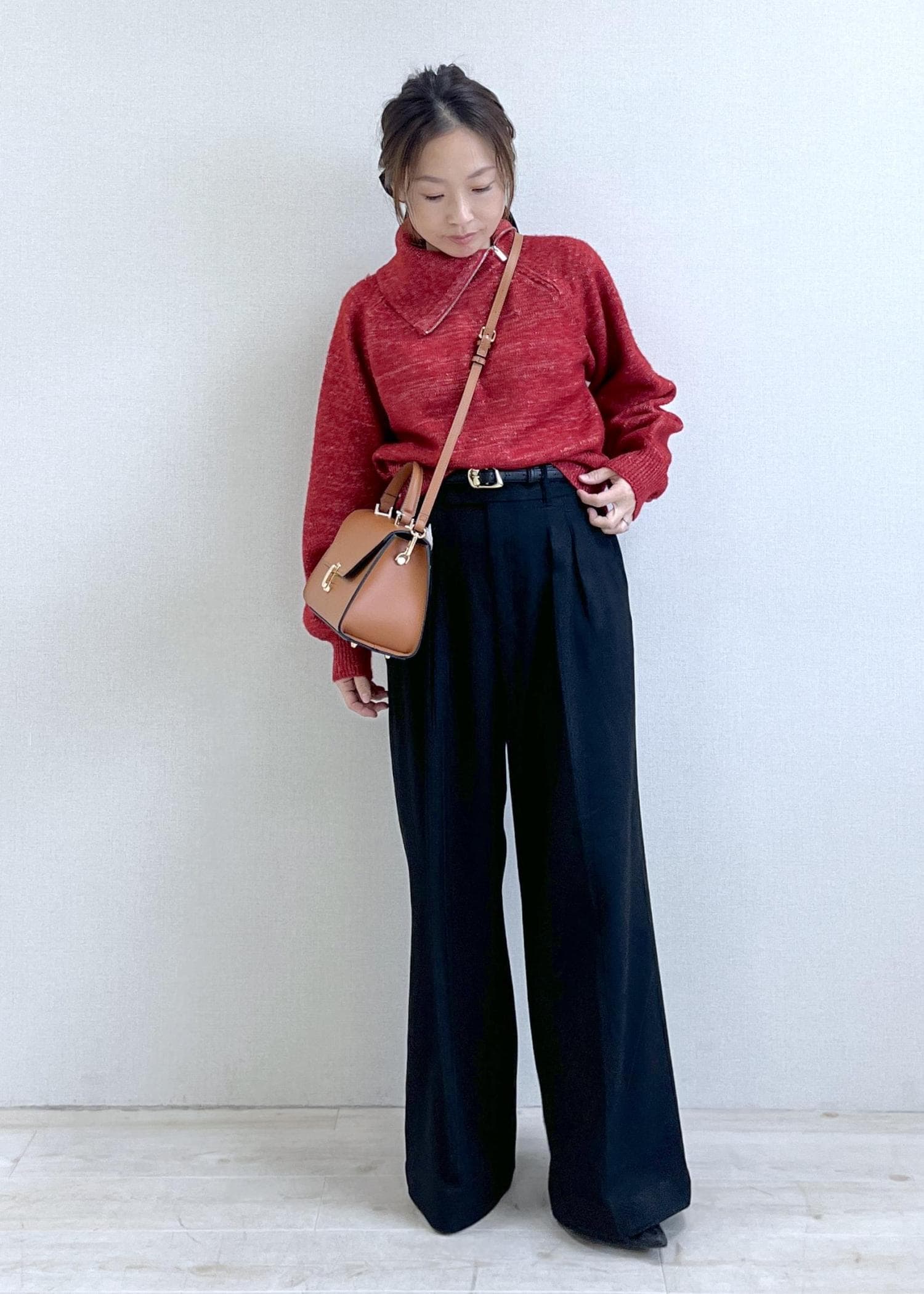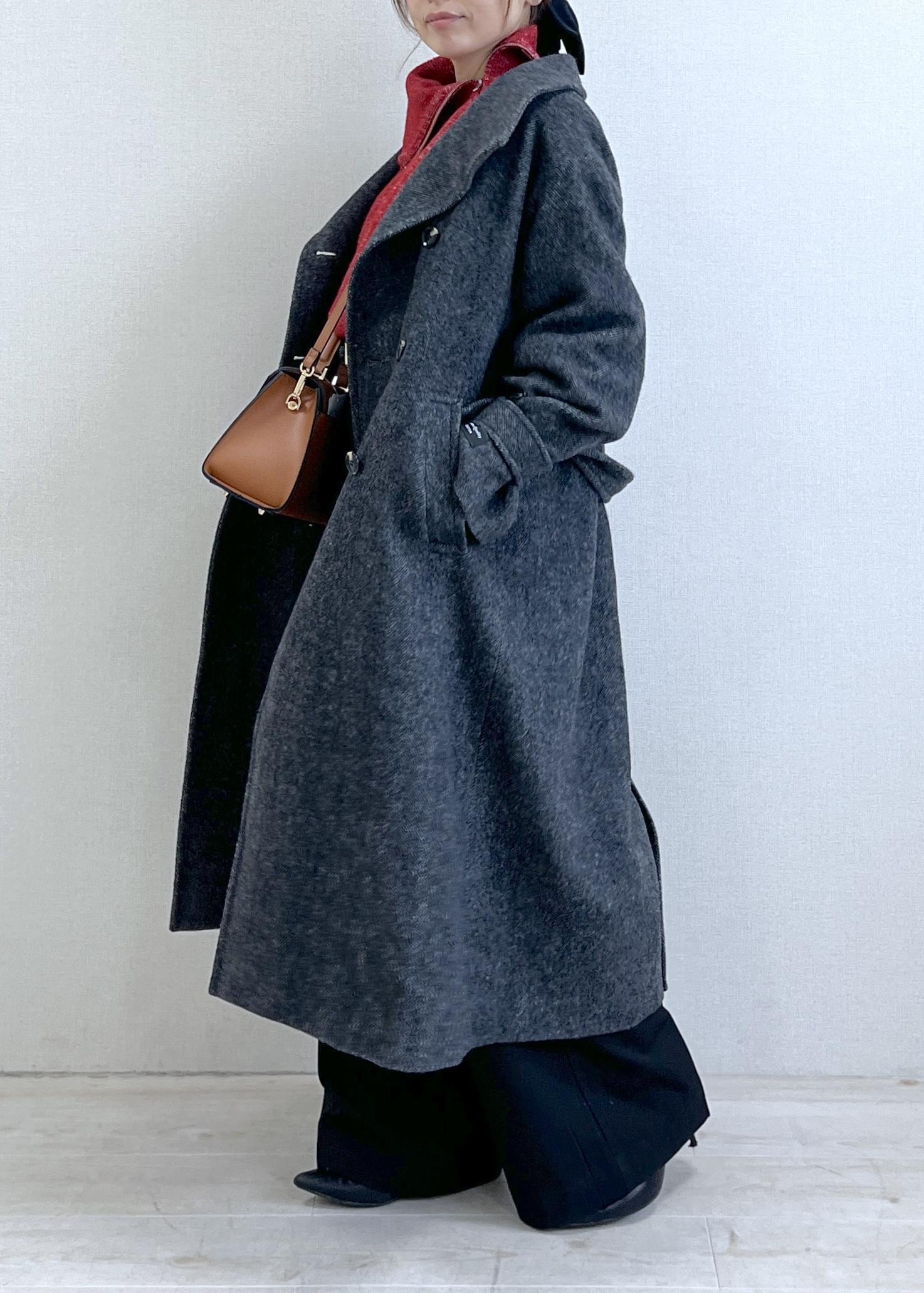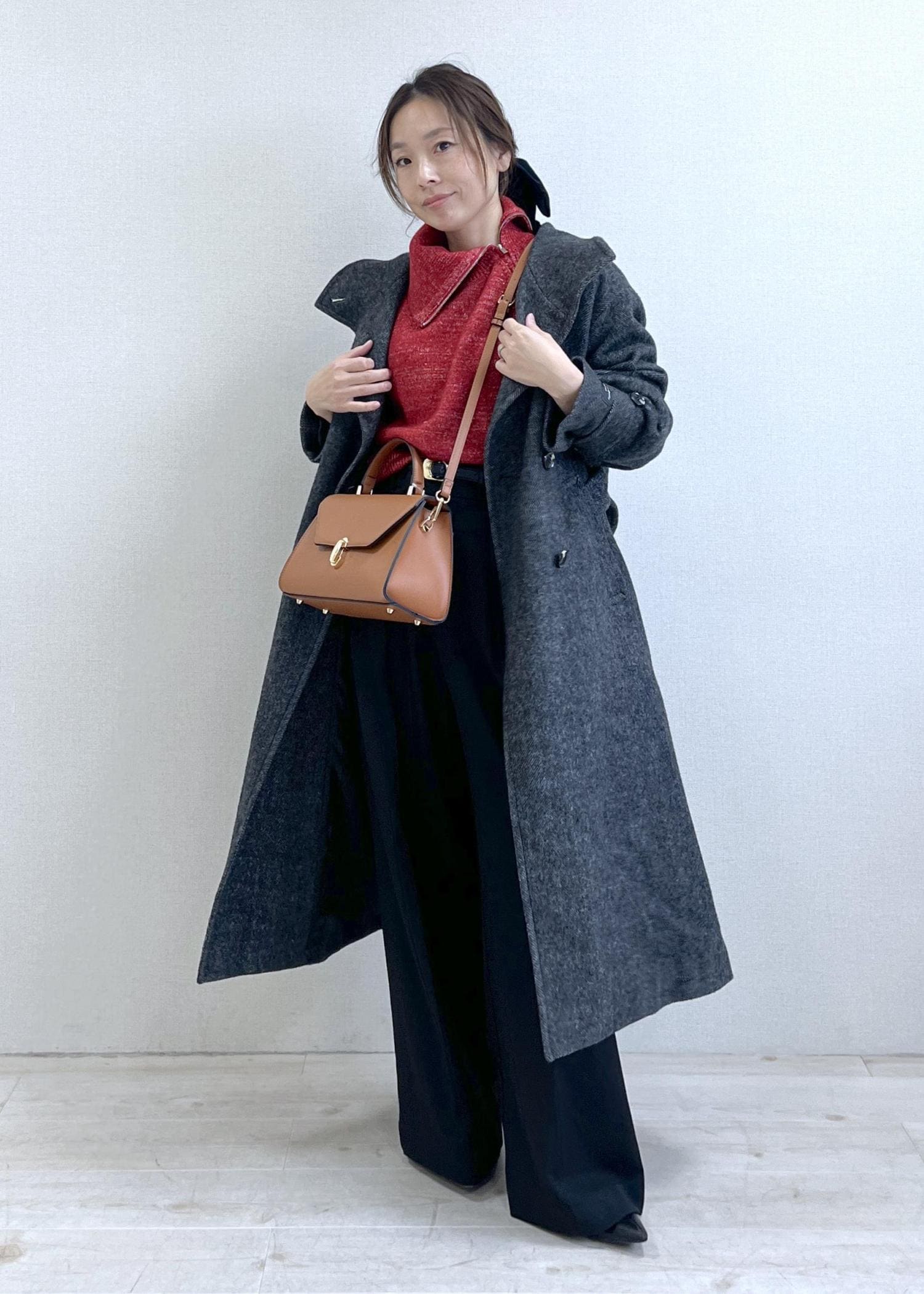 華やかな赤ニットを主役に、チャコールのロングコートで一気に洗練ムード。