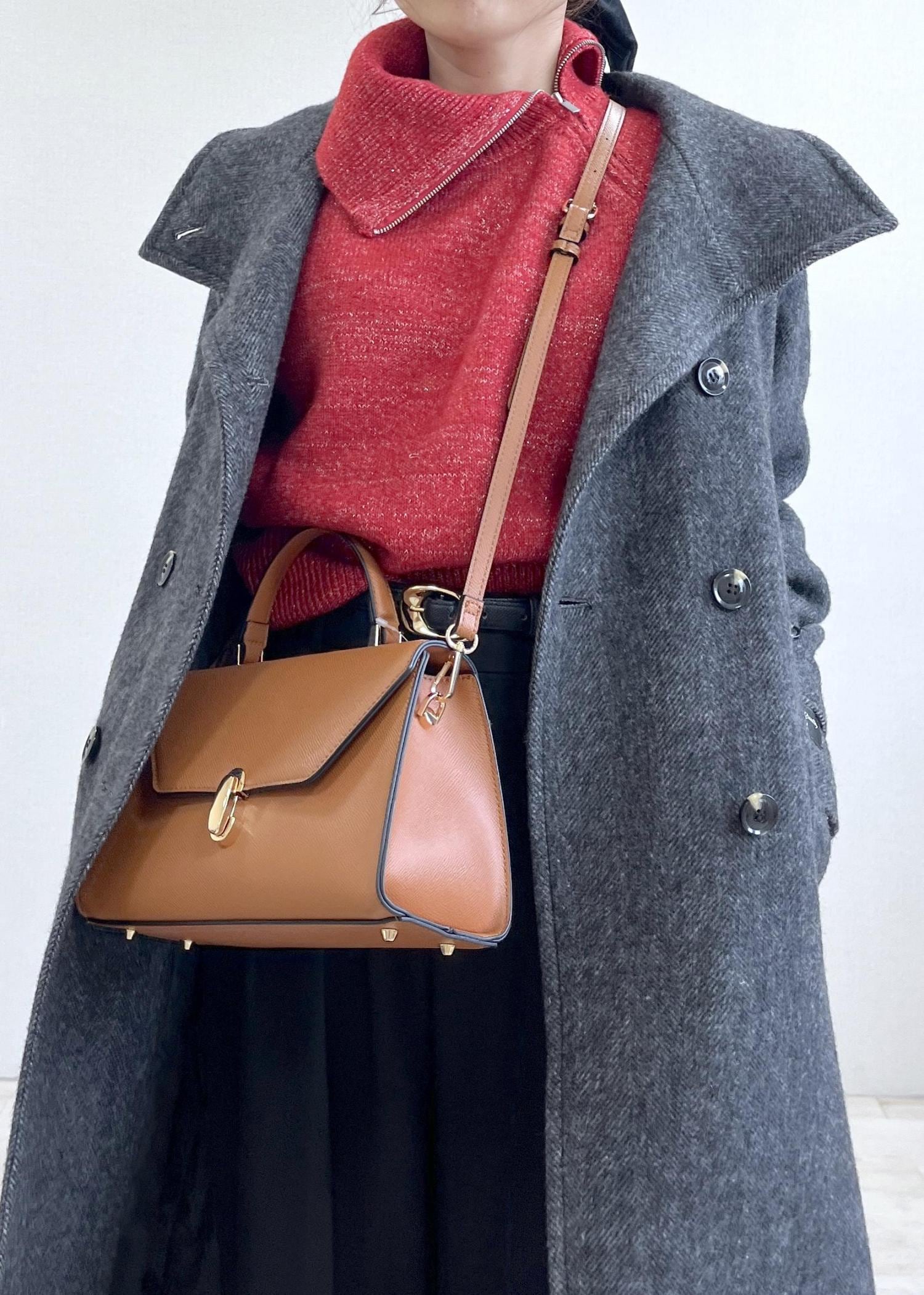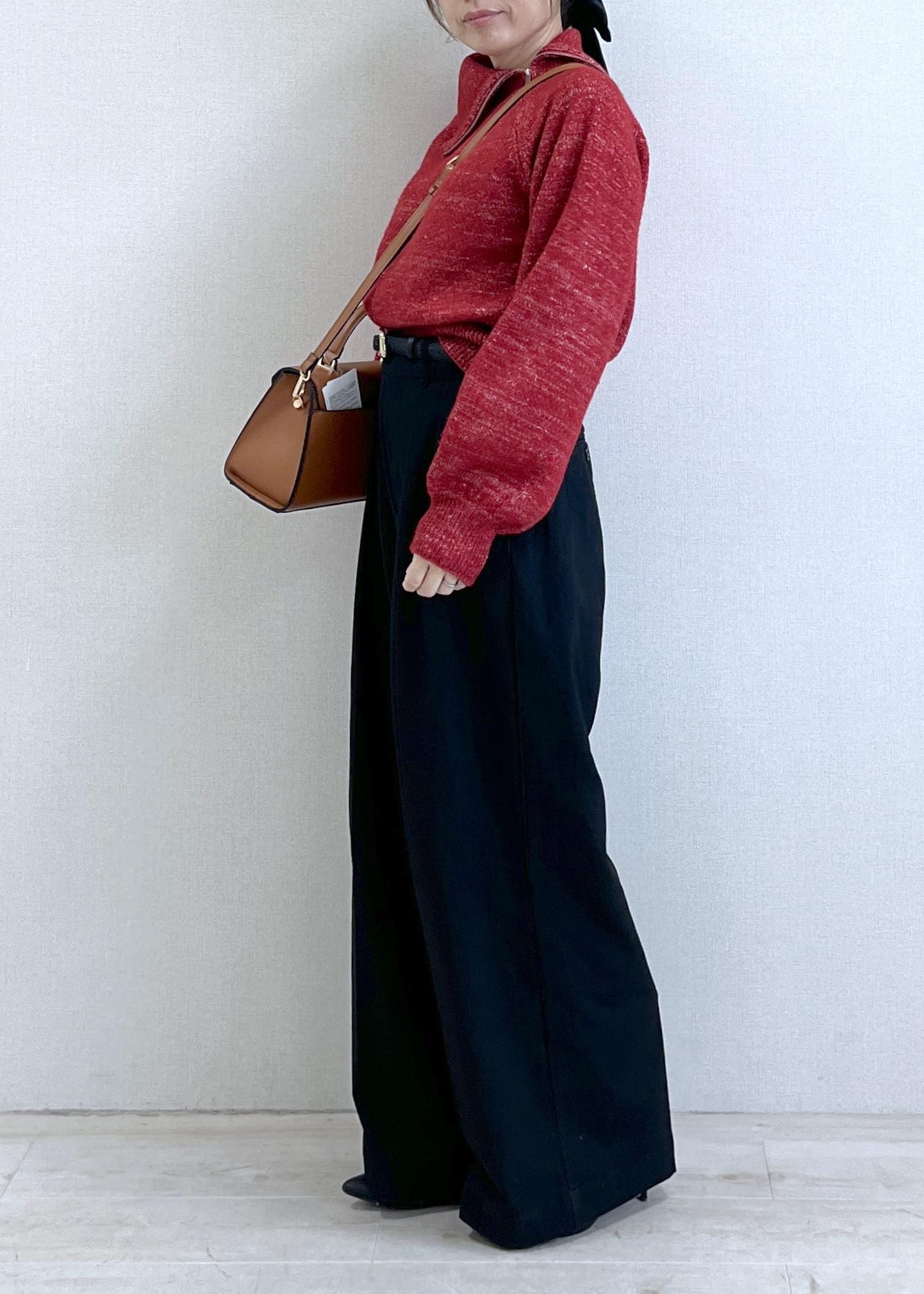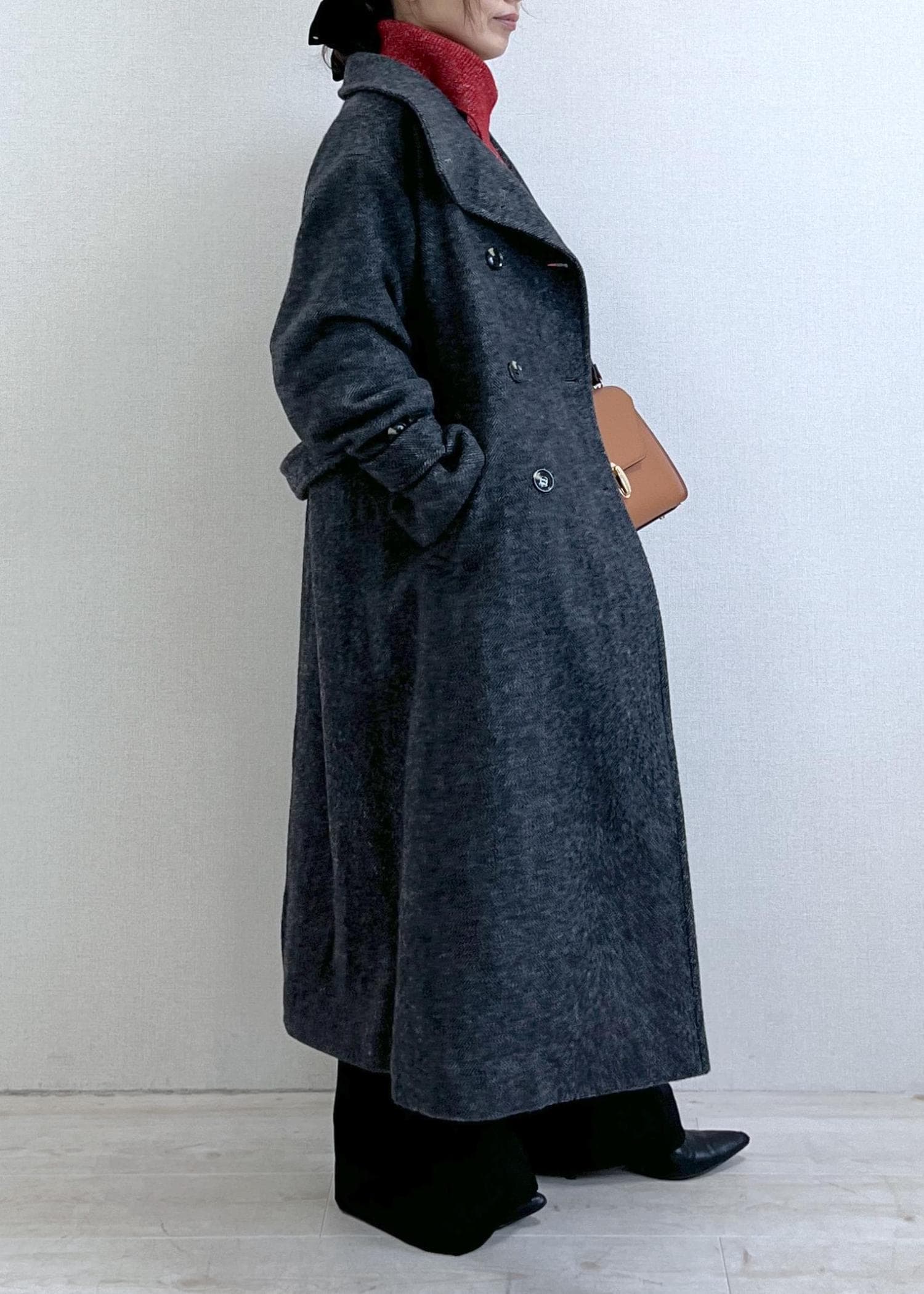 華やかな赤ニットを主役に、チャコールのロングコートで一気に洗練ムード。