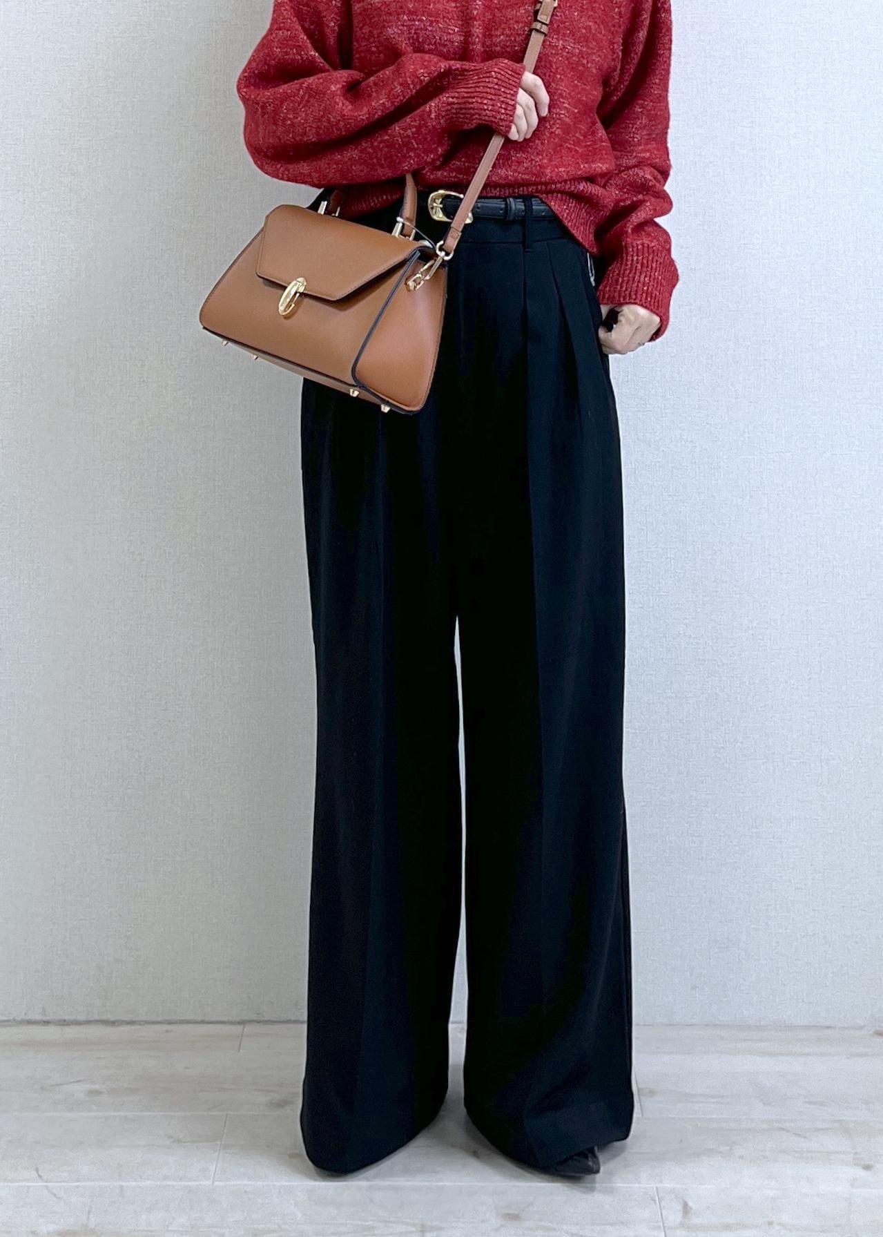 VISHot Beautyツータックワイドパンツ/イージーケアブラック / S¥6,589レビュー152cmでSサイズ着用し、着丈はペタンコ靴でも床につきませんでした。シルエットがとてもキレイなワイドパンツで、裏起毛しているので冬にピッタリのパンツです。タック入りなのでボリューム感はありますが、不思議と膨らまずストンっとキレイに落ちてくれました。骨ナチュさんにはぴったりなボリュームボトムです。