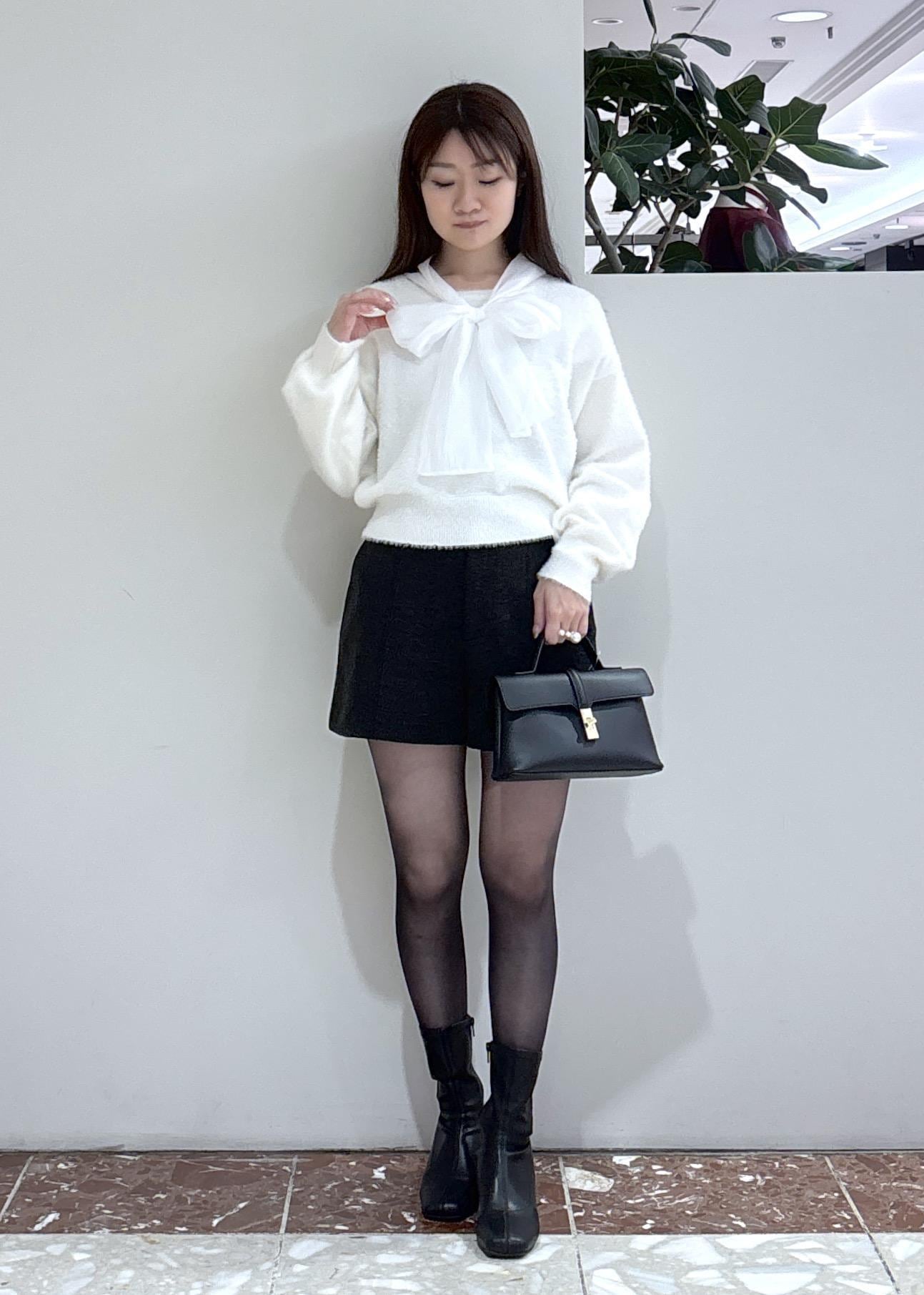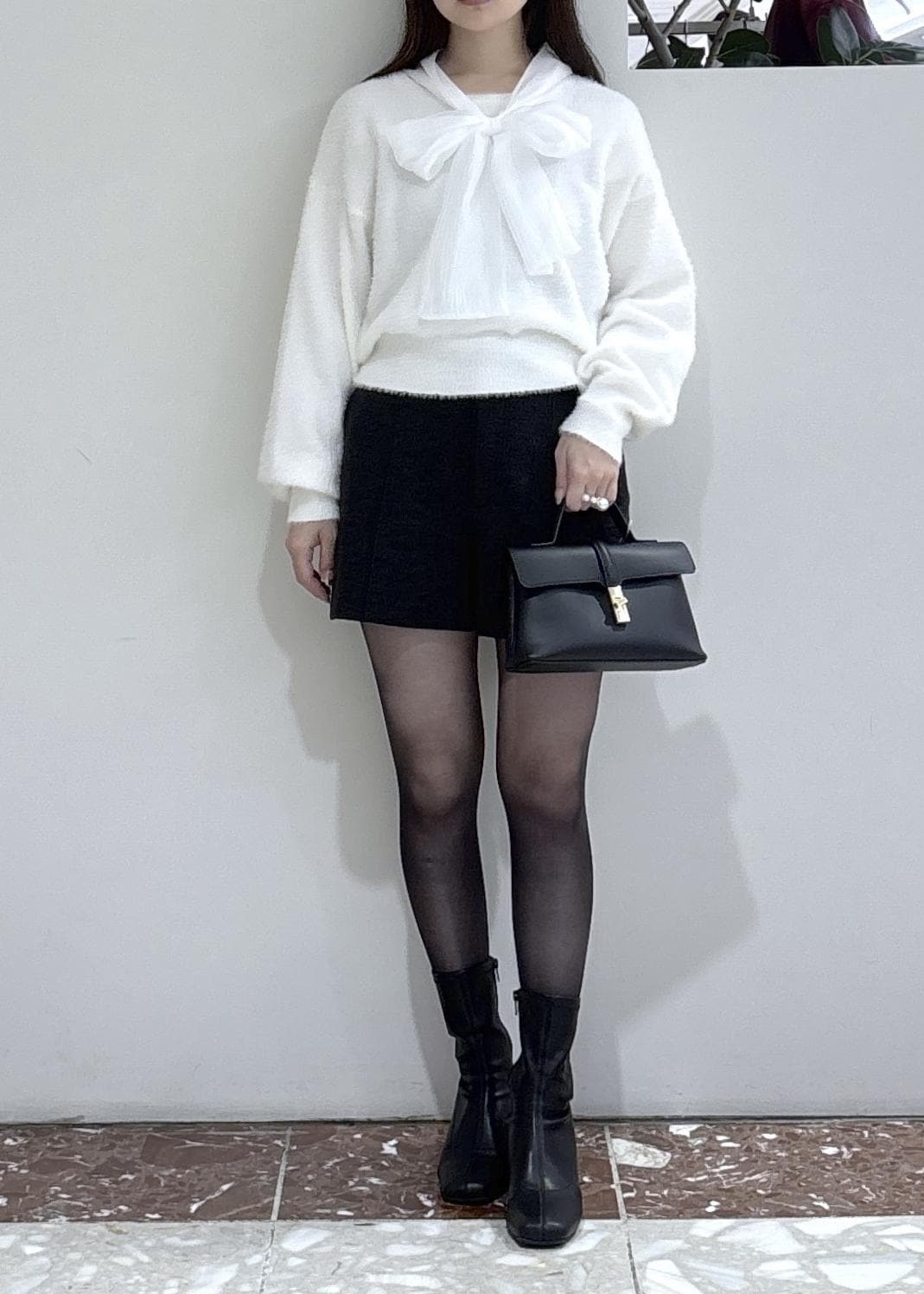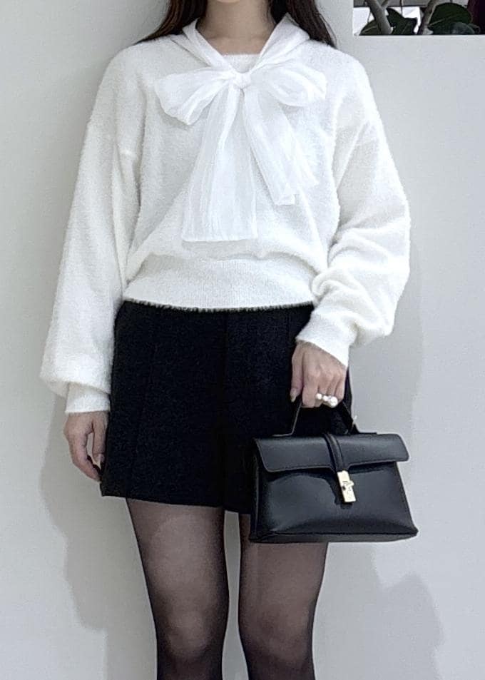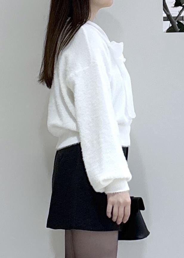 VISシアーボウタイリボン付きフェザーニットプルオーバー/2WAY・イージーケアオフホワイト / F¥6,589レビューとにかくなめらかなさわり心地で、シアーのボウタイがふわっと華やかな印象をプラスしてくれます◎