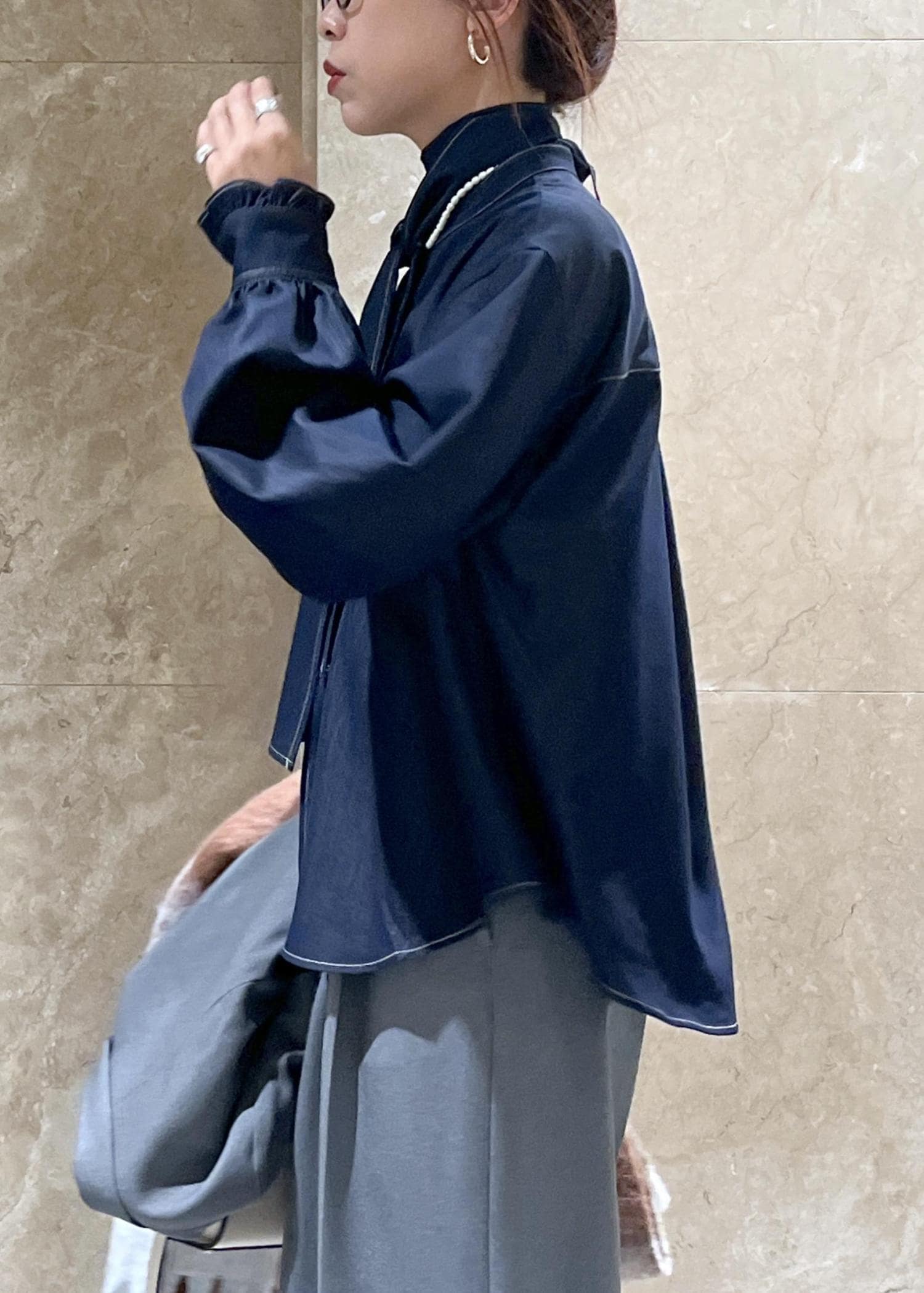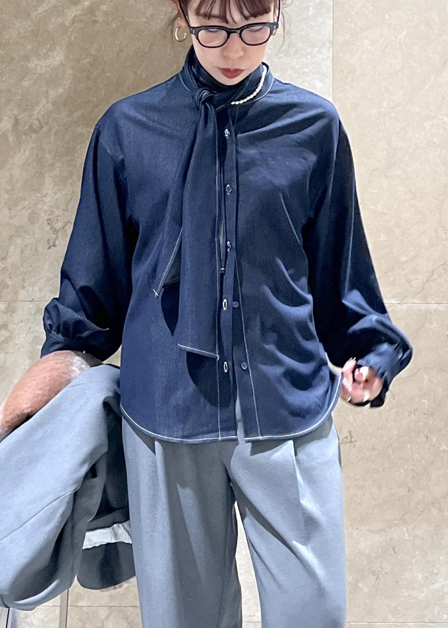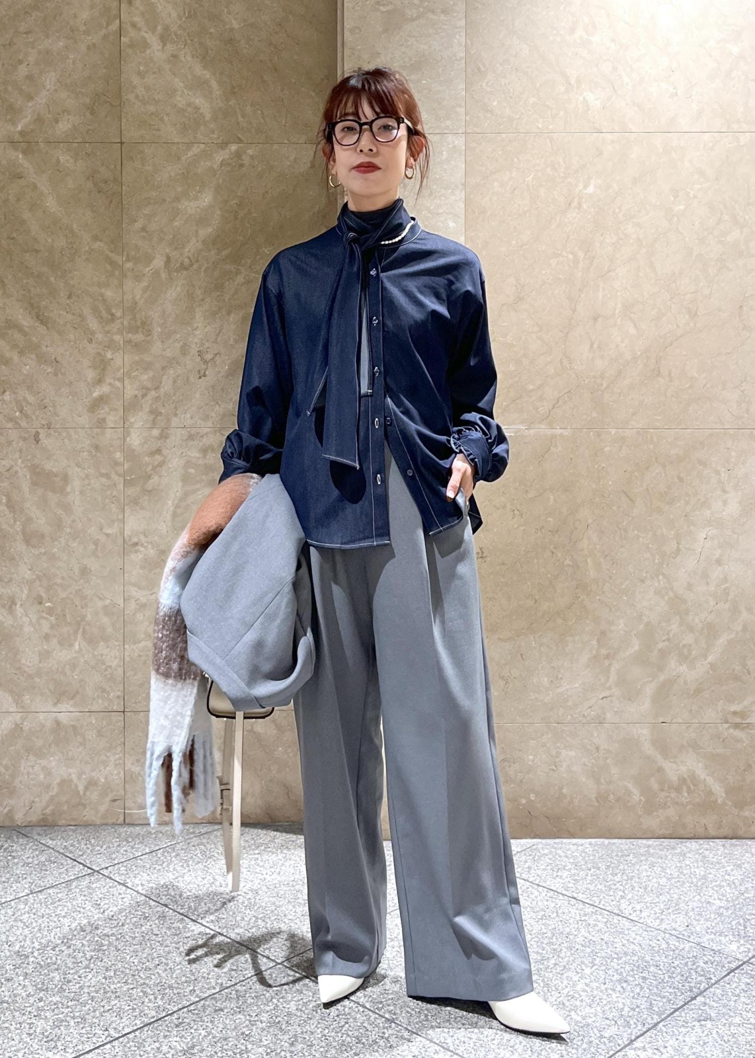 ボウタイのアレンジが効くデニムカラーのブラウス。