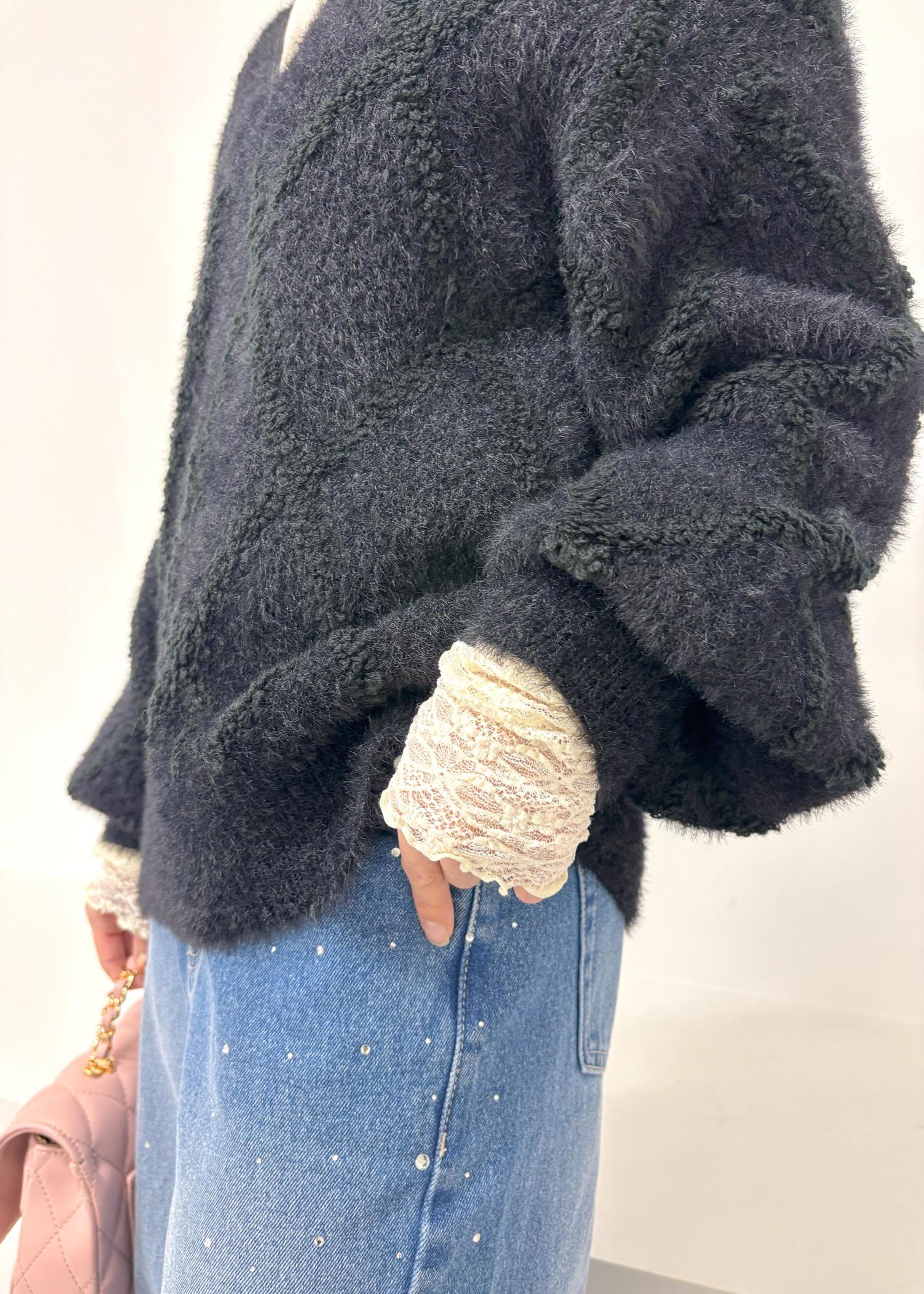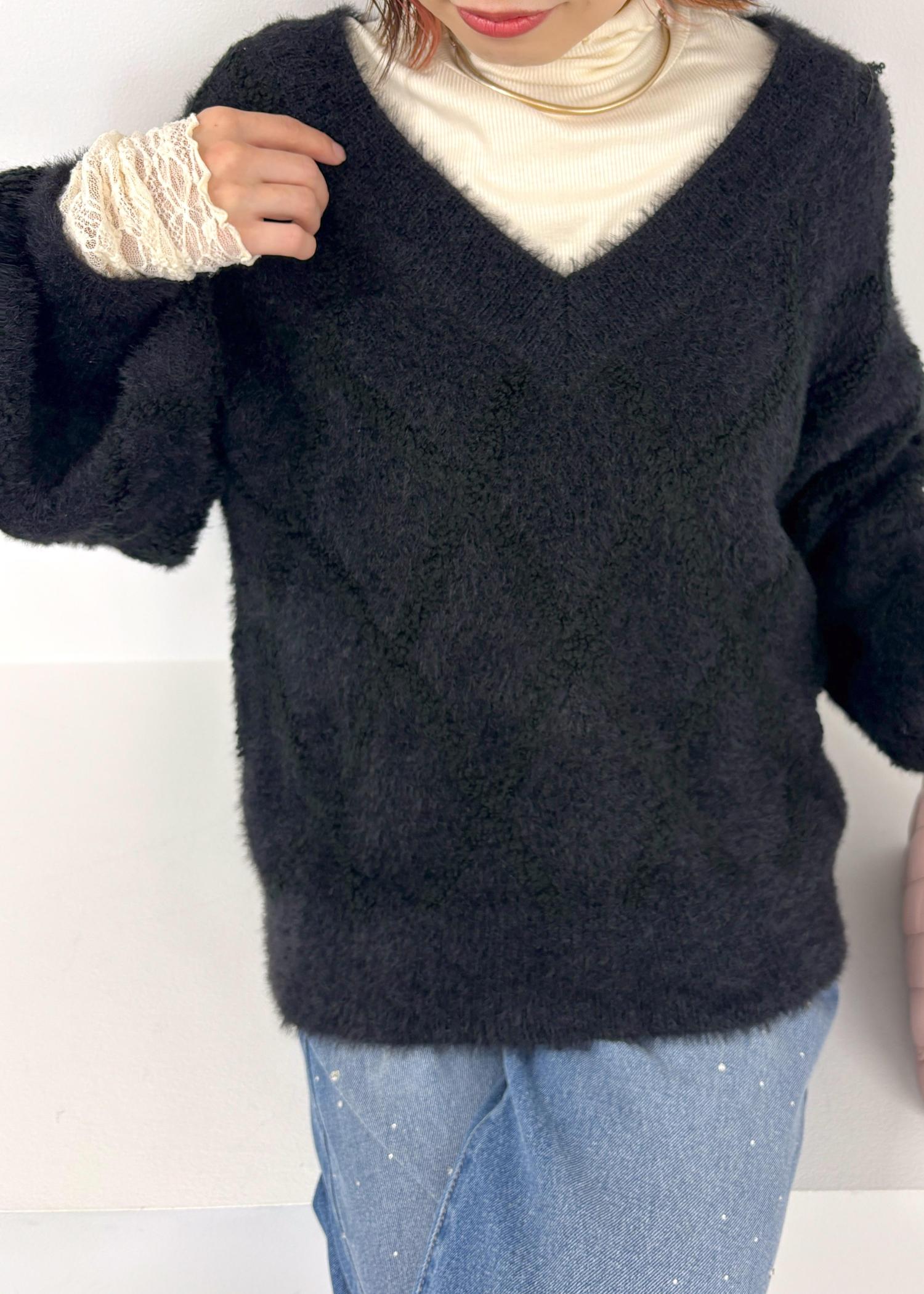 VISアーガイルフェザーニット/2WAY・イージーケアブラック / F¥6,589レビュー緩やかVネックがスッキリ見えするニット♪さりげないアーガイル柄が今年らしく、大人可愛いデザイン。チクチク感を感じにくい素材で着やすい◎お袖のぽわんとしたフォルムも女性らしい印象。全体的にゆったりめ、着丈は腰が隠れる長さでした。