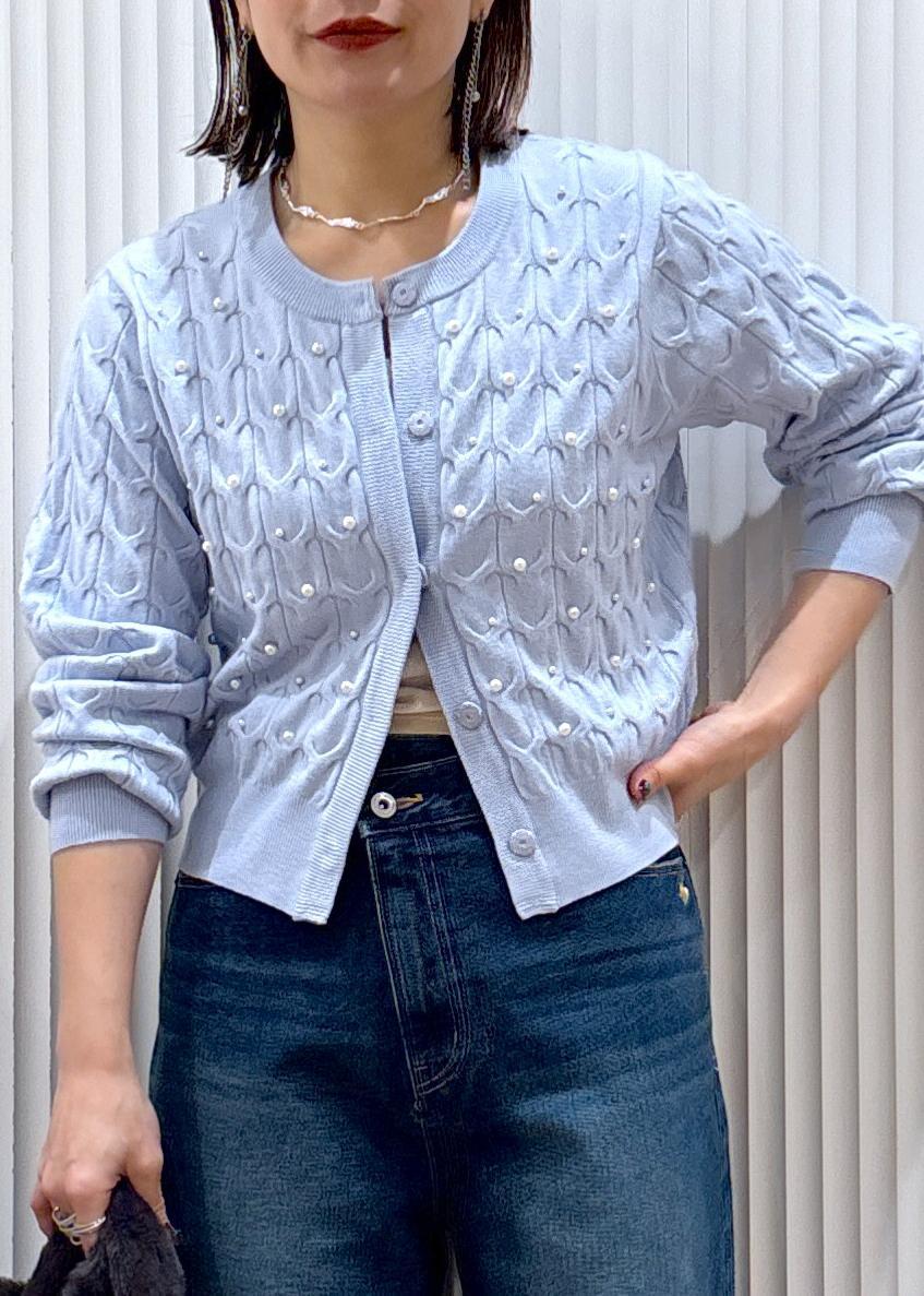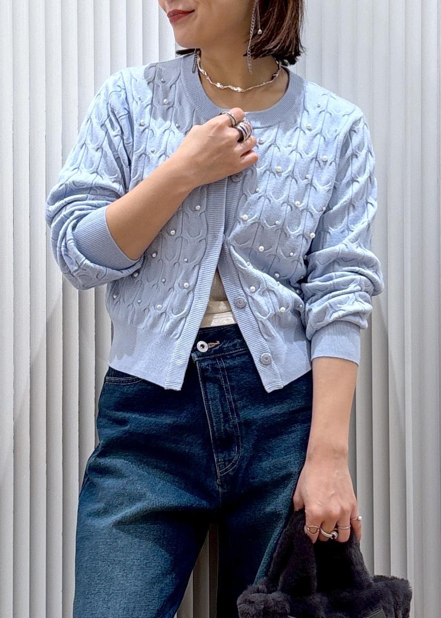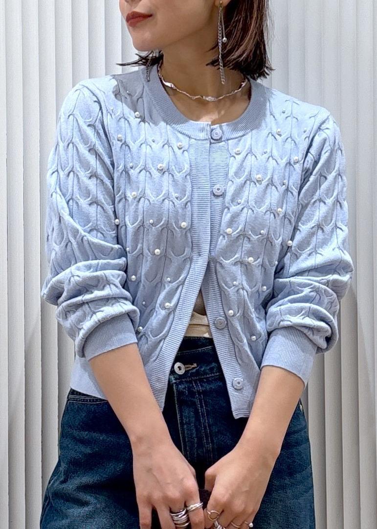 ミニケーブル編みのニットにパールがついた甘めカーディガン♡