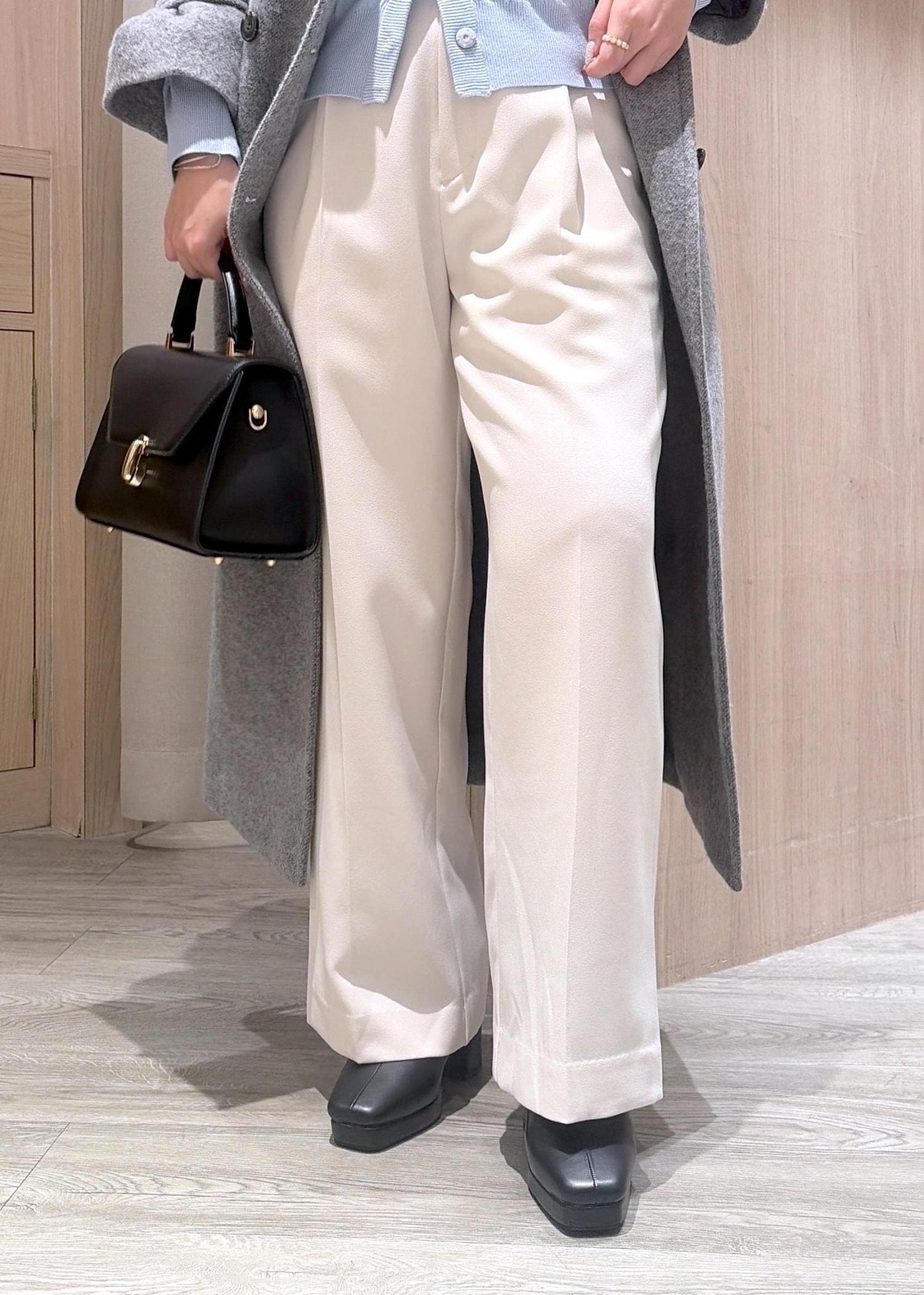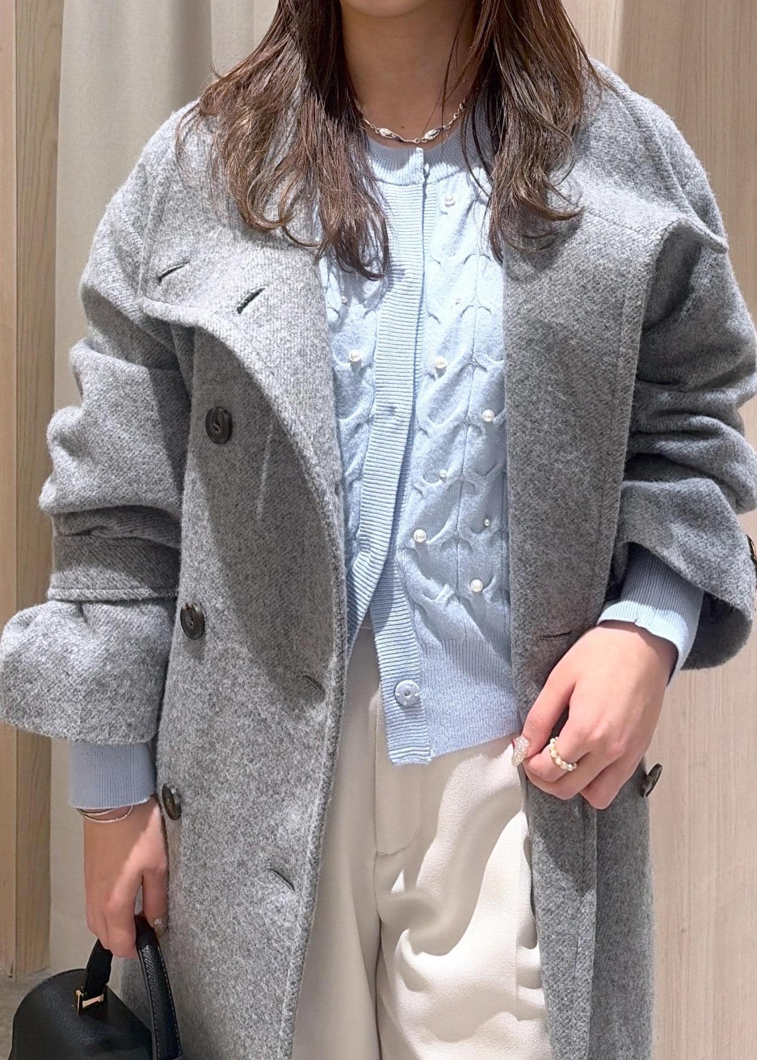 パール付きのカーディガン+ホワイトのパンツでコートを脱いでも華やかなキレイめコーデにしました♪