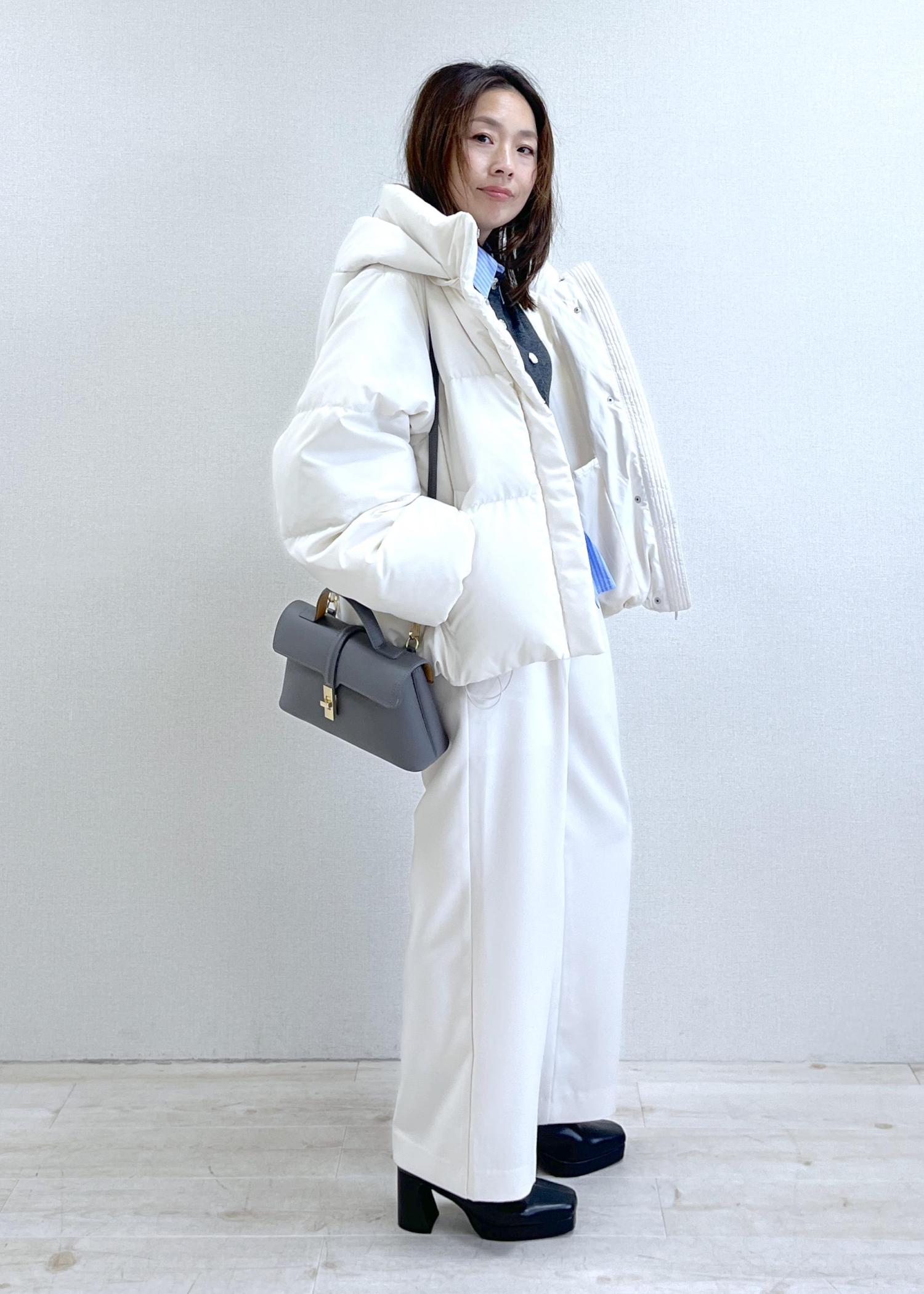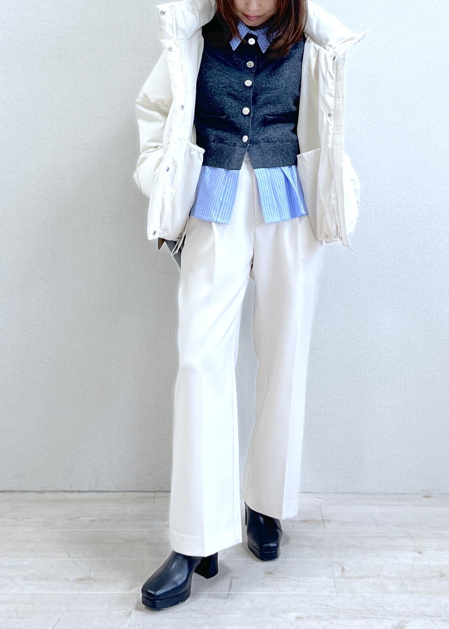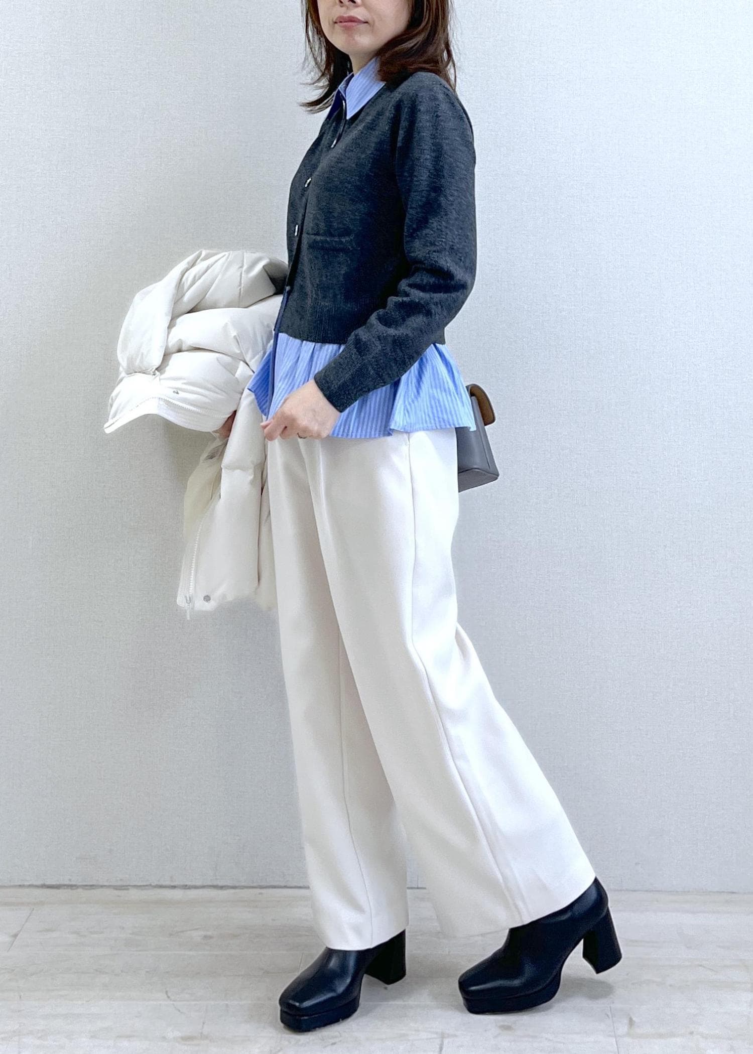 白ダウンにドッキングシャツニット×ワイドパンツで、