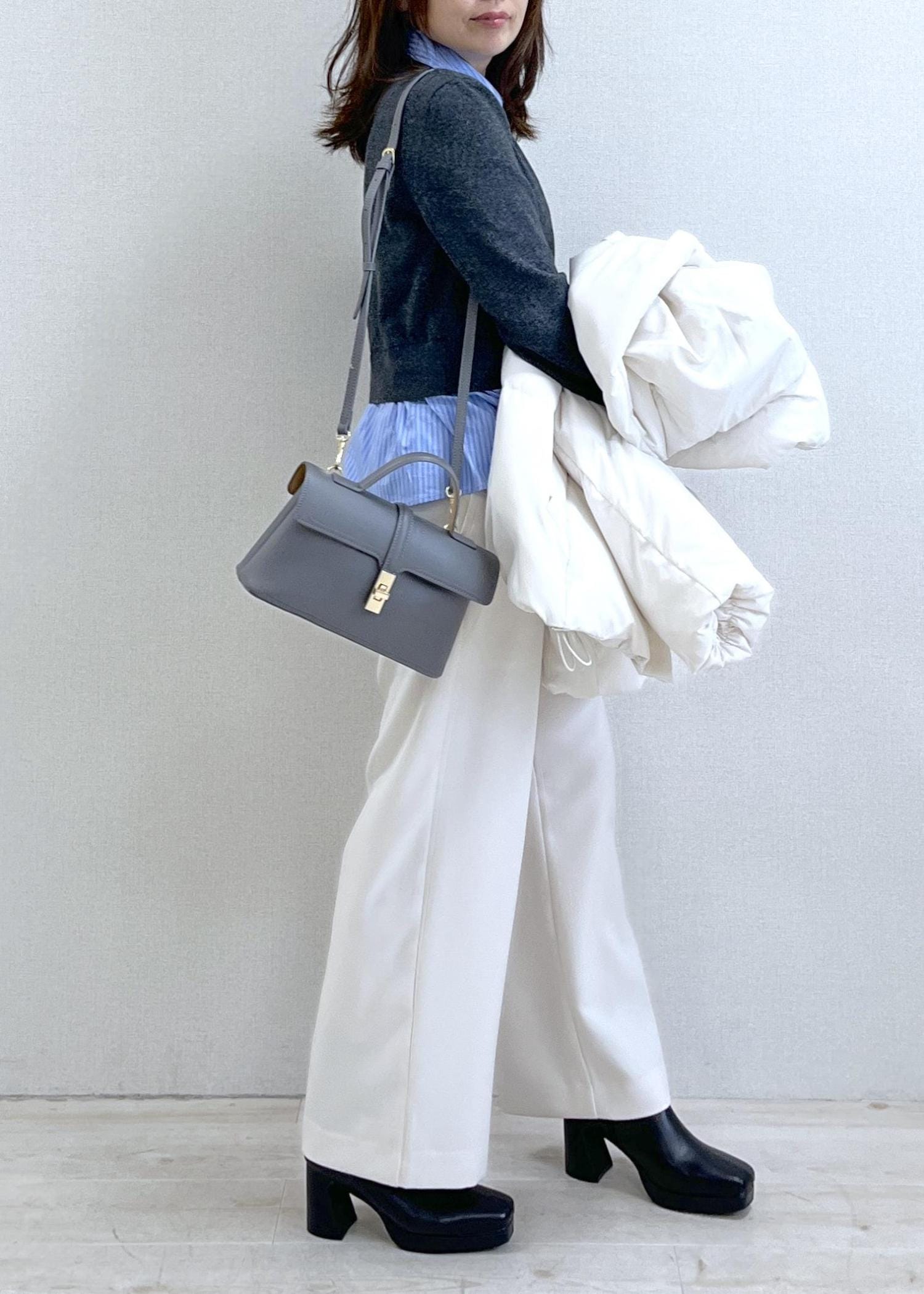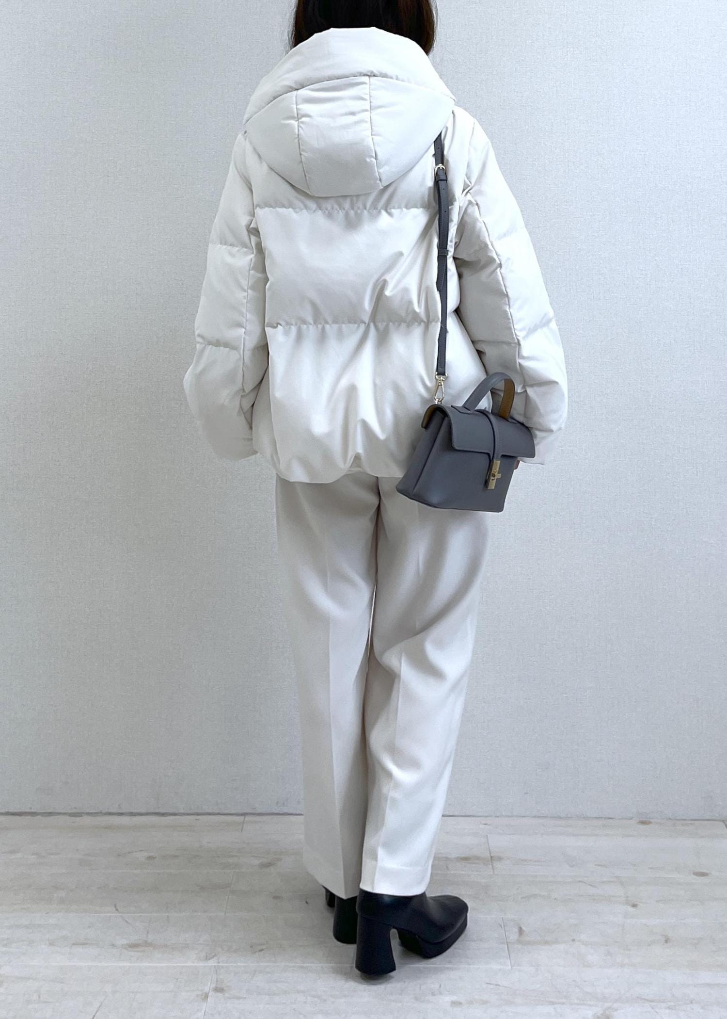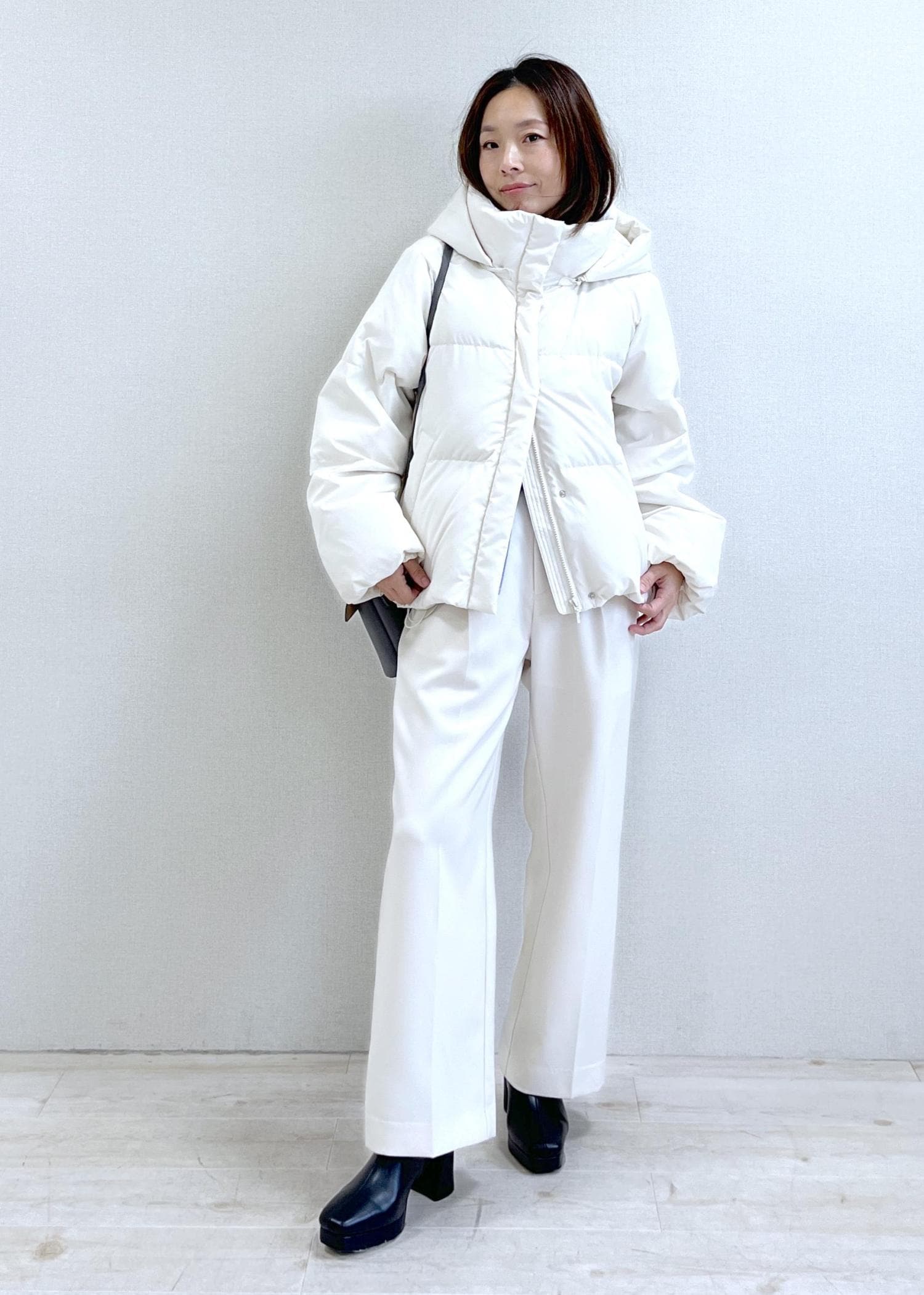 白ダウンにドッキングシャツニット×ワイドパンツで、