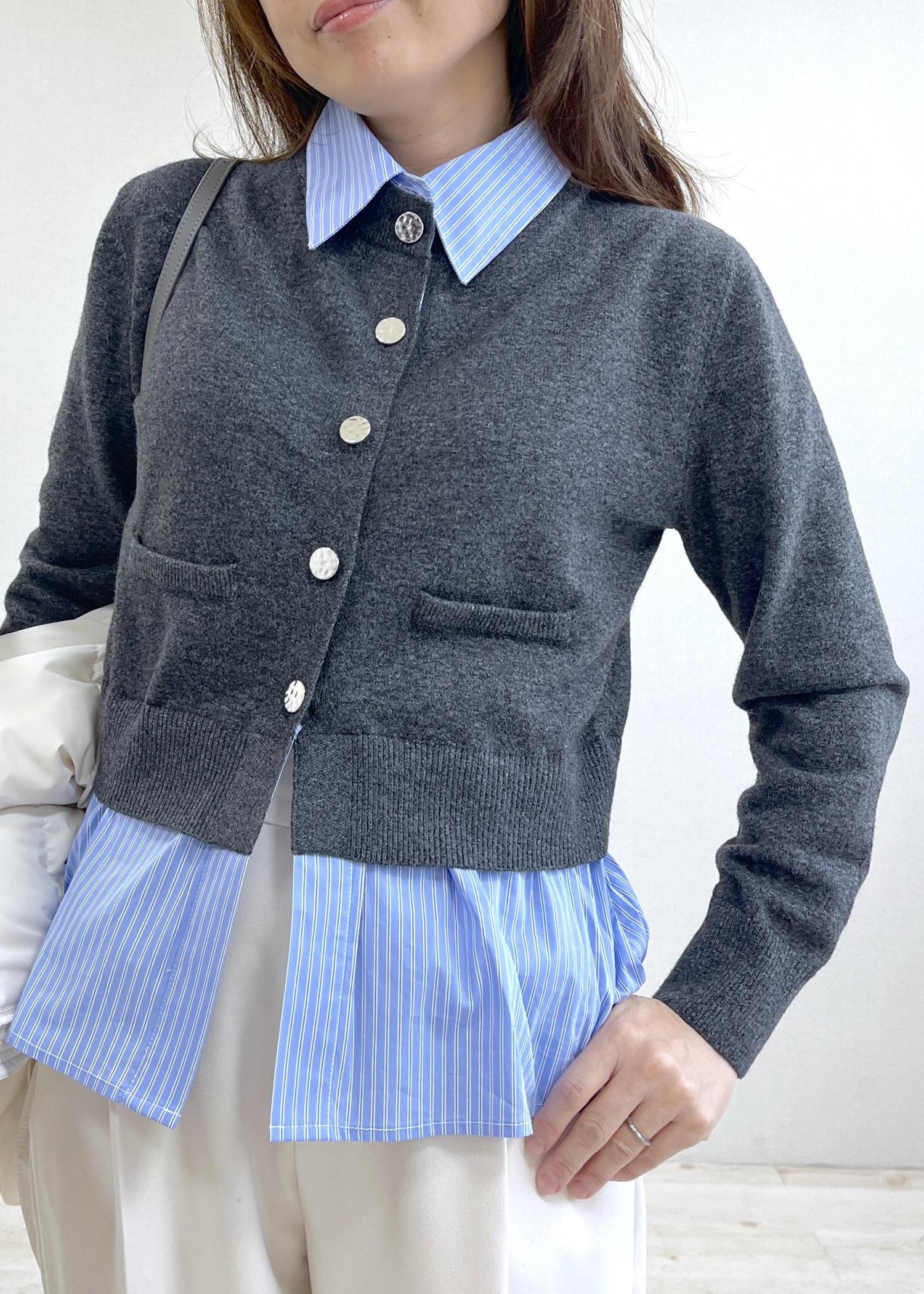 152cmでFサイズ着用し、着丈は腰に少しかかるくらいの長すぎない丈。すっきりシルエットで、シャツがドッキングされたデザインなので着るだけでコーディネートが完成してくれます!時短アイテムなのにスタイルUPもしてくれ、しっかりキレイ見えに。厚手すぎないニット素材なので早めの時期からお召しいただけますよ!