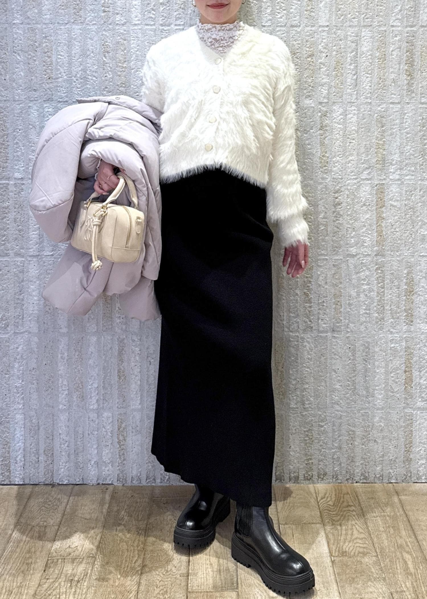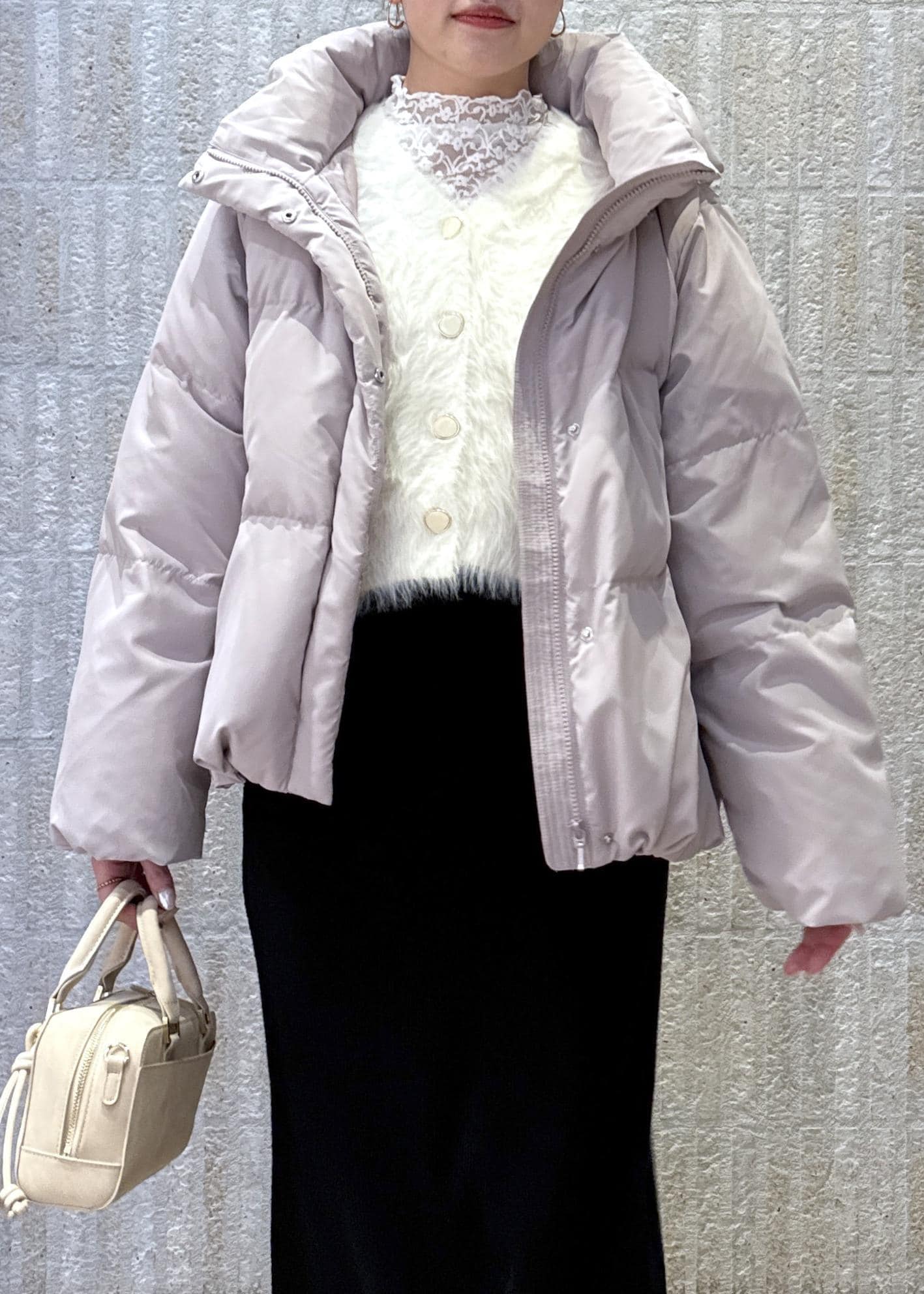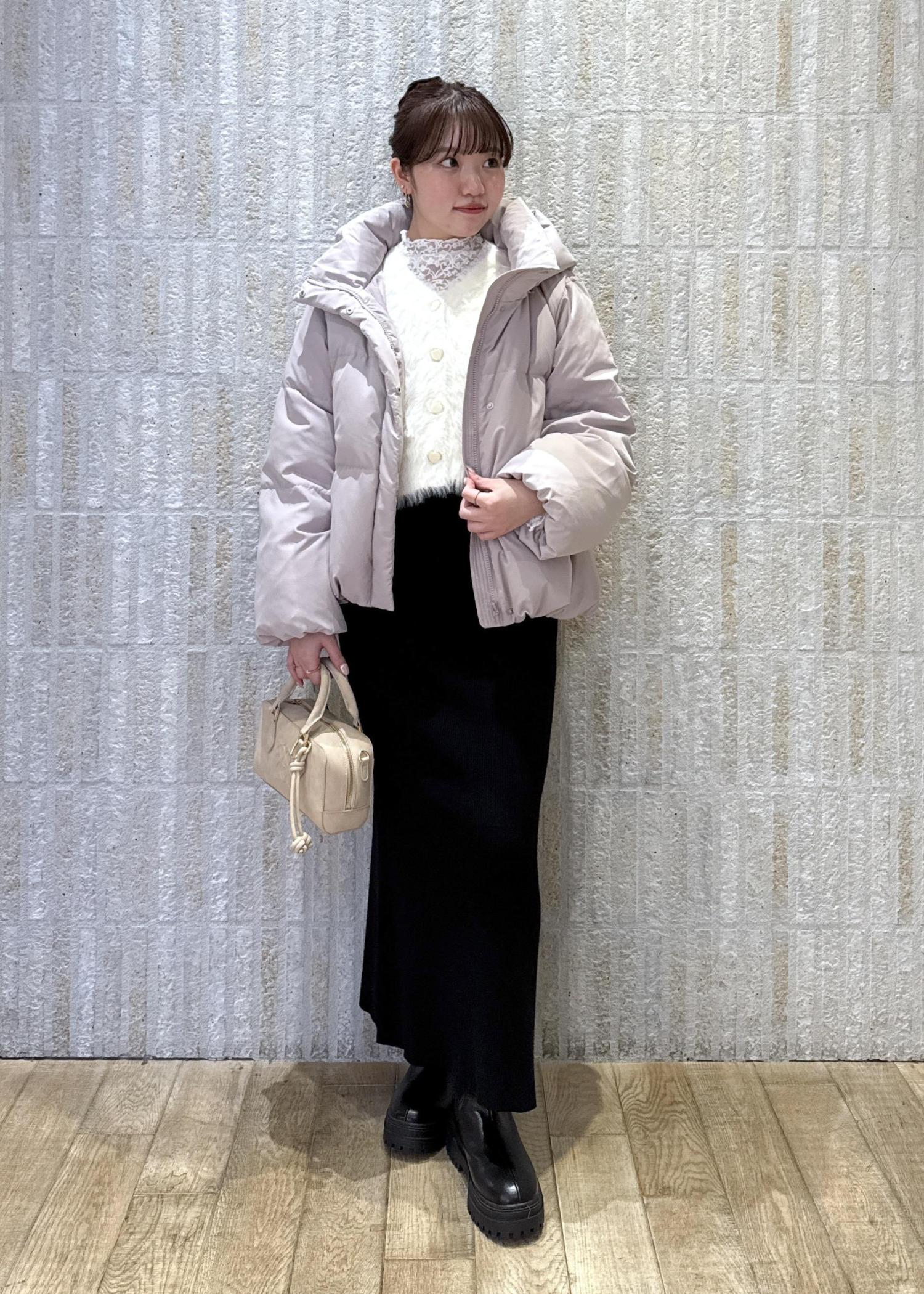 ダウン80%のしっかり温かみのあるダウンブルゾンをメインに、冬らしいフェザーのカーディガンやスカートを合わせて、デートやお出かけにおすすめ◎