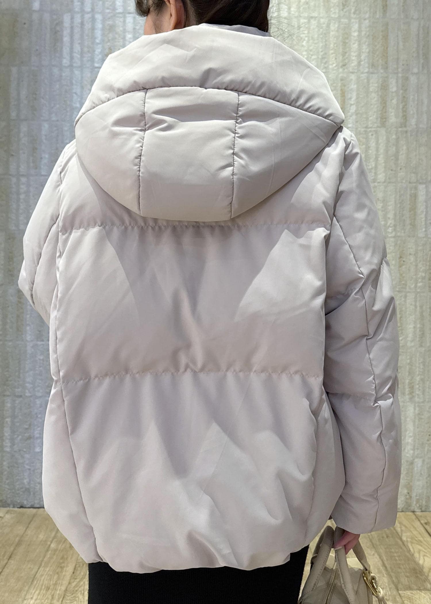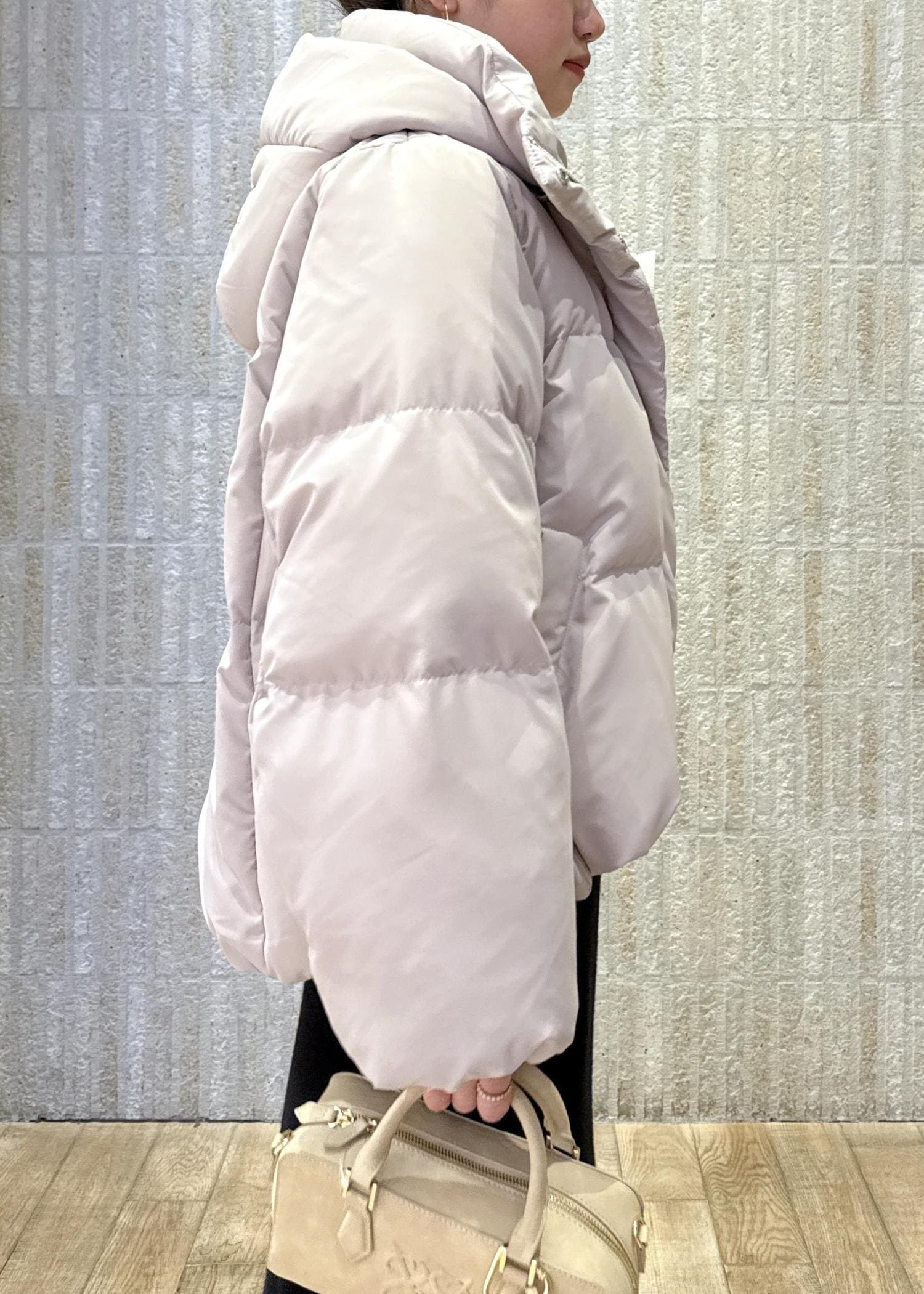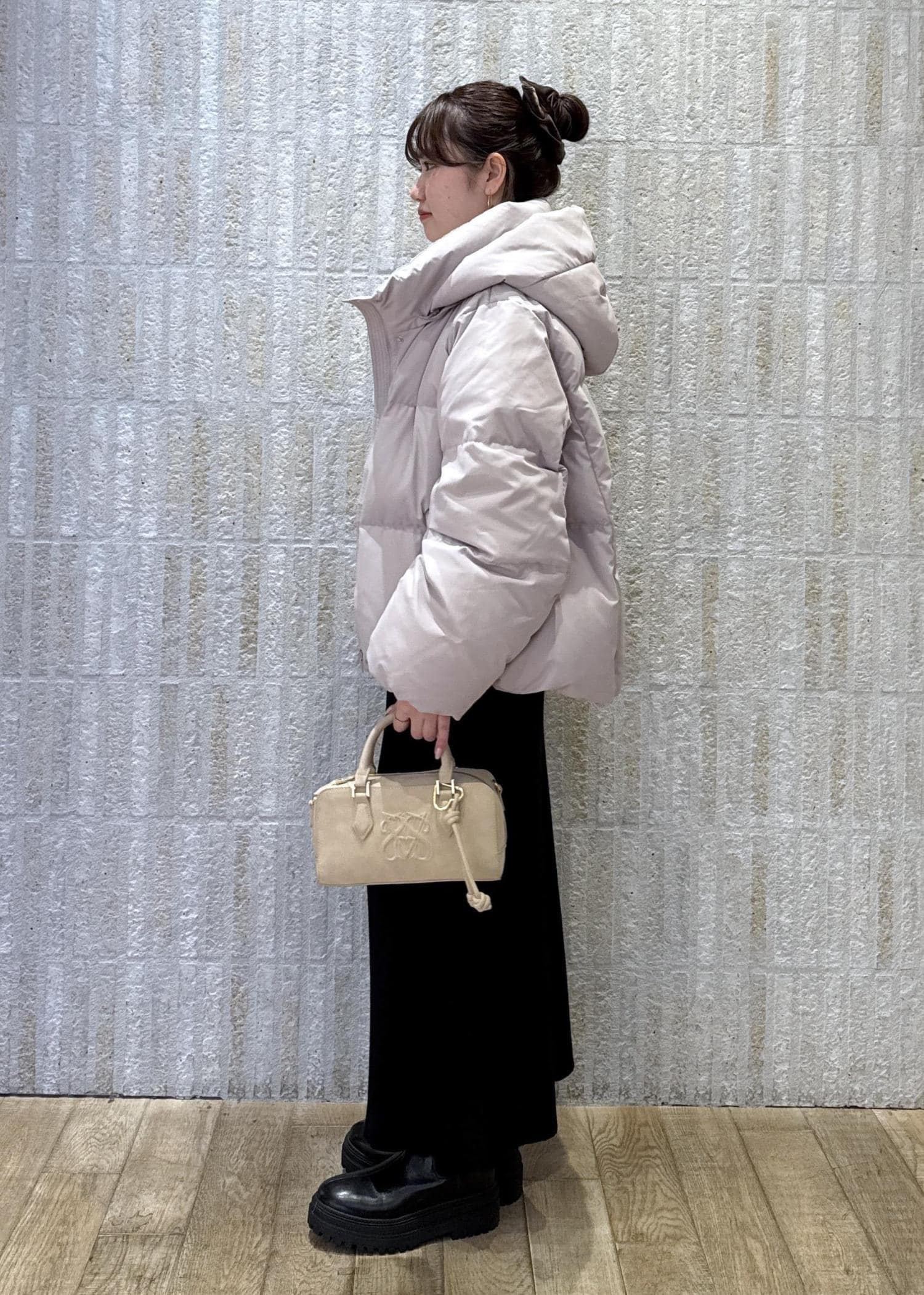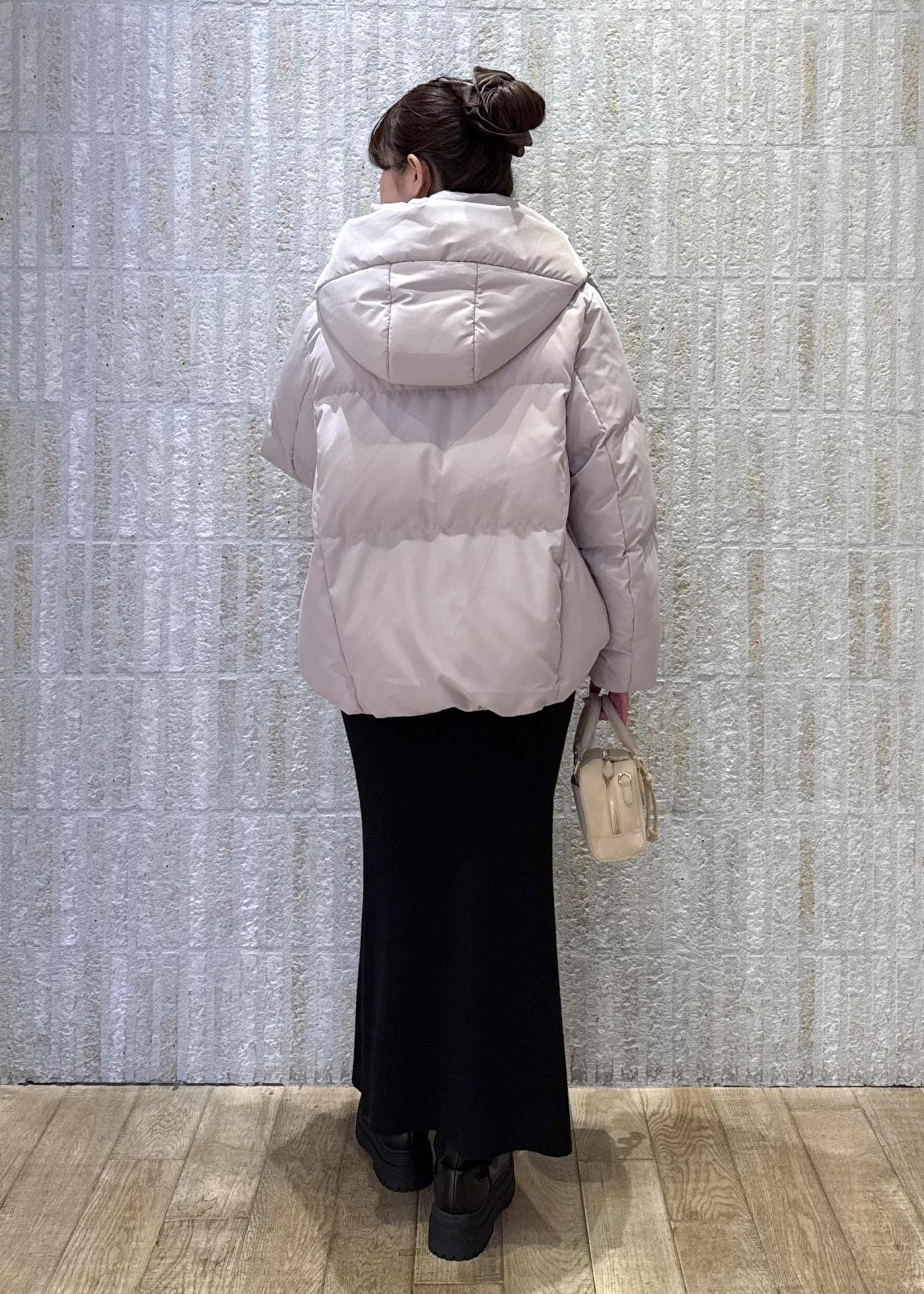 ダウン80%のしっかり温かみのあるダウンブルゾンをメインに、冬らしいフェザーのカーディガンやスカートを合わせて、デートやお出かけにおすすめ◎