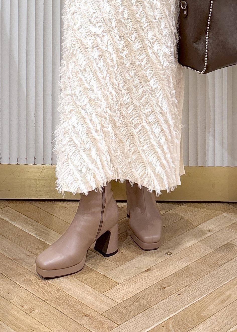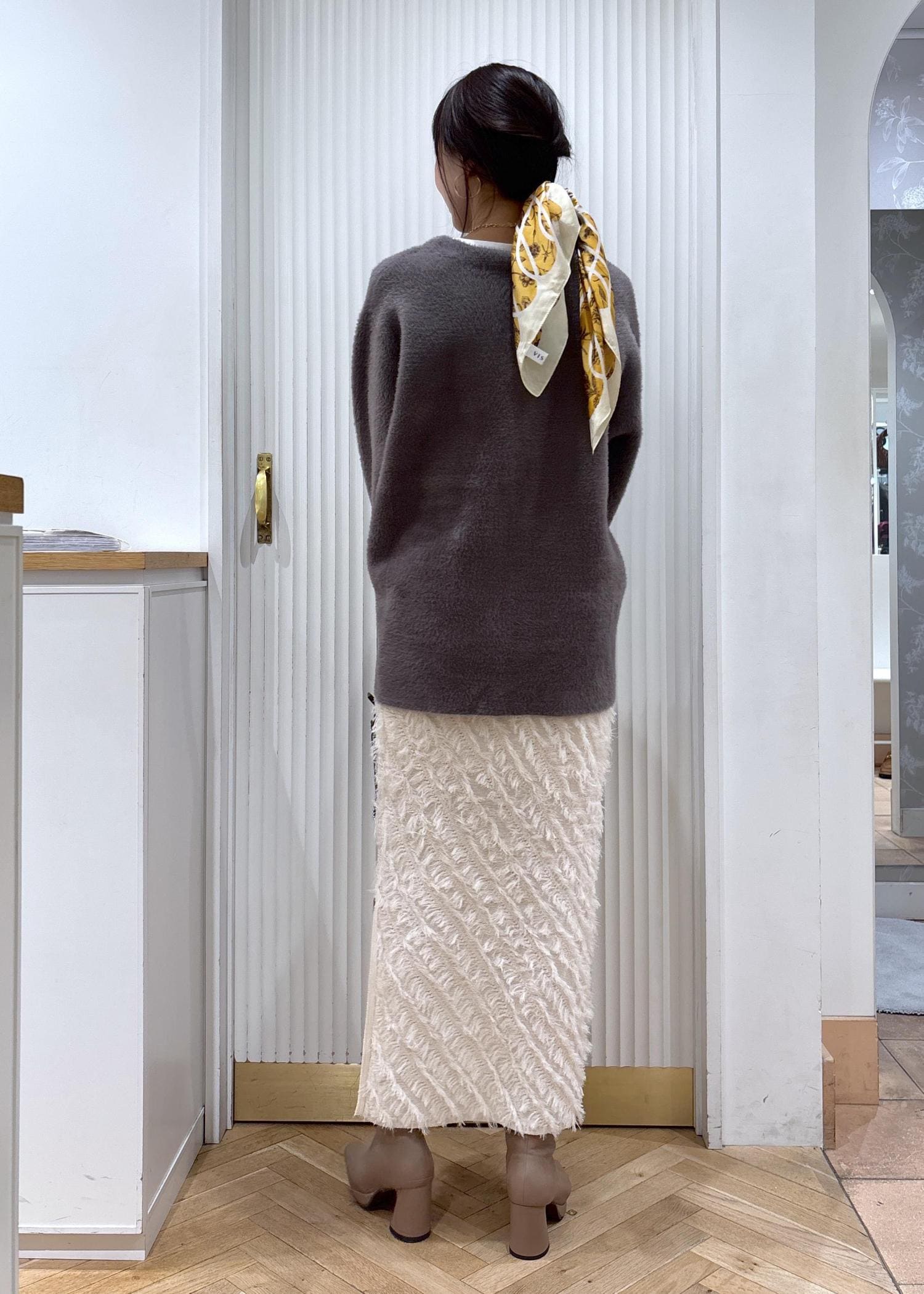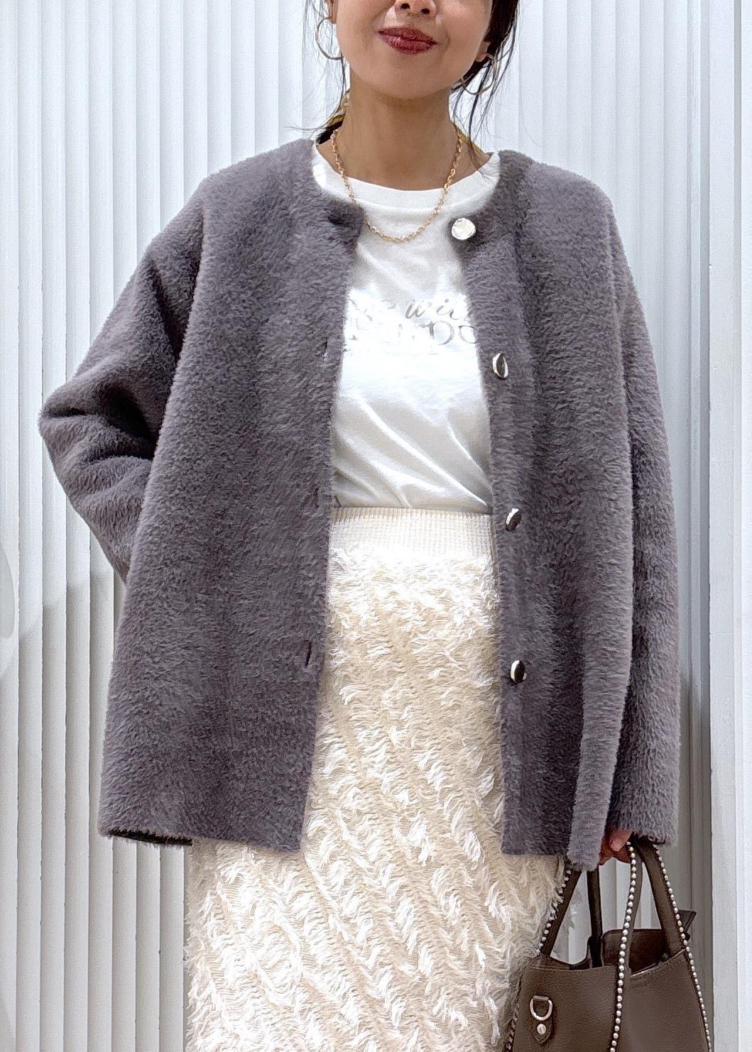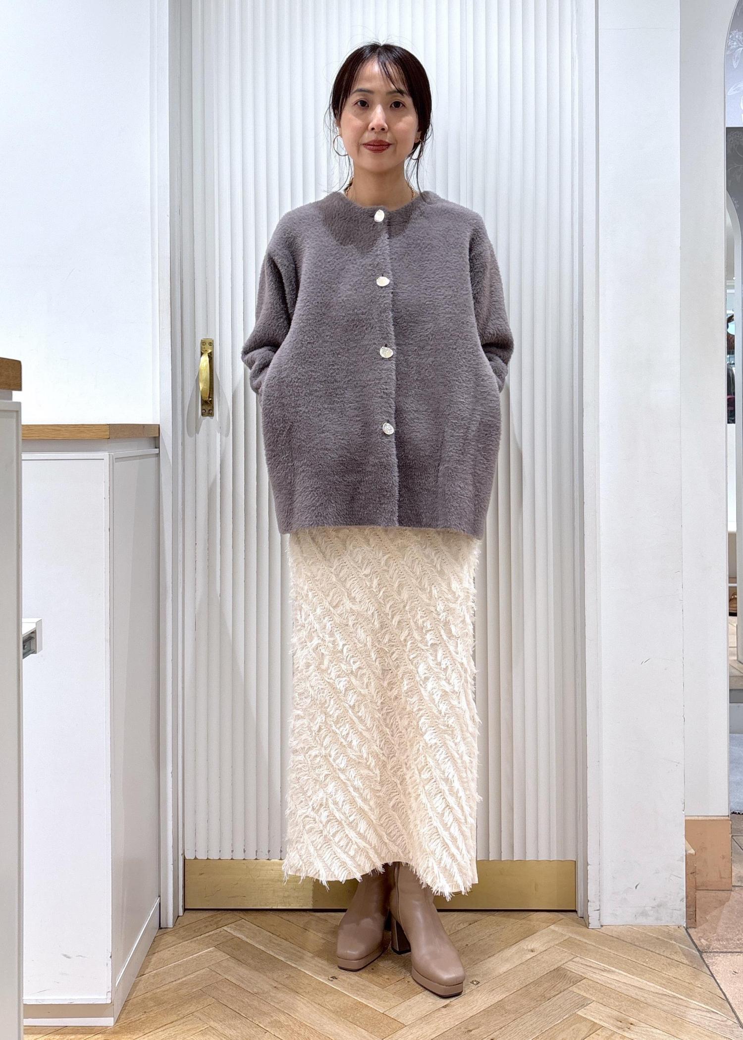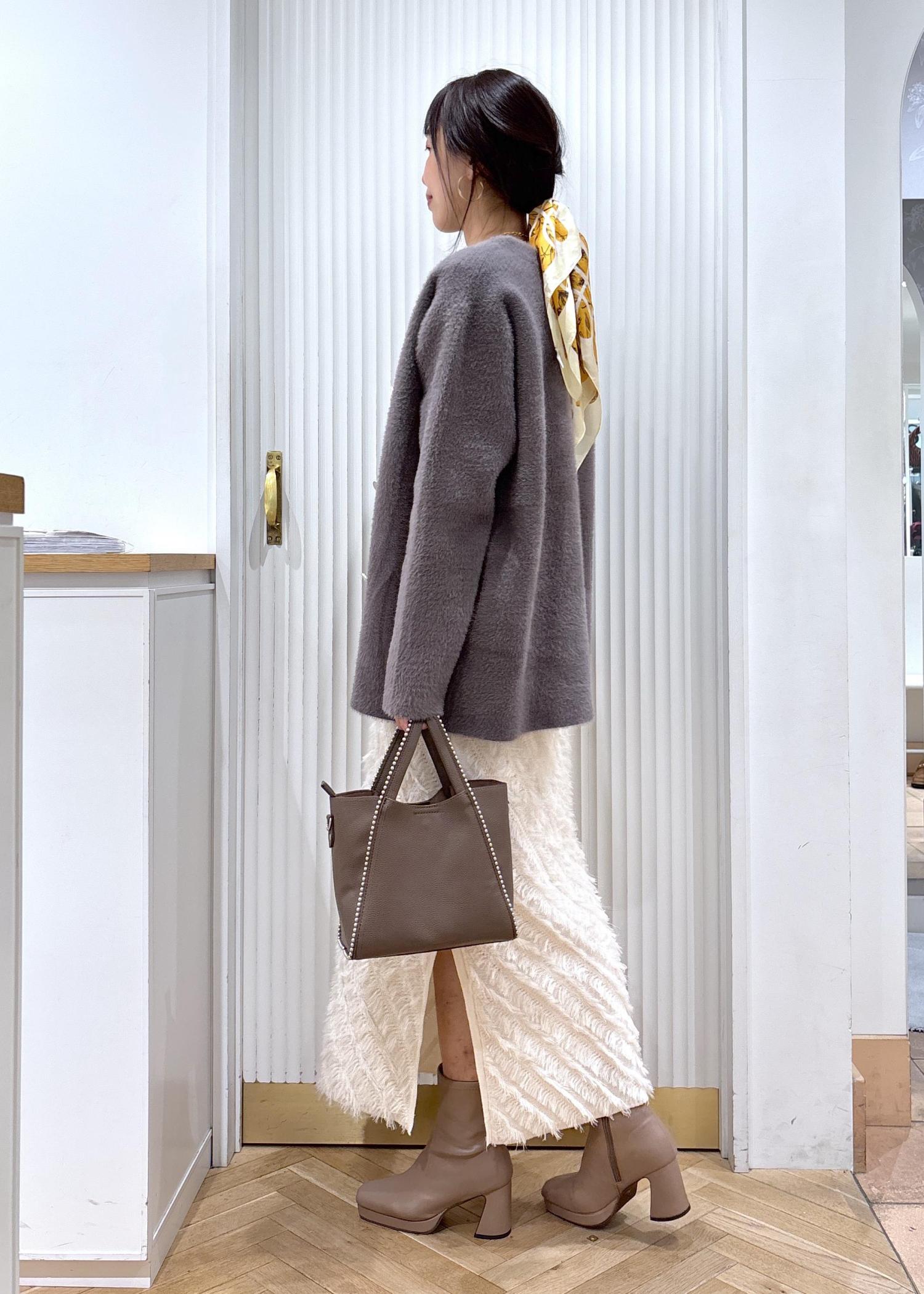 ファーコートにフリンジスカートを合わせた、大人カジュアルスタイリングです。