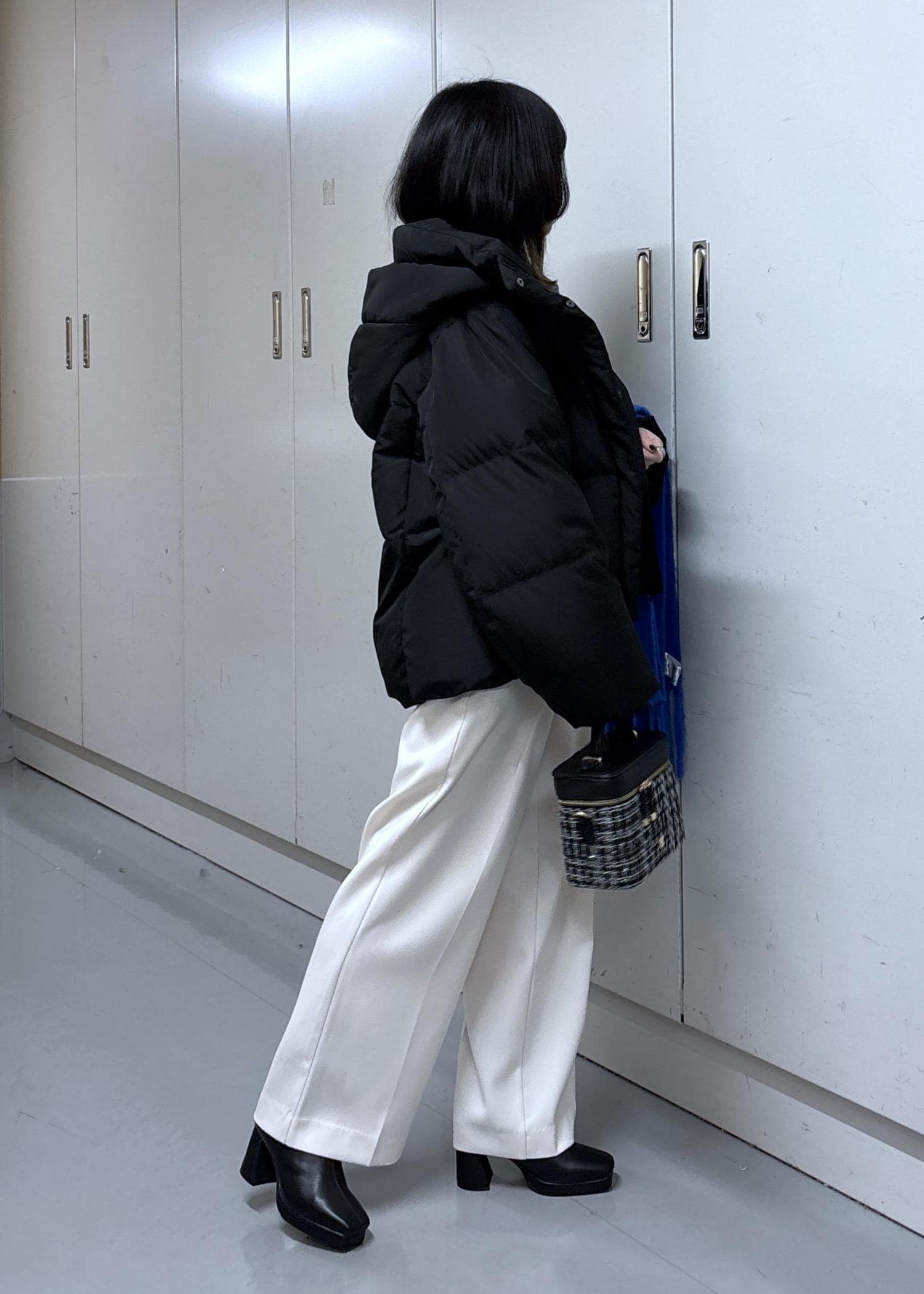 アウターを黒にしたい私は普段ならボトムも黒系ですが、珍しくホワイトボトムで合わせてみました!