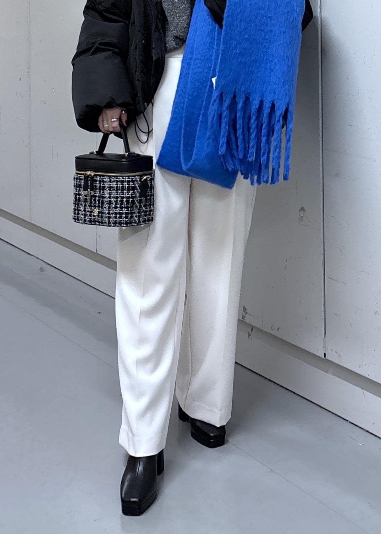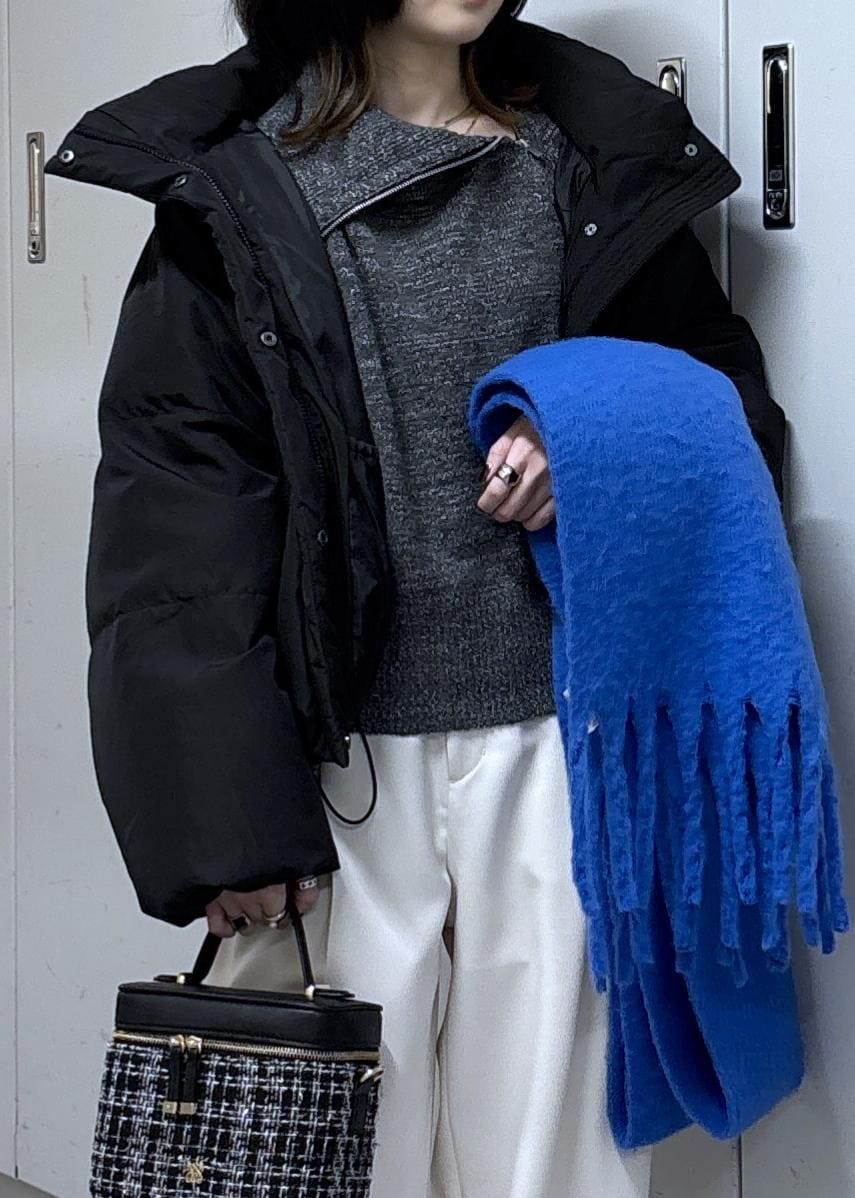 モノトーンコーデに映える鮮やかブルーのマフラーで、寒さ対策もばっちりです♩
