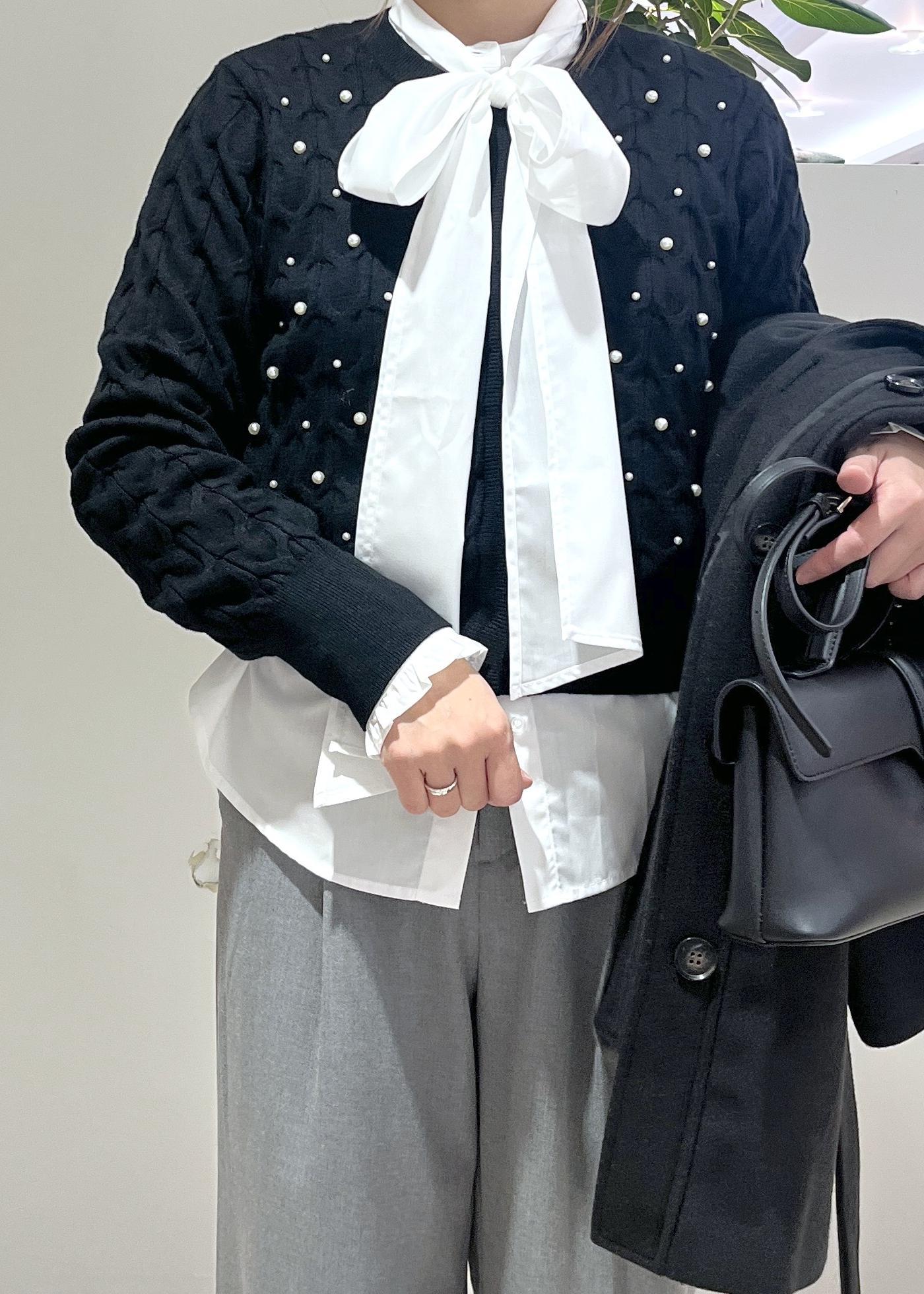 VISパールケーブルカーディガンブラック / F¥6,589レビュー157cm腰くらいの長さで着られました。パールが散りばめられ華やかな印象です。身幅はゆるっとしてい