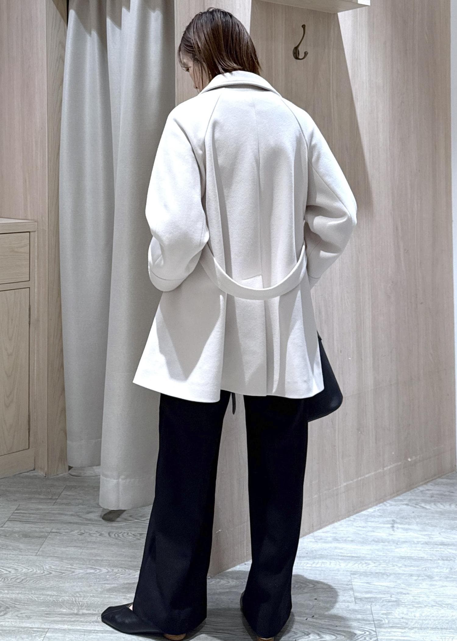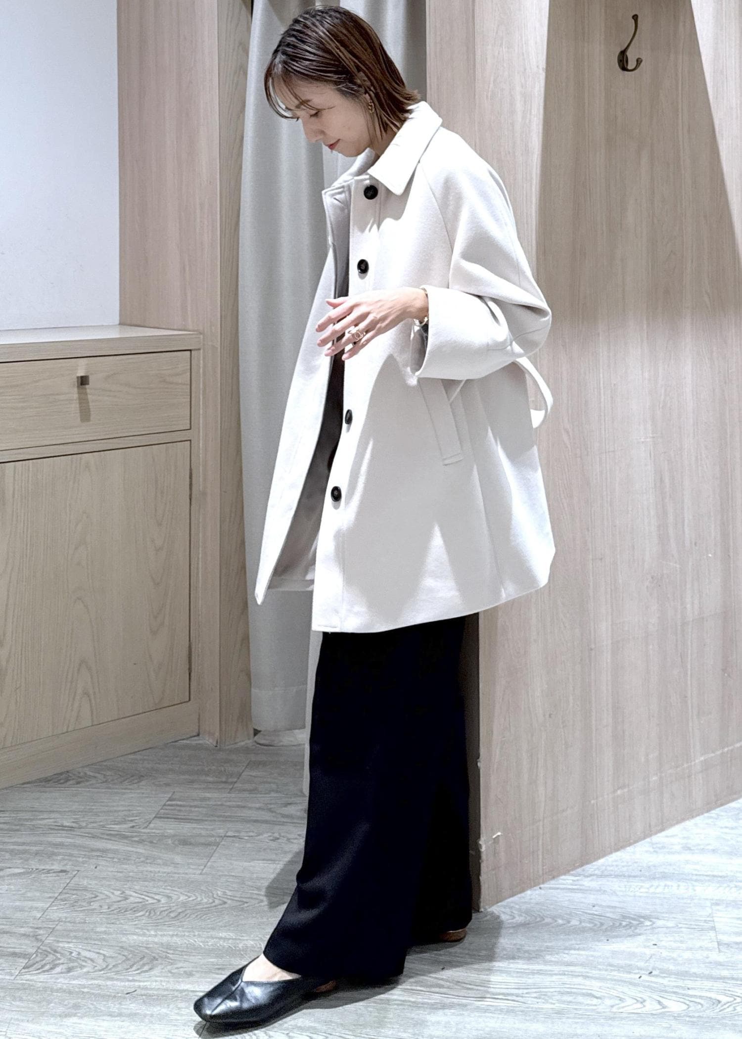 ラグランスリーブで腕周りに余裕があるので、分厚いニットの上やジャケットの上にも羽織れます◎ -