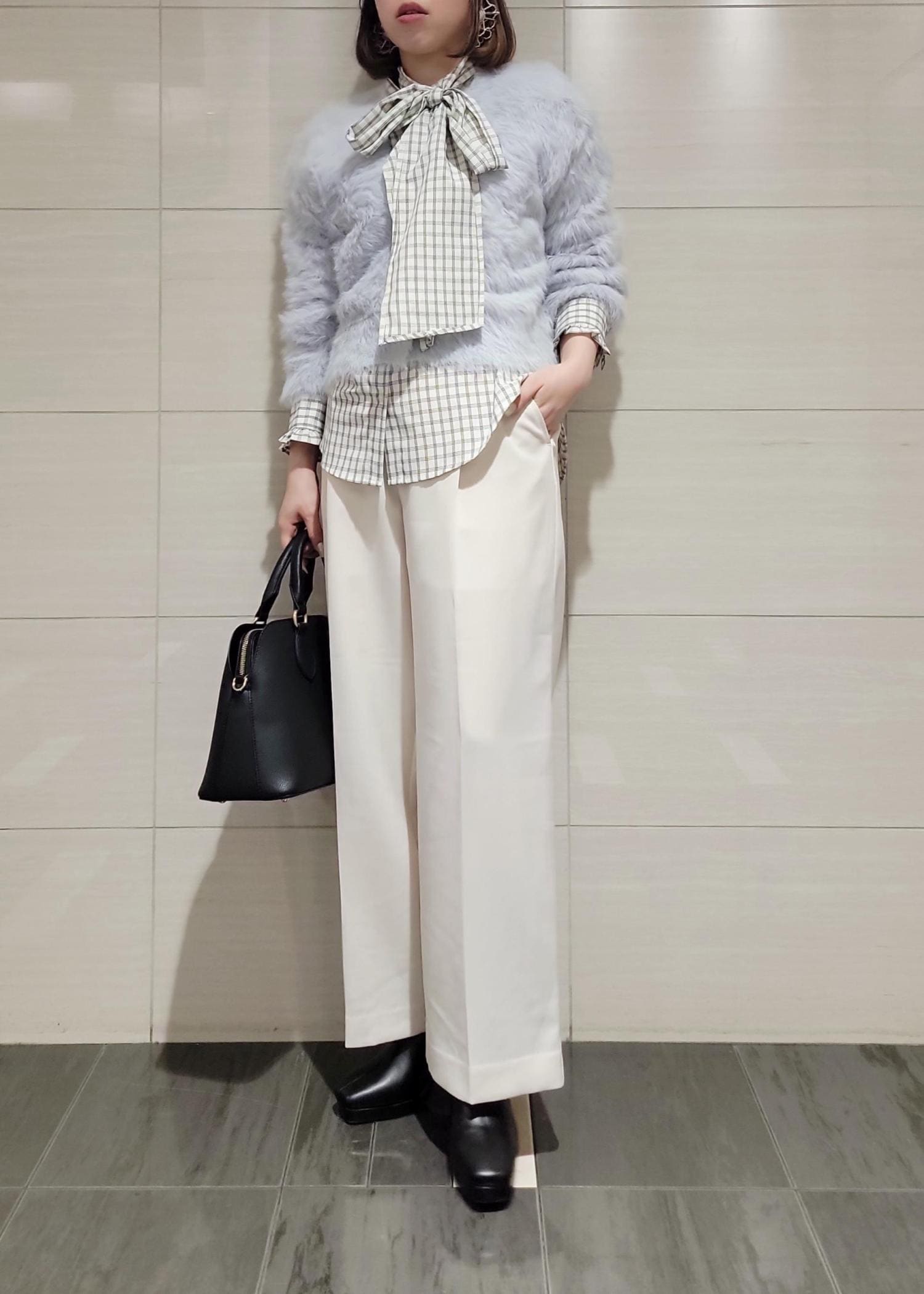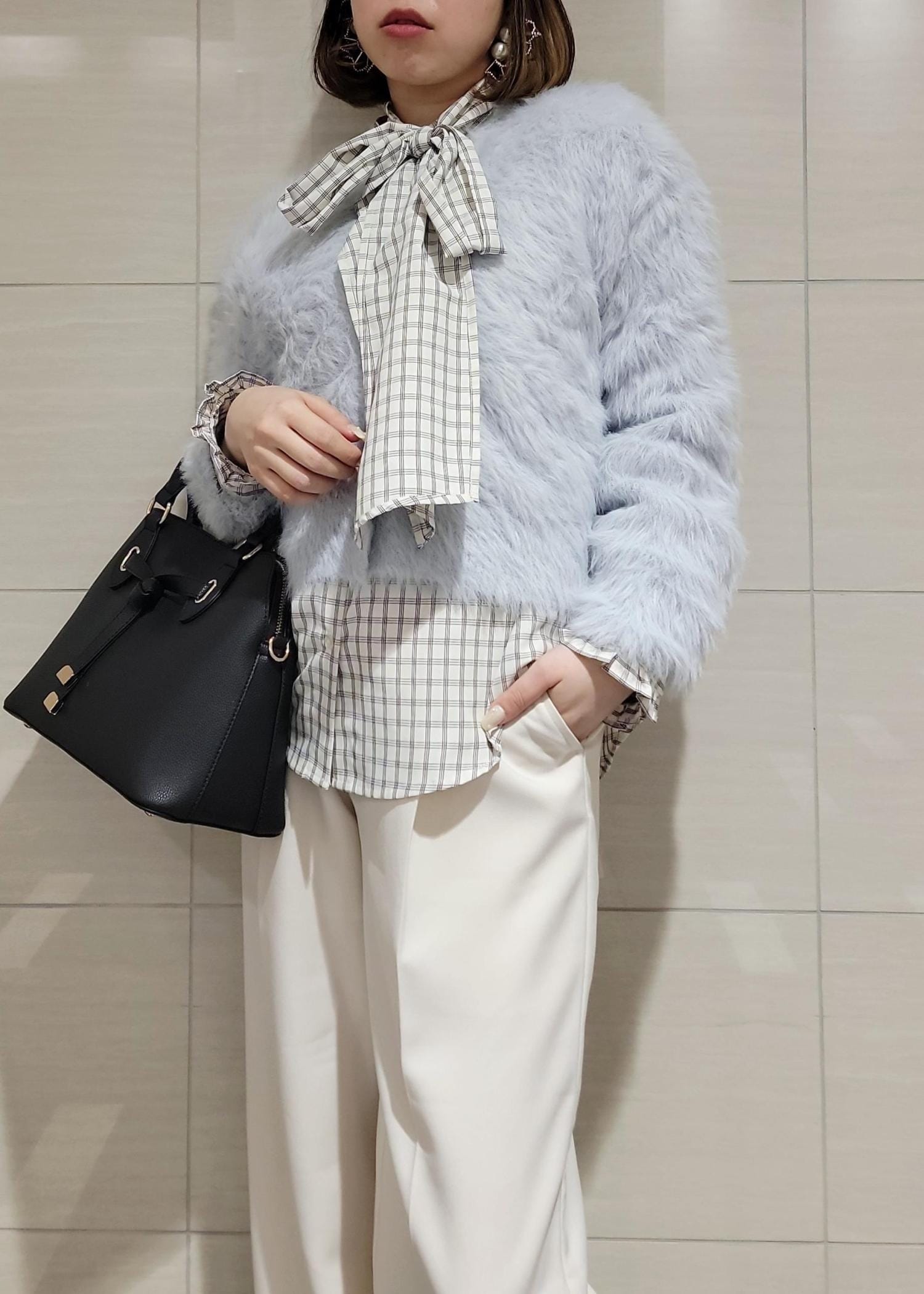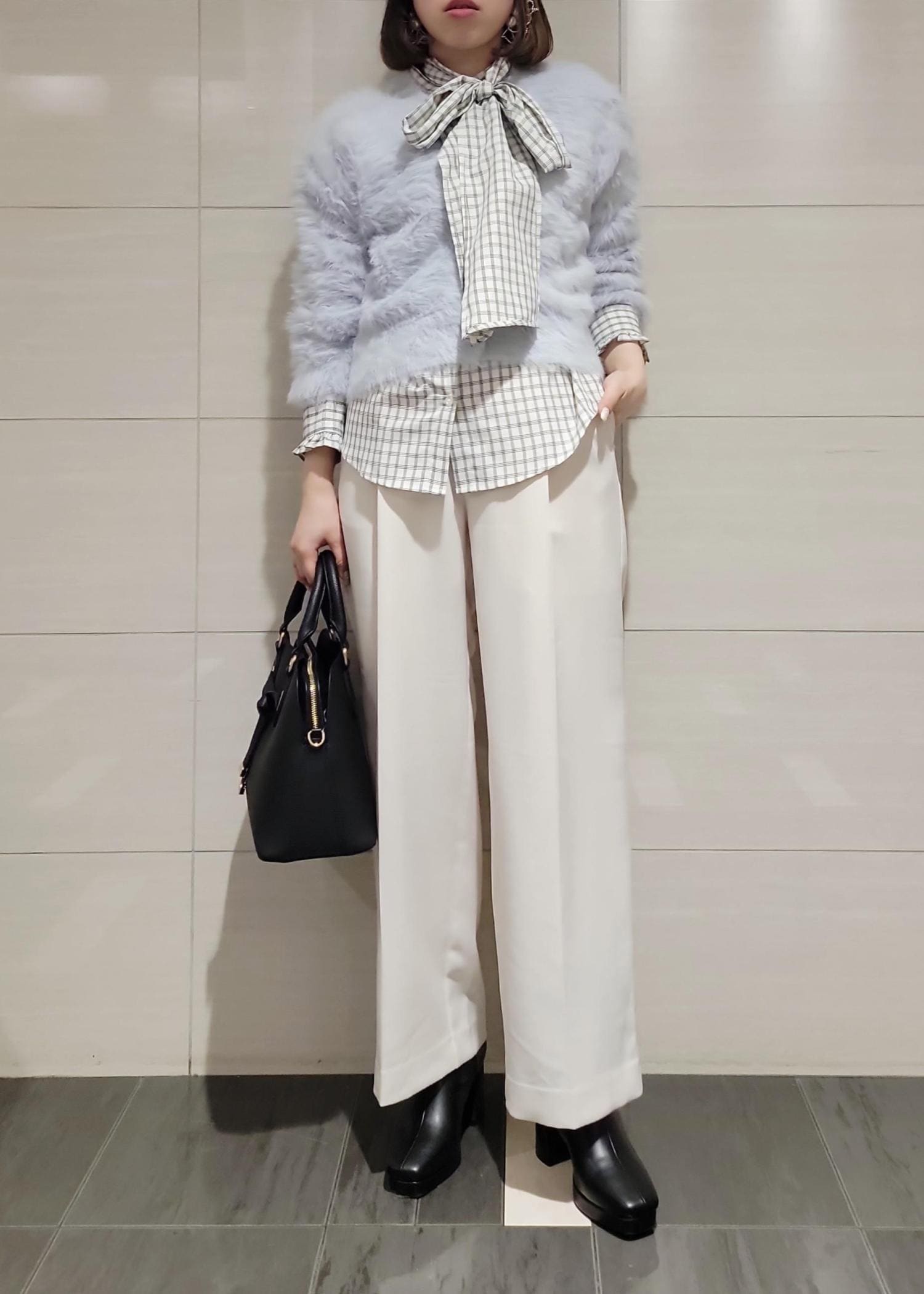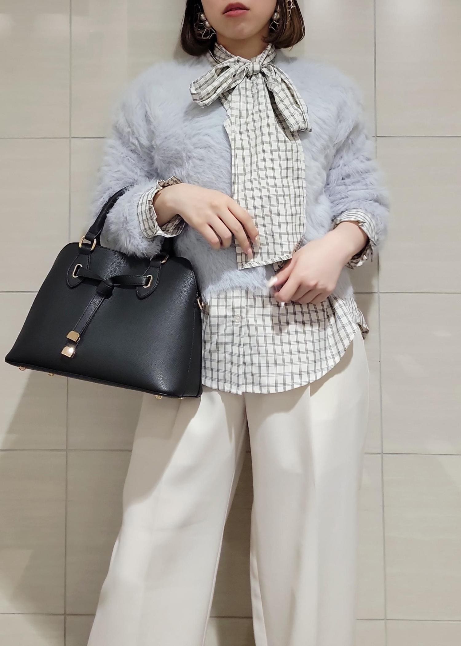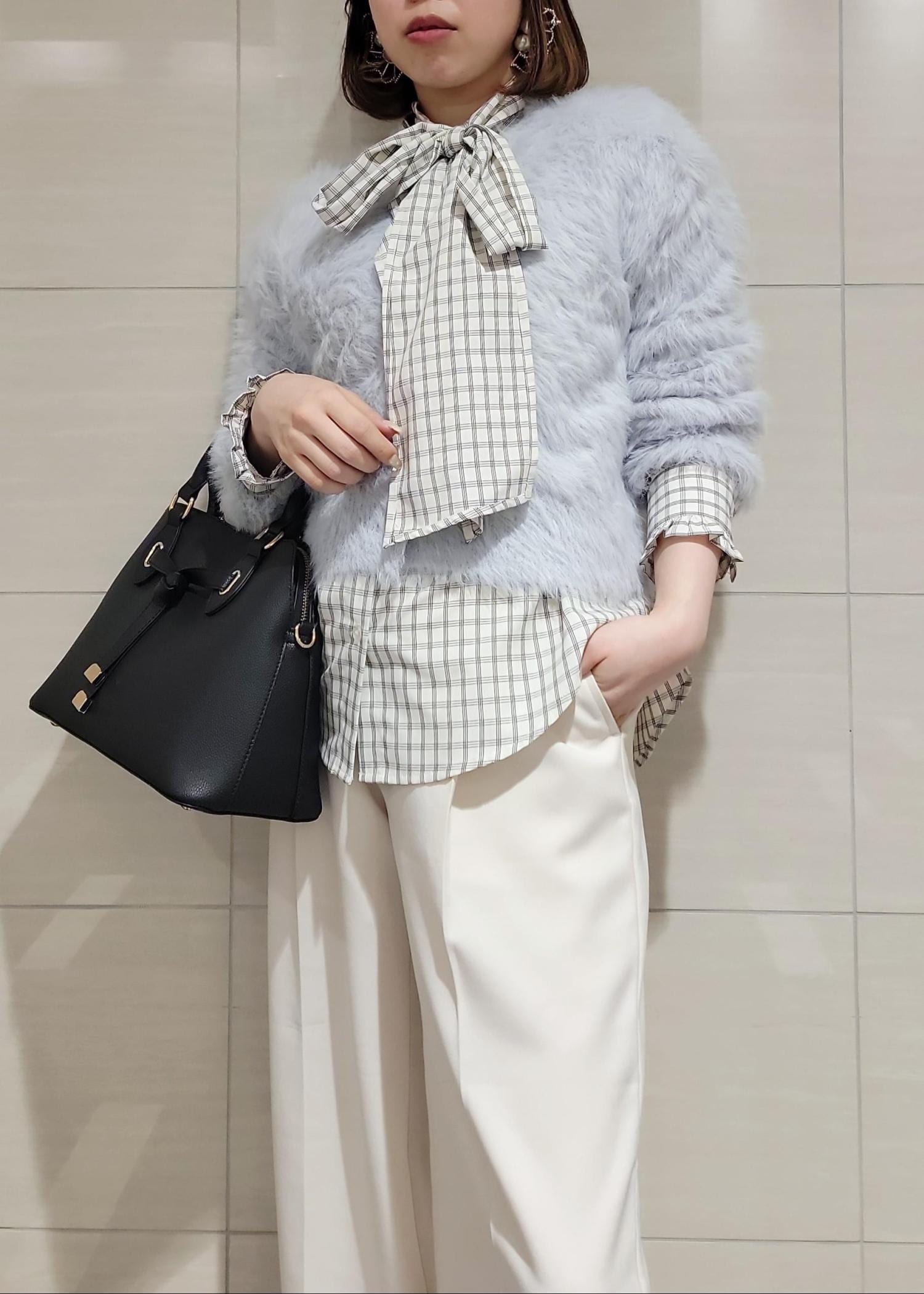VISチェック&デニムアソートボウタイリボン付きスタンドカラーシャツオフホワイト / F¥6,589レビューボウタイのブラウスは取り外しが可能で、大きめサイズがポイントになります!