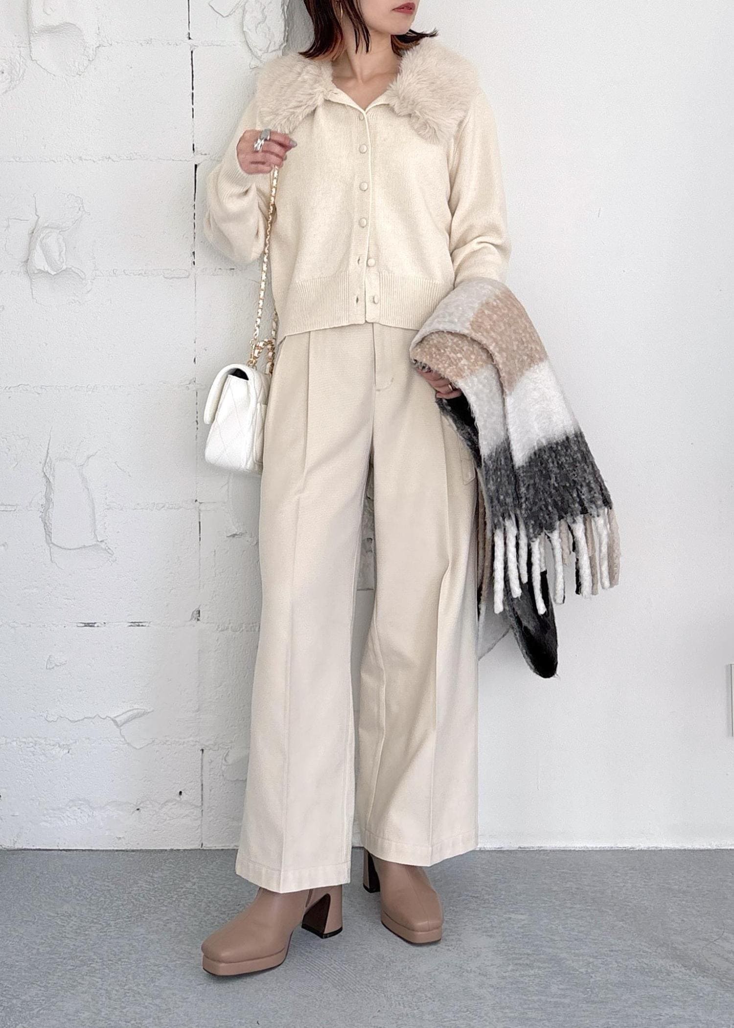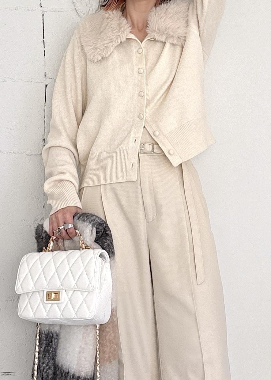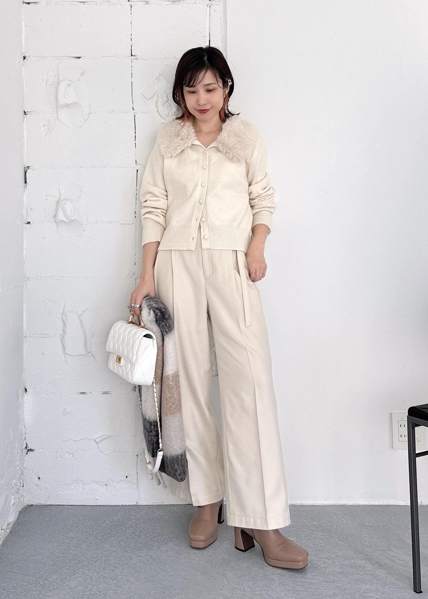 ふわふわファーが大人可愛いカーディガンをポイントに、スタイルup見えするハイウエストパンツ、ヒールブーツでスッキリ合わせた淡色スタイル♪こちらのパンツはSSサイズから作りがあるのが嬉しい。ホワイトのワントーンは冬のイベントにぴったりで気分が上がります。これからの時期にぴったりの大人カジュアルコーデ。