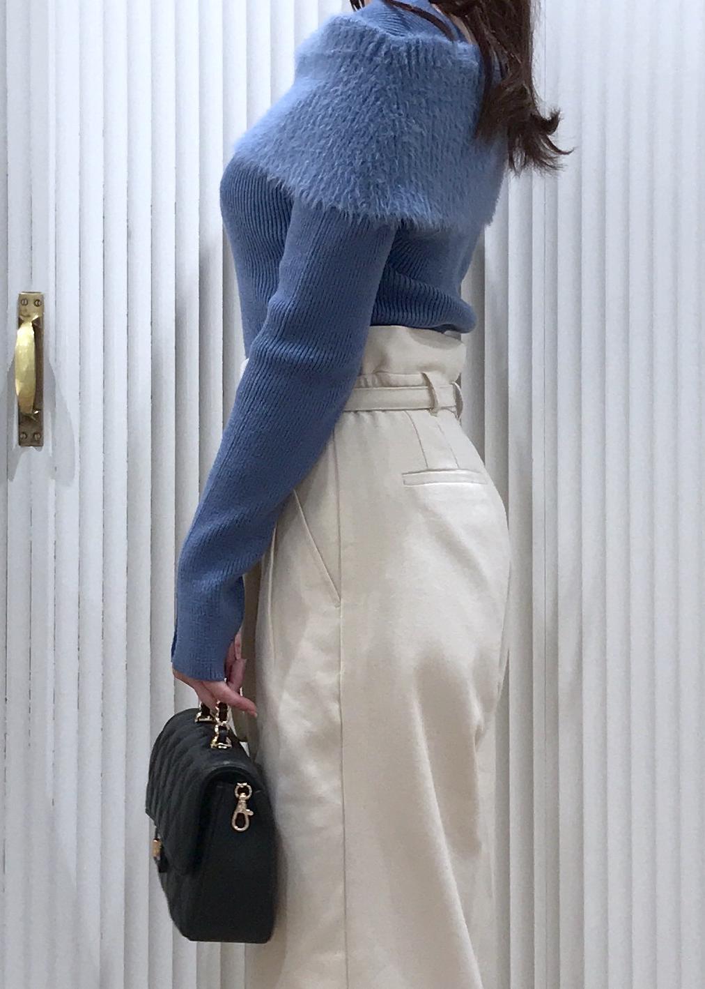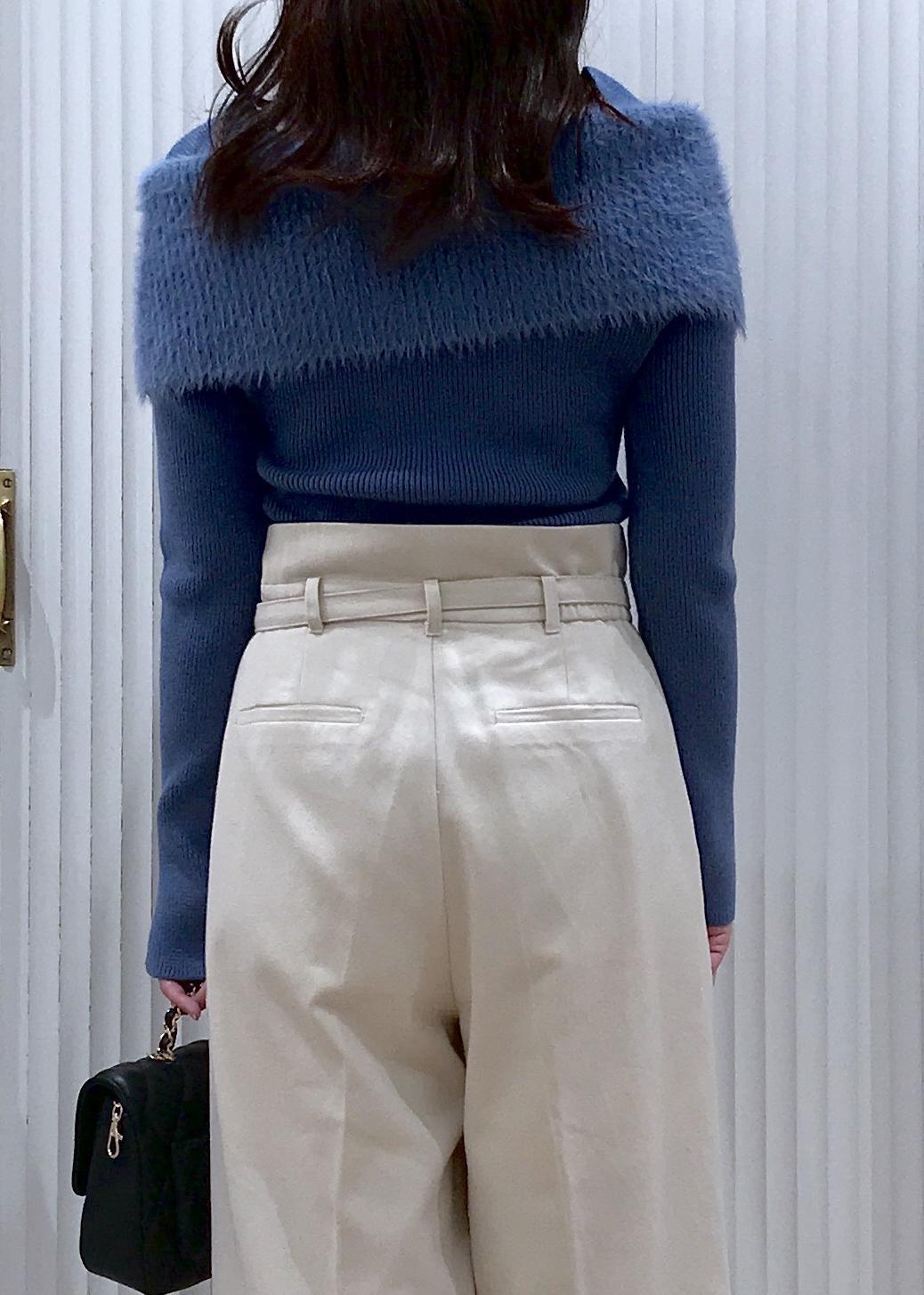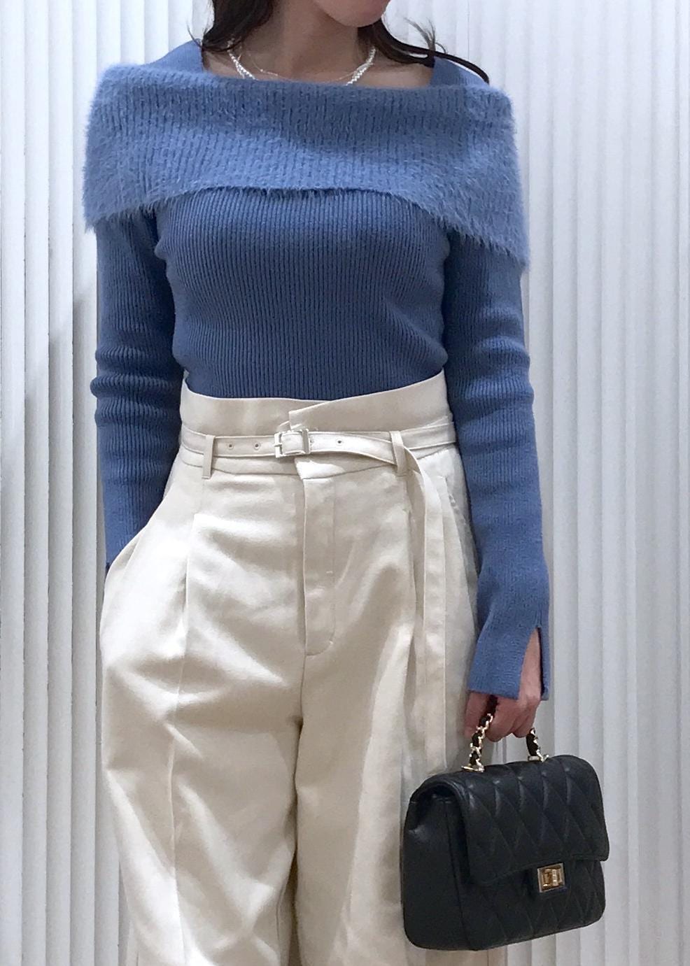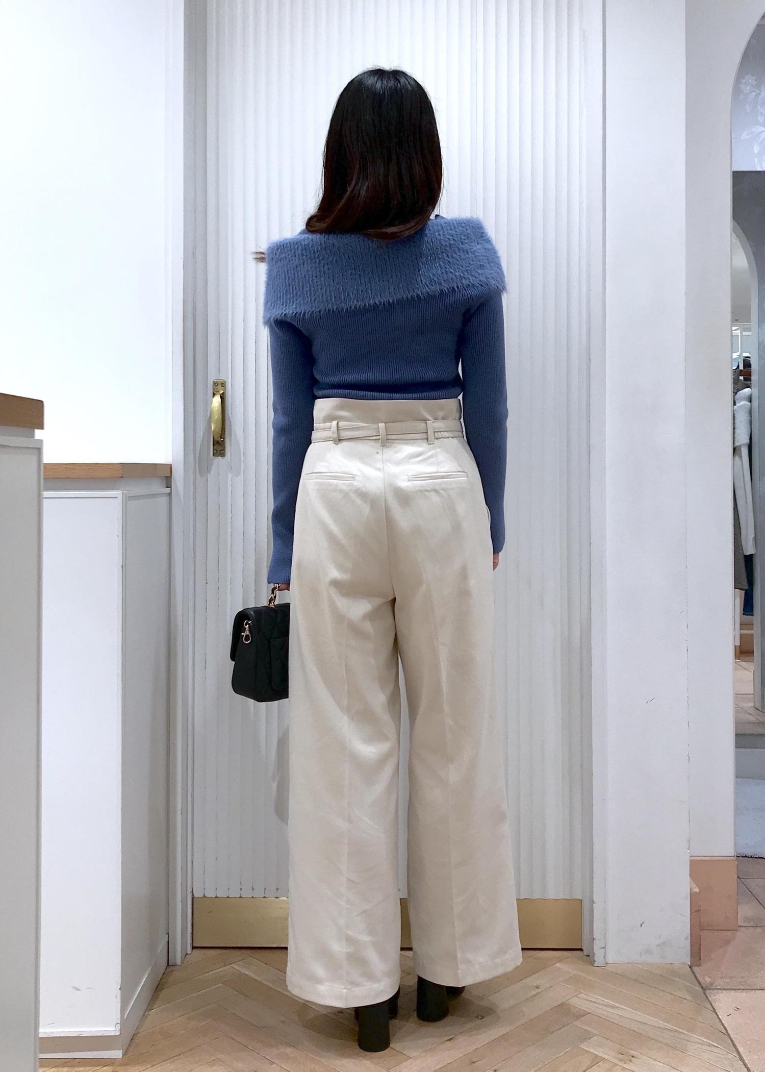 大人気なオフショルニットのフェザーヤーンがふわふわで可愛いので、シンプルなワイドパンツでも落ち着き過ぎず、普段用にもこれからのイベント事にも着回せて色々なシーンで使えるのでおすすめです!