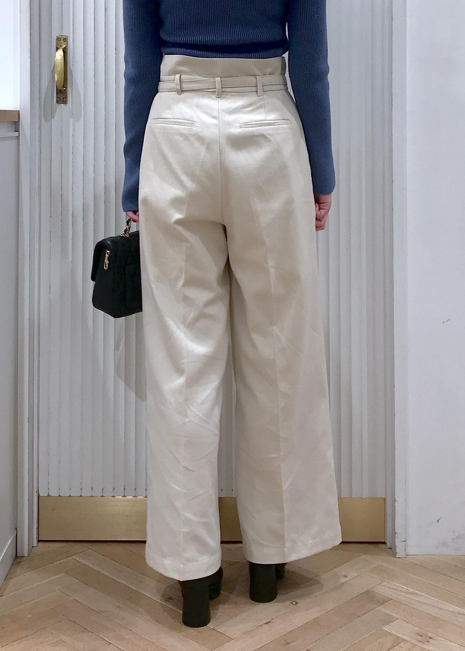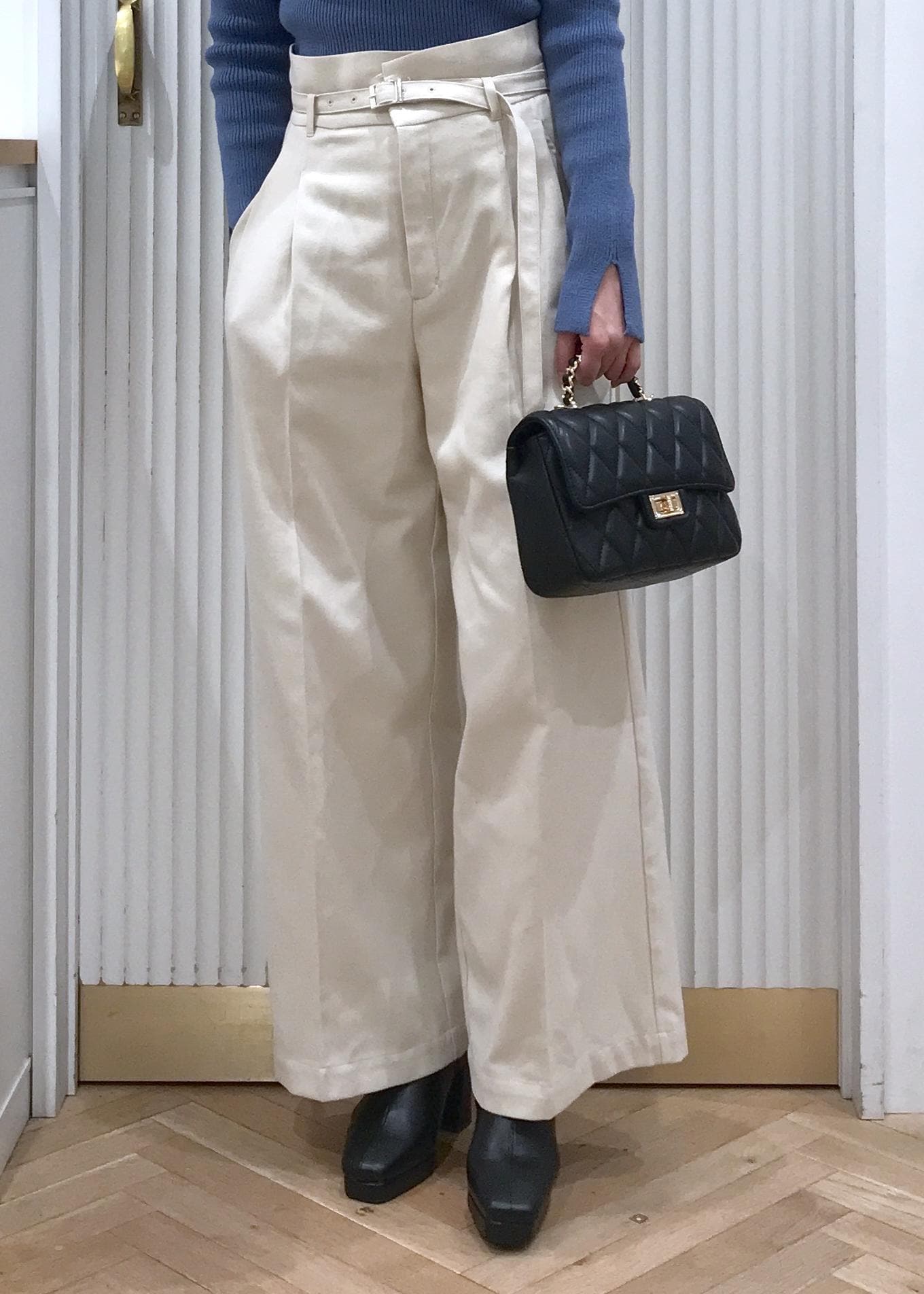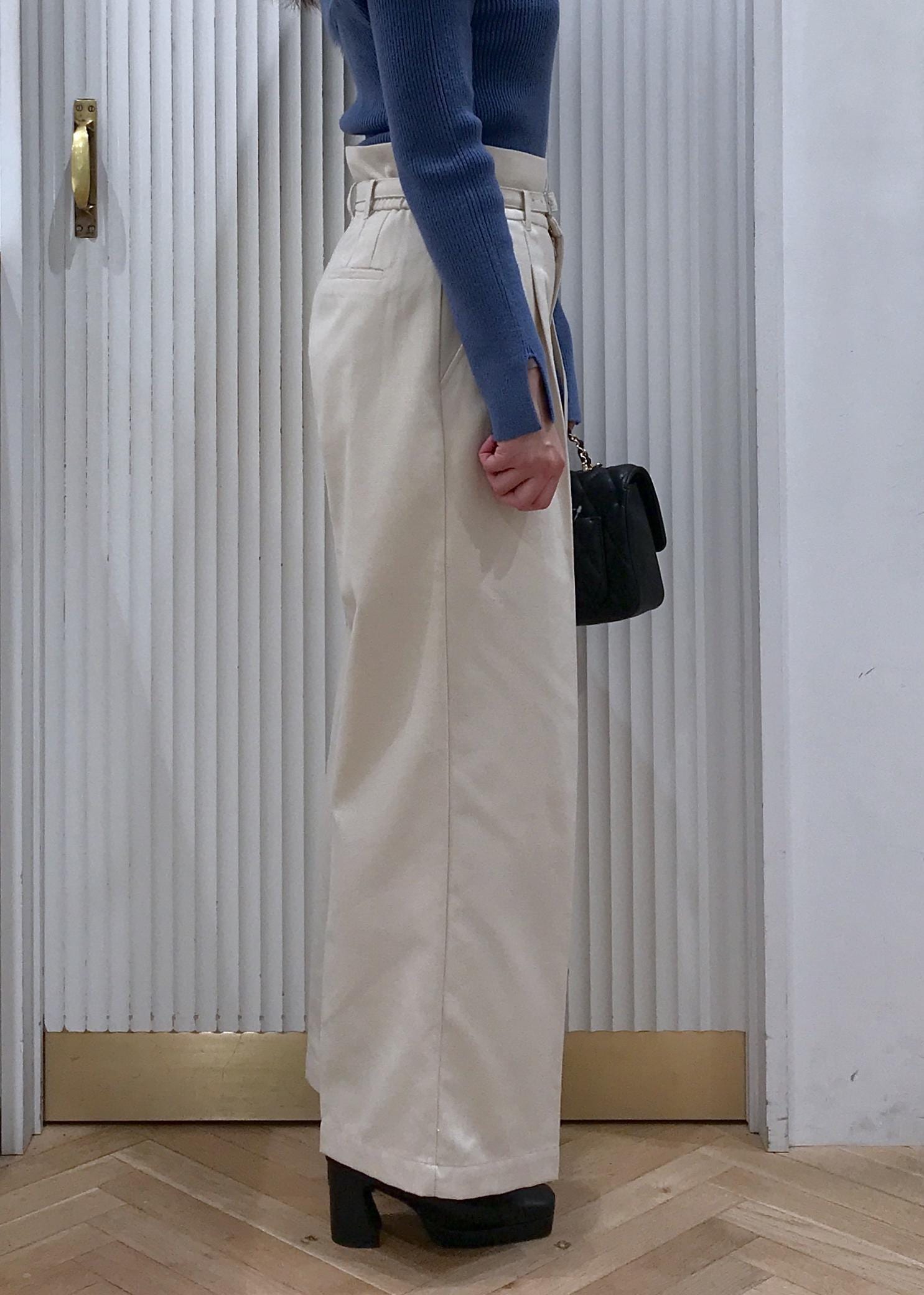 ややハイウエストで腰位置が高く見え、ベルトが付属で付いているので腰回りがスッキリ見えるシルエットです。