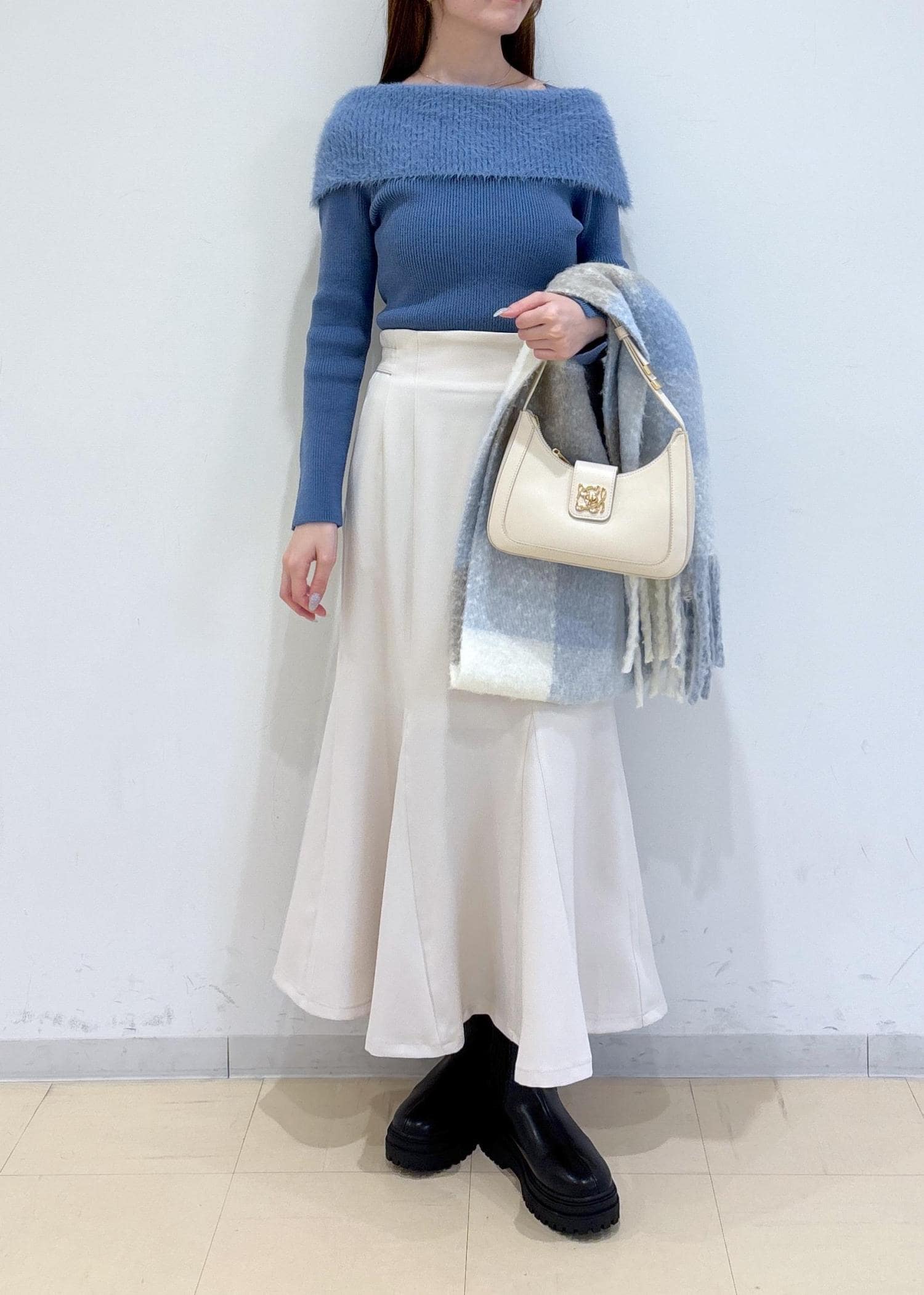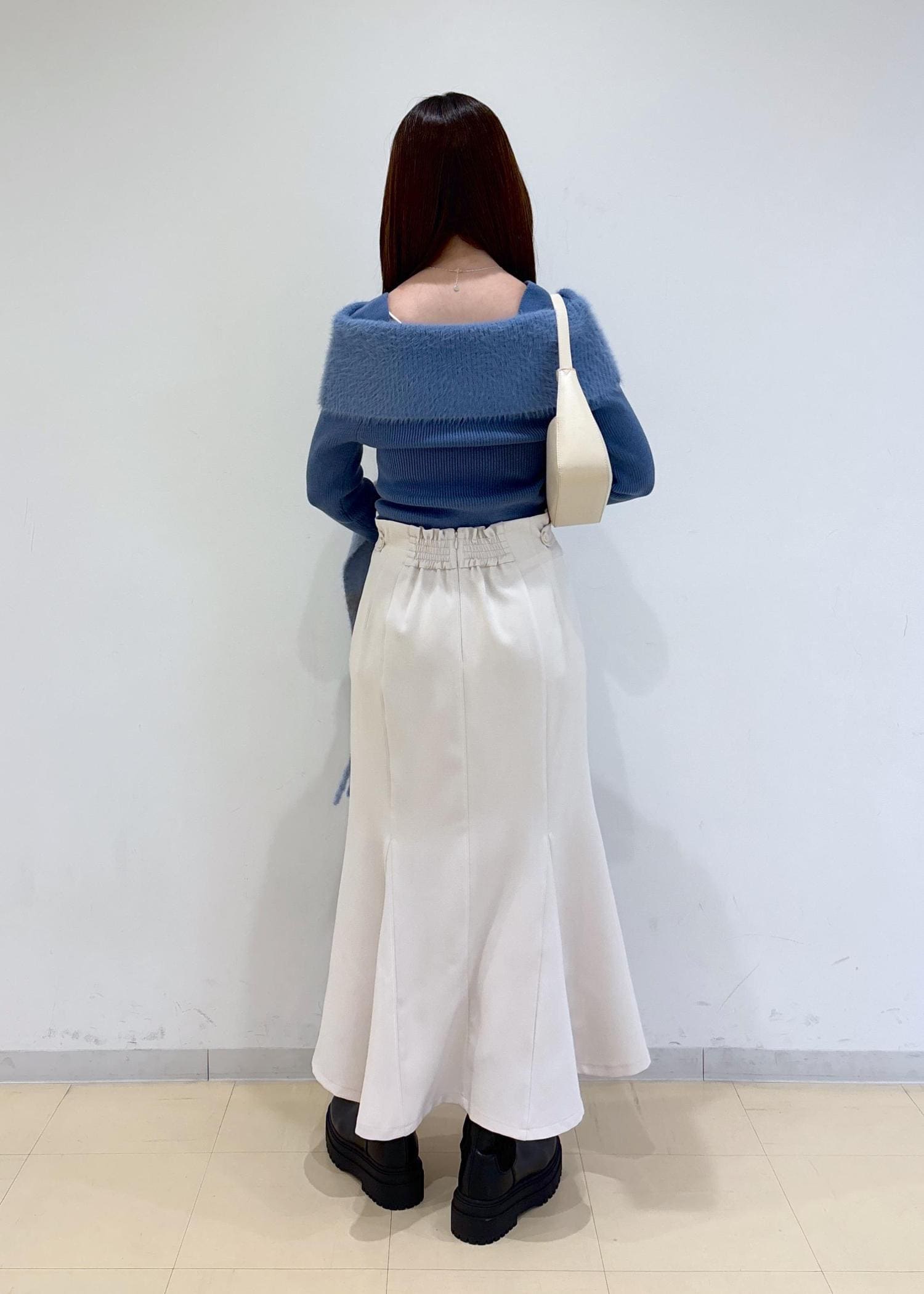 オフショル風のデザインで女性らしさがあるので、スカートで綺麗めなコーディネートにしました。