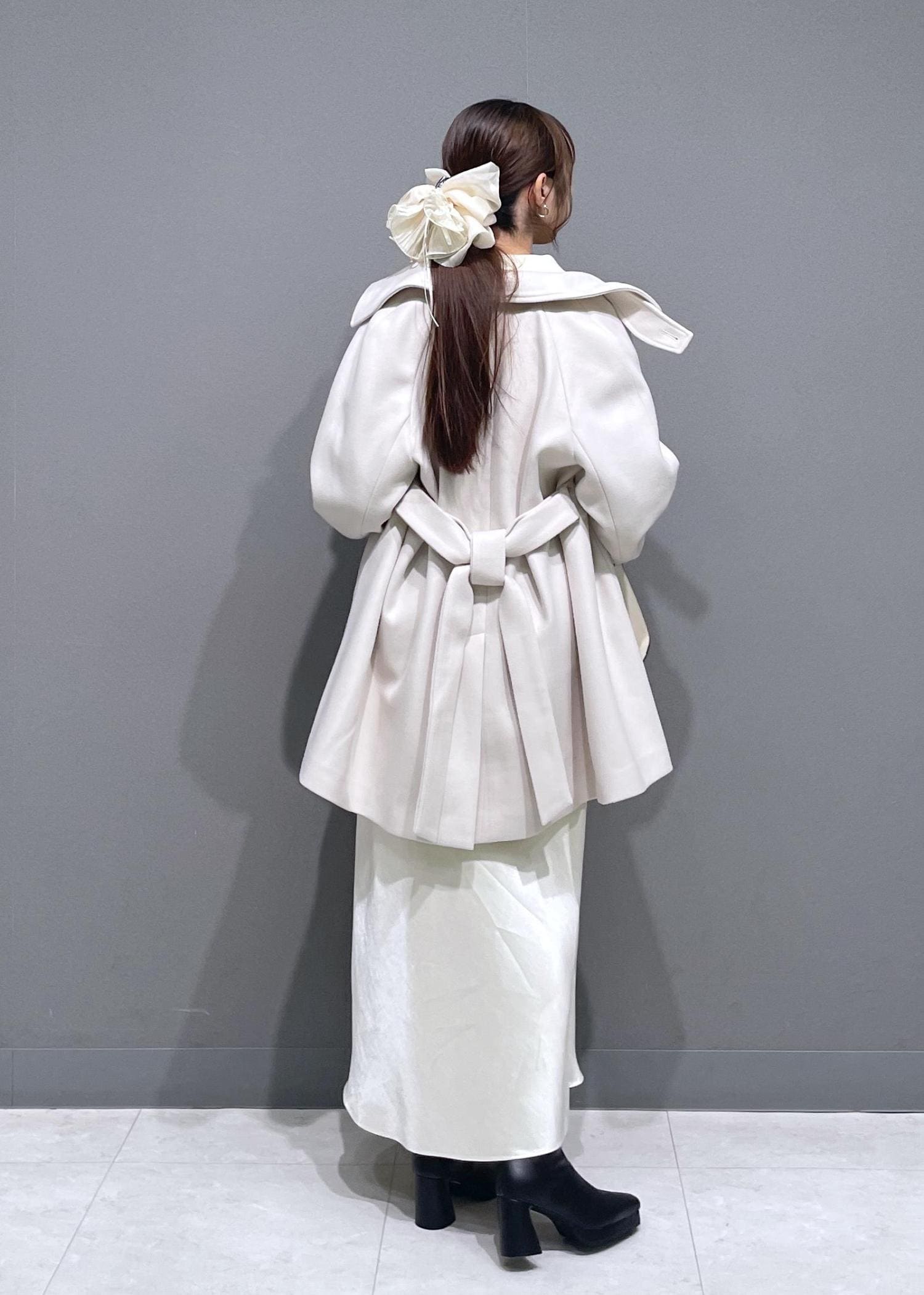 ボタンを留めてウエストのリボンを結ぶとワンピース風のシルエットにもなります -