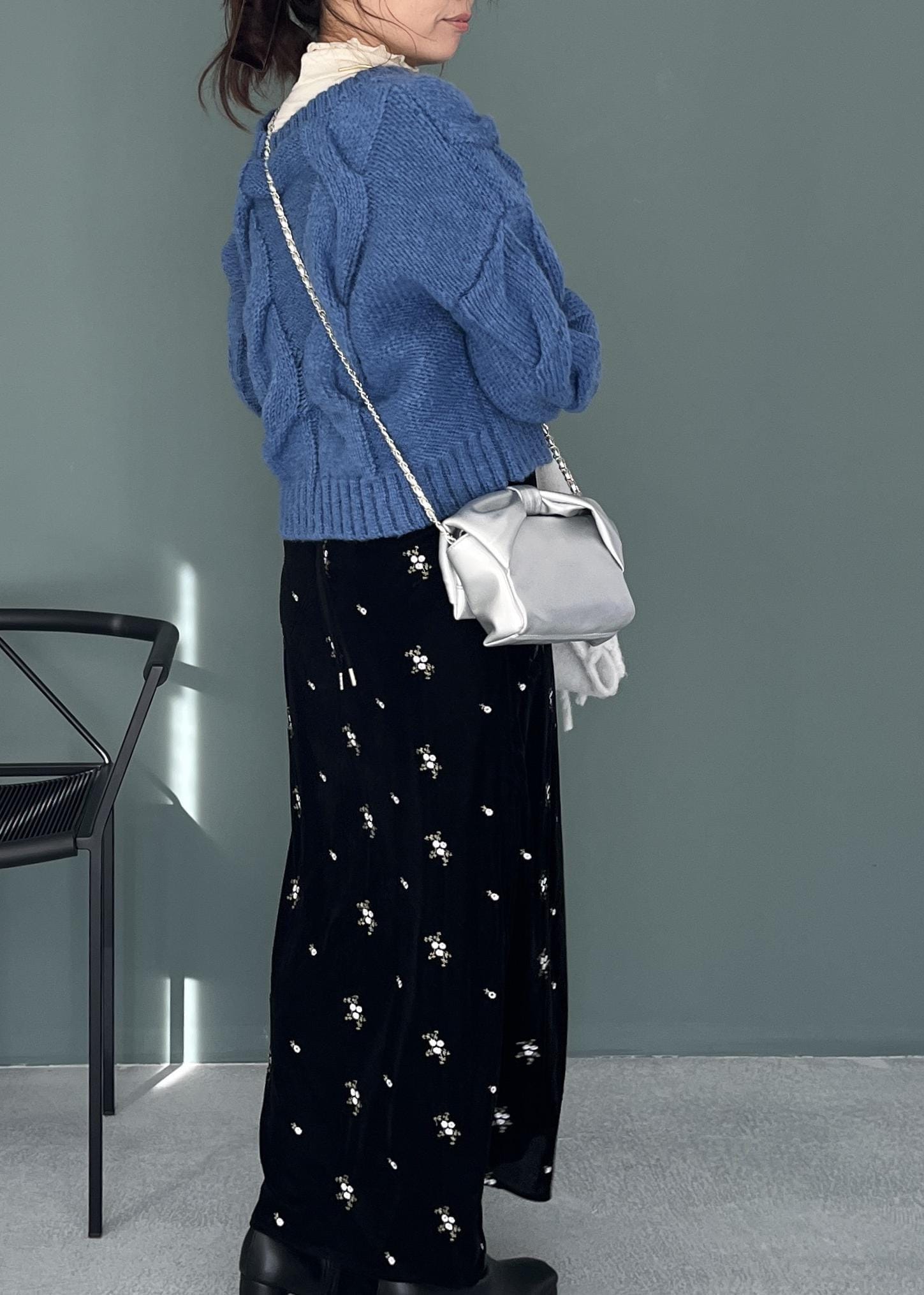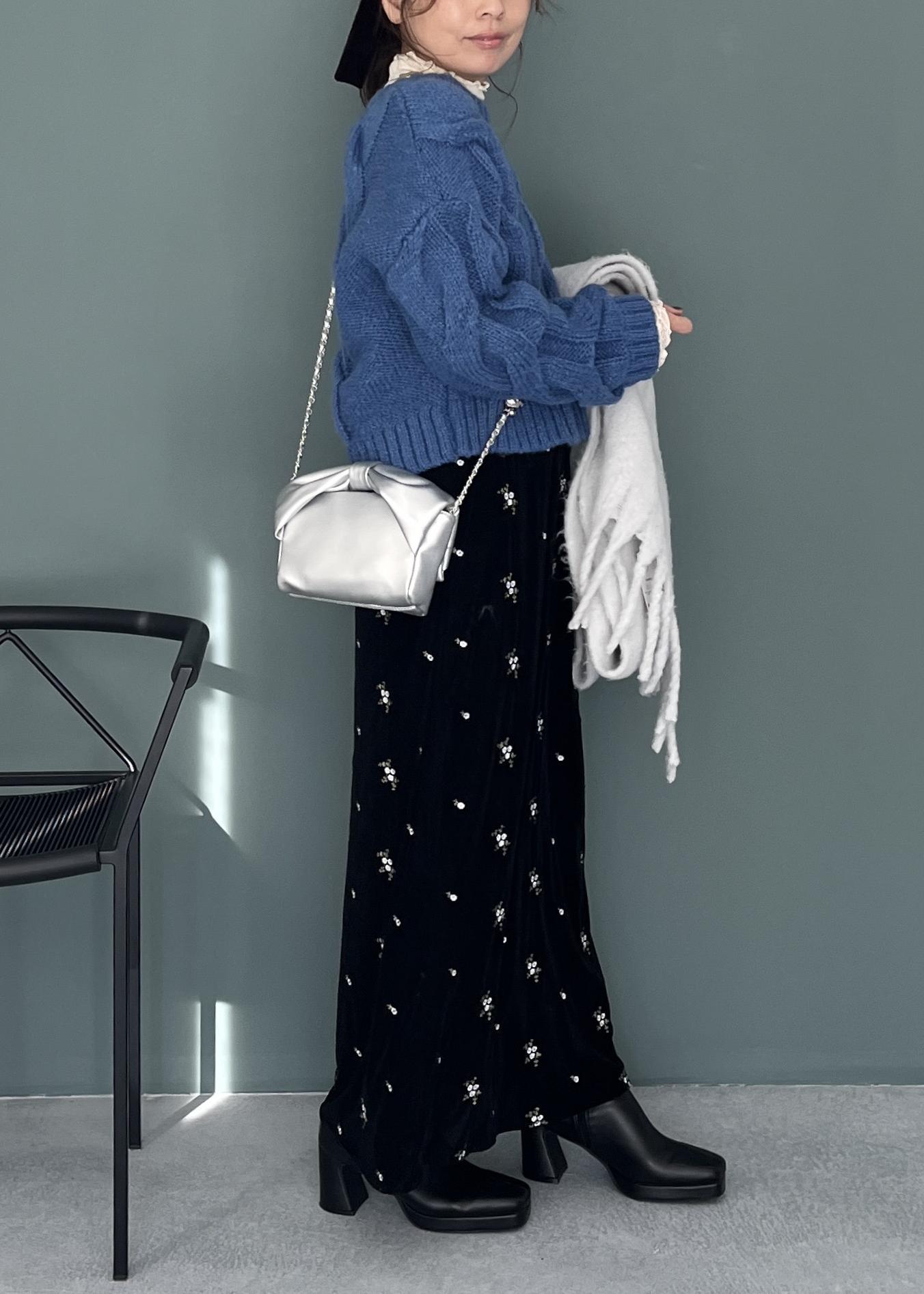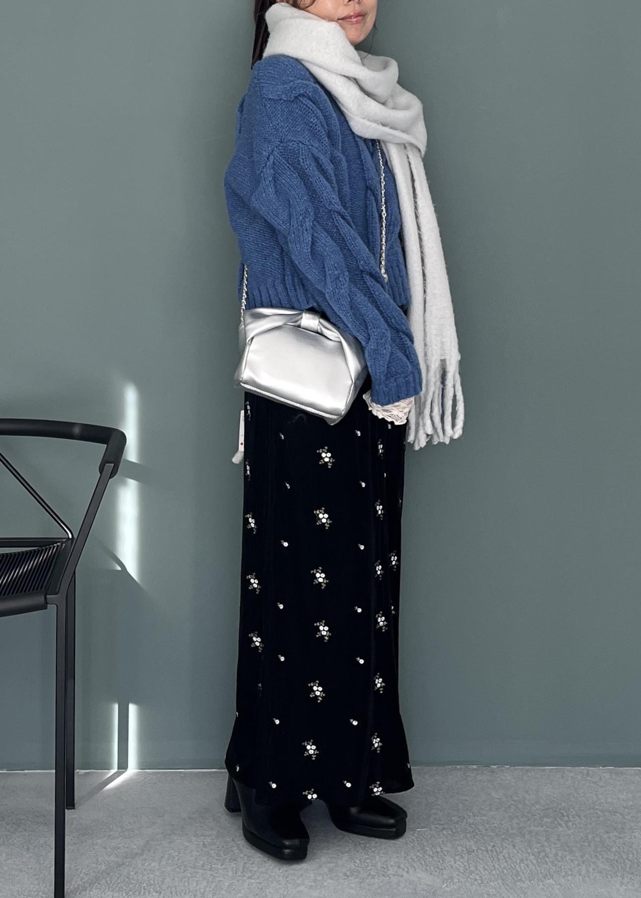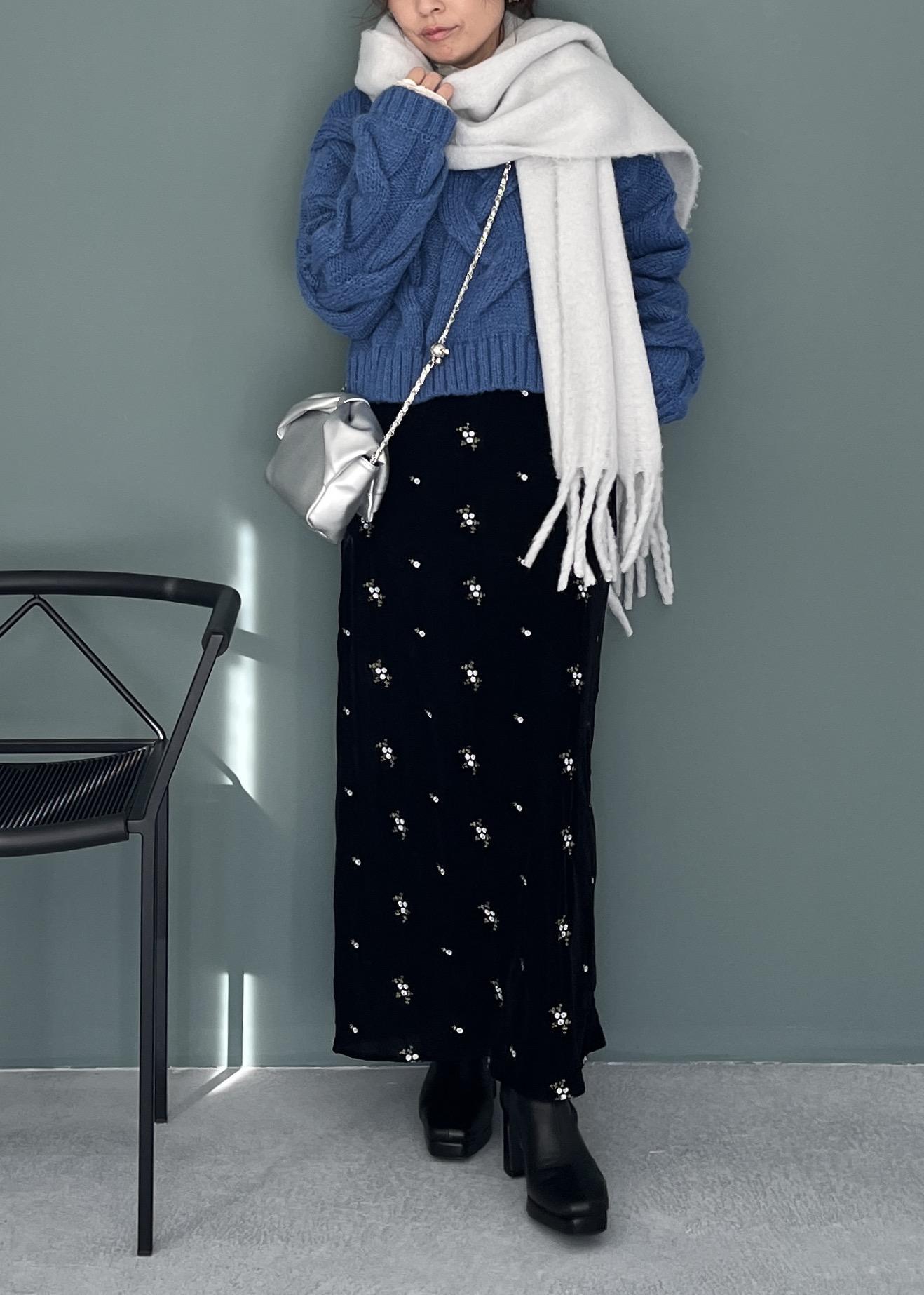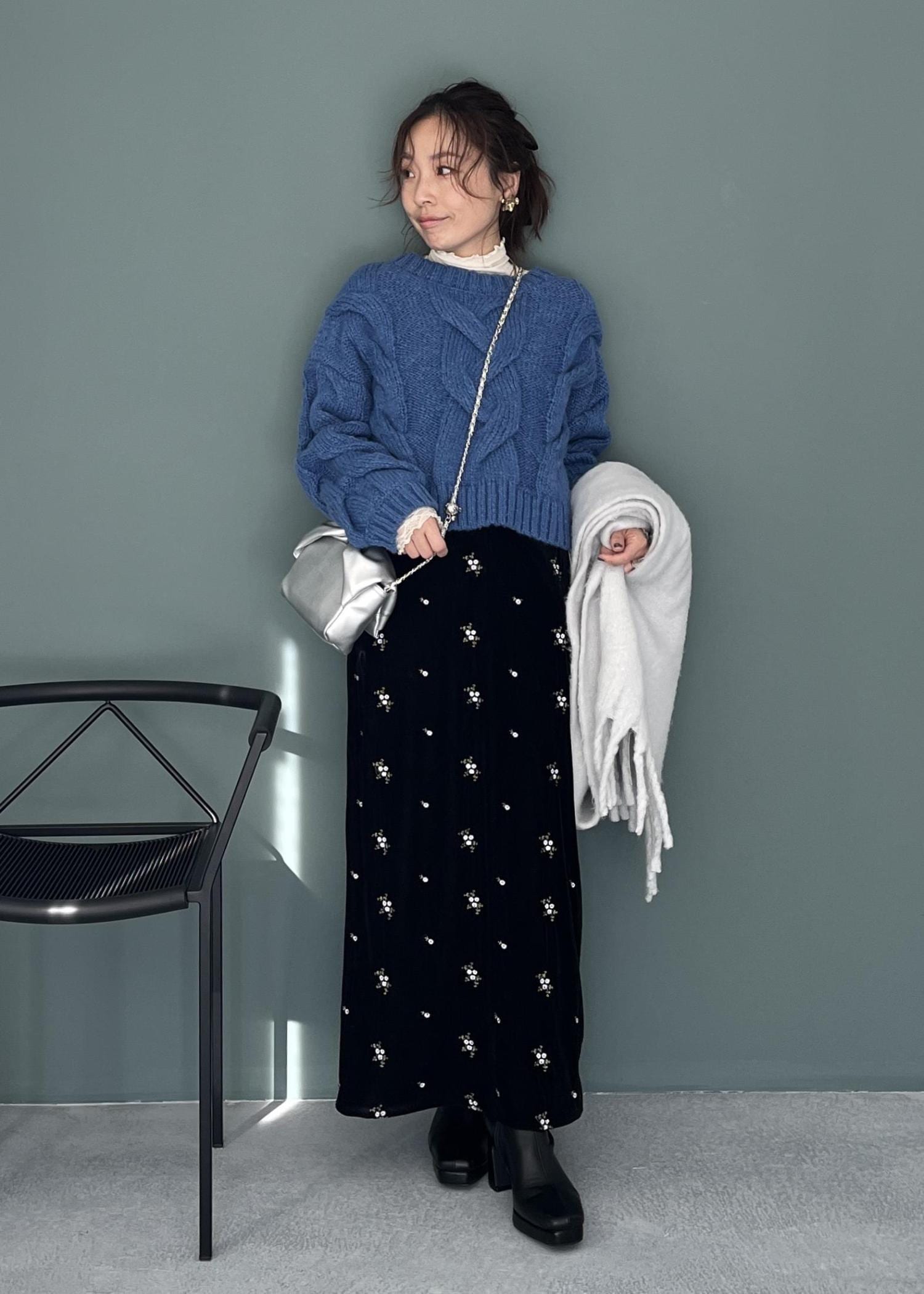 ふんわりしたケーブルニットに、花柄刺繍のキャミワンピースを合わせた冬のきれいめカジュアルコーデ。