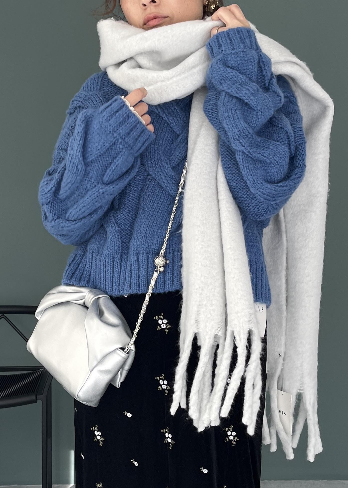 ブルー×ブラックの落ち着いた配色に、白ストールで明るさと抜け感をプラスしました。