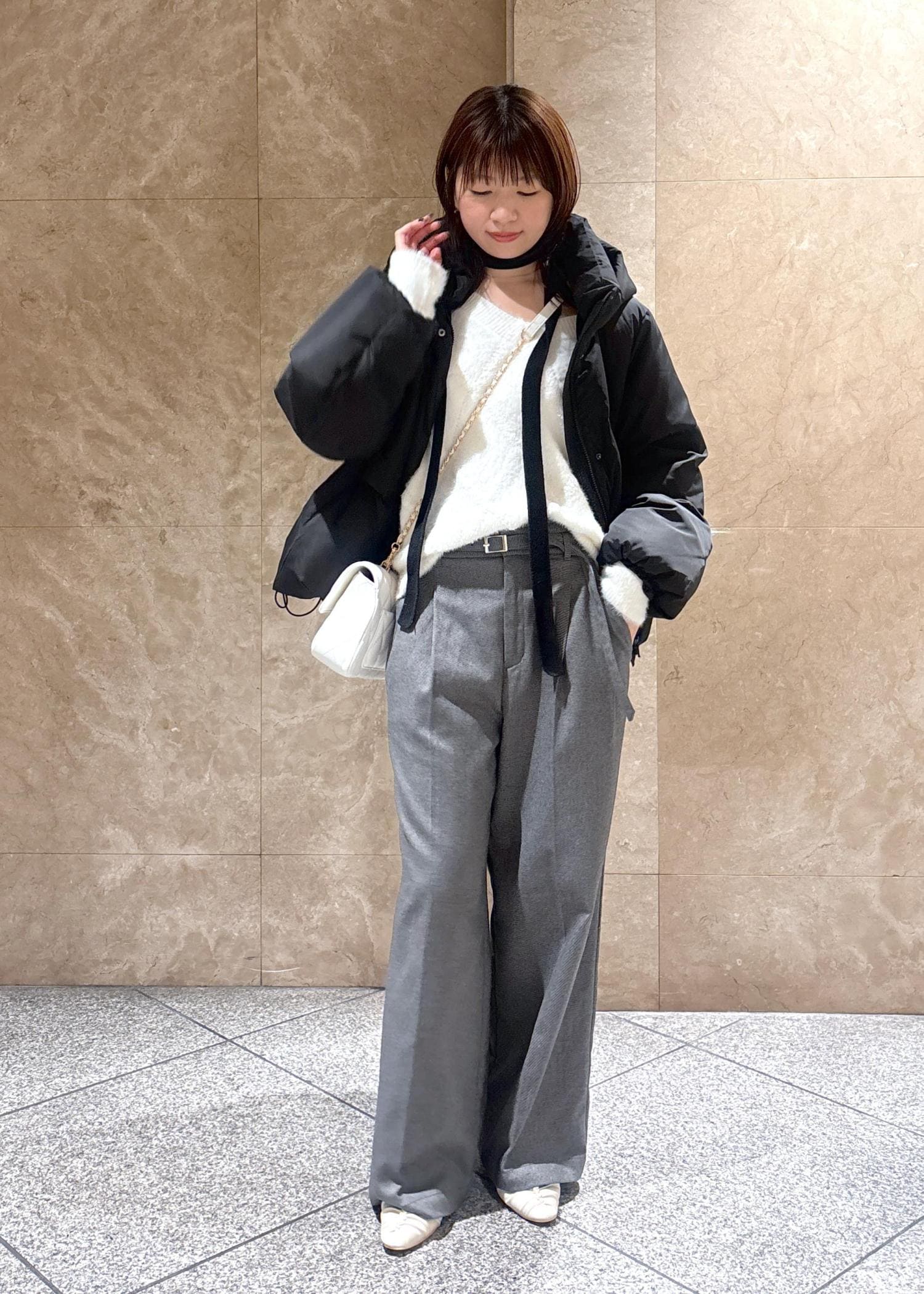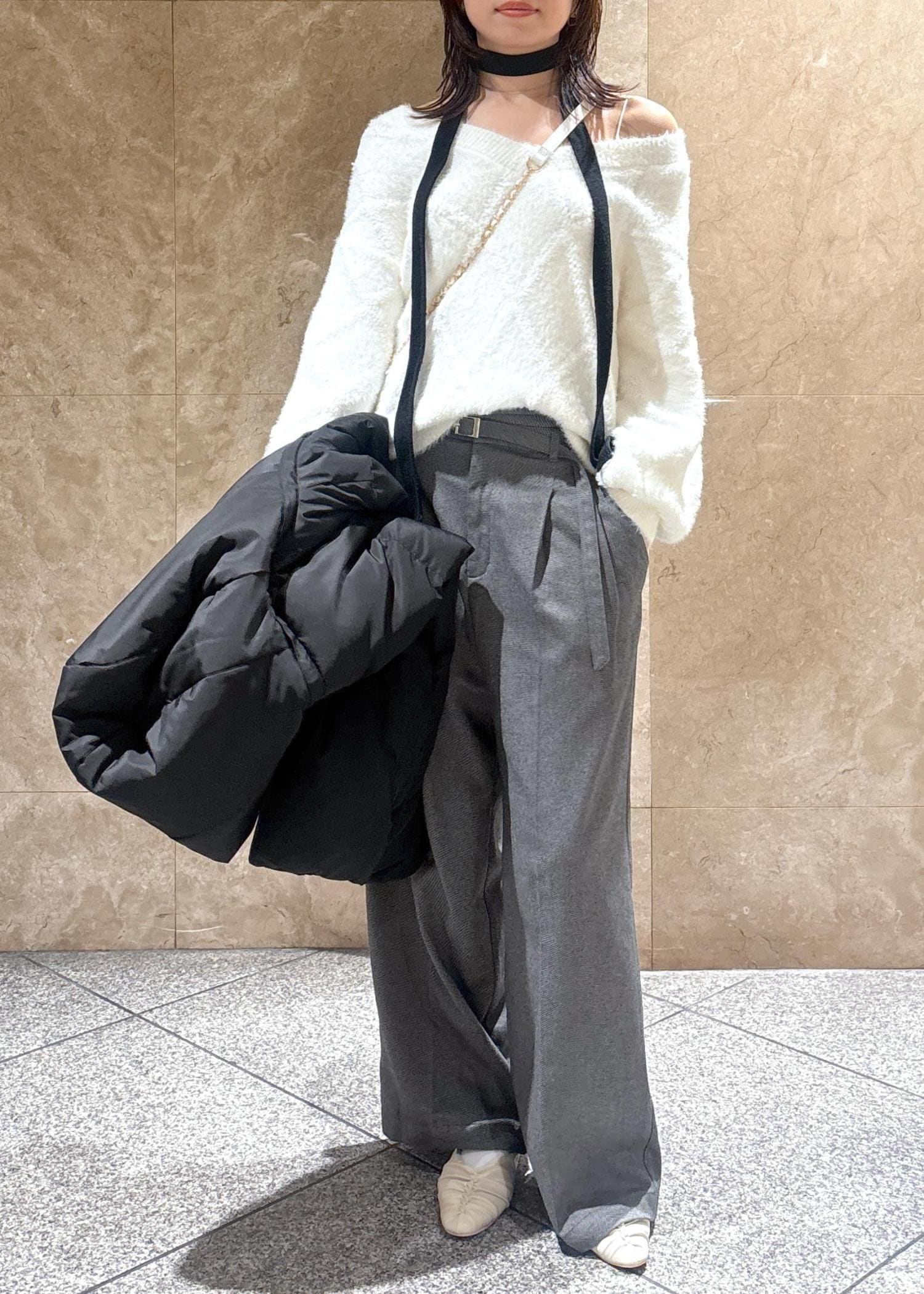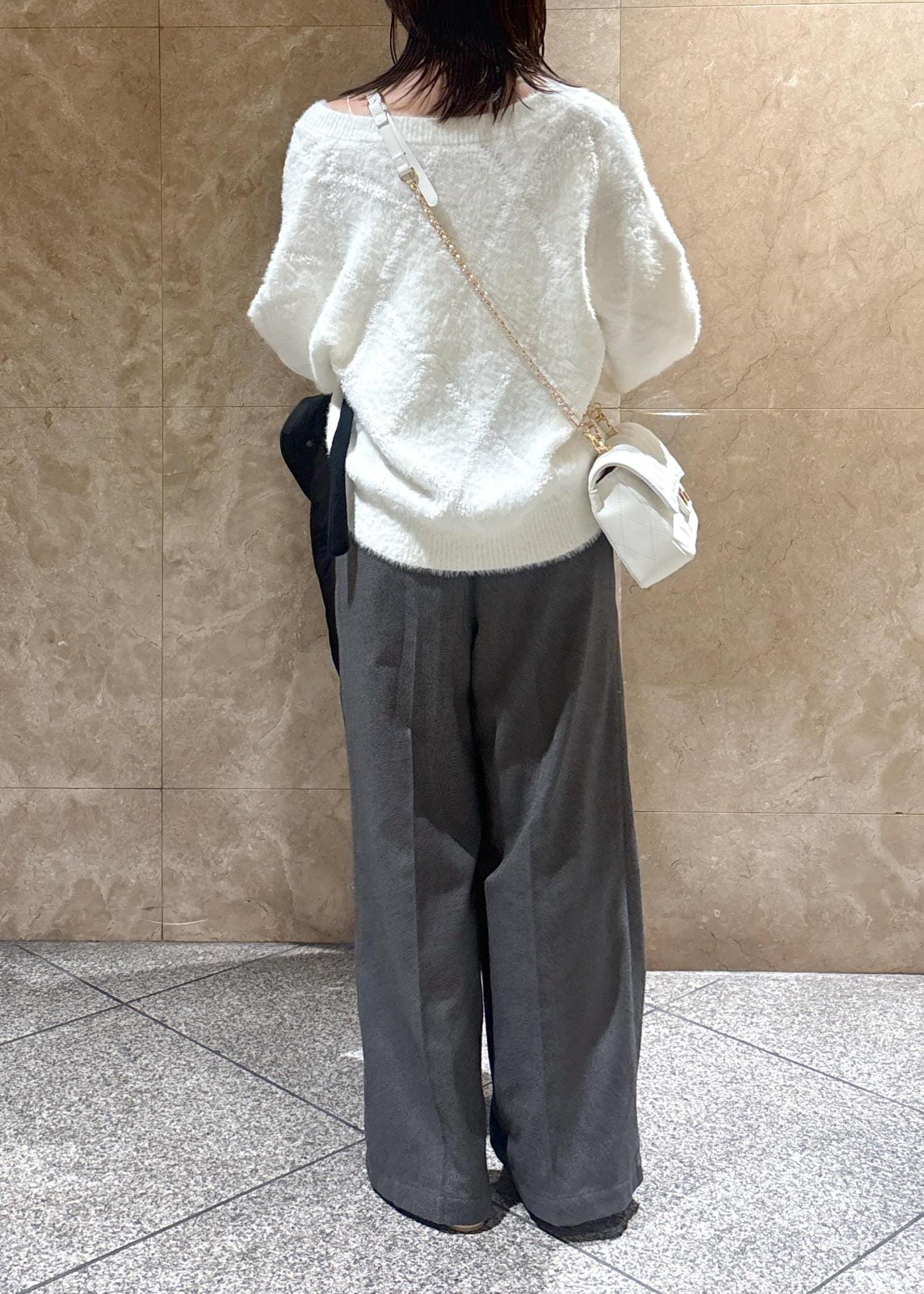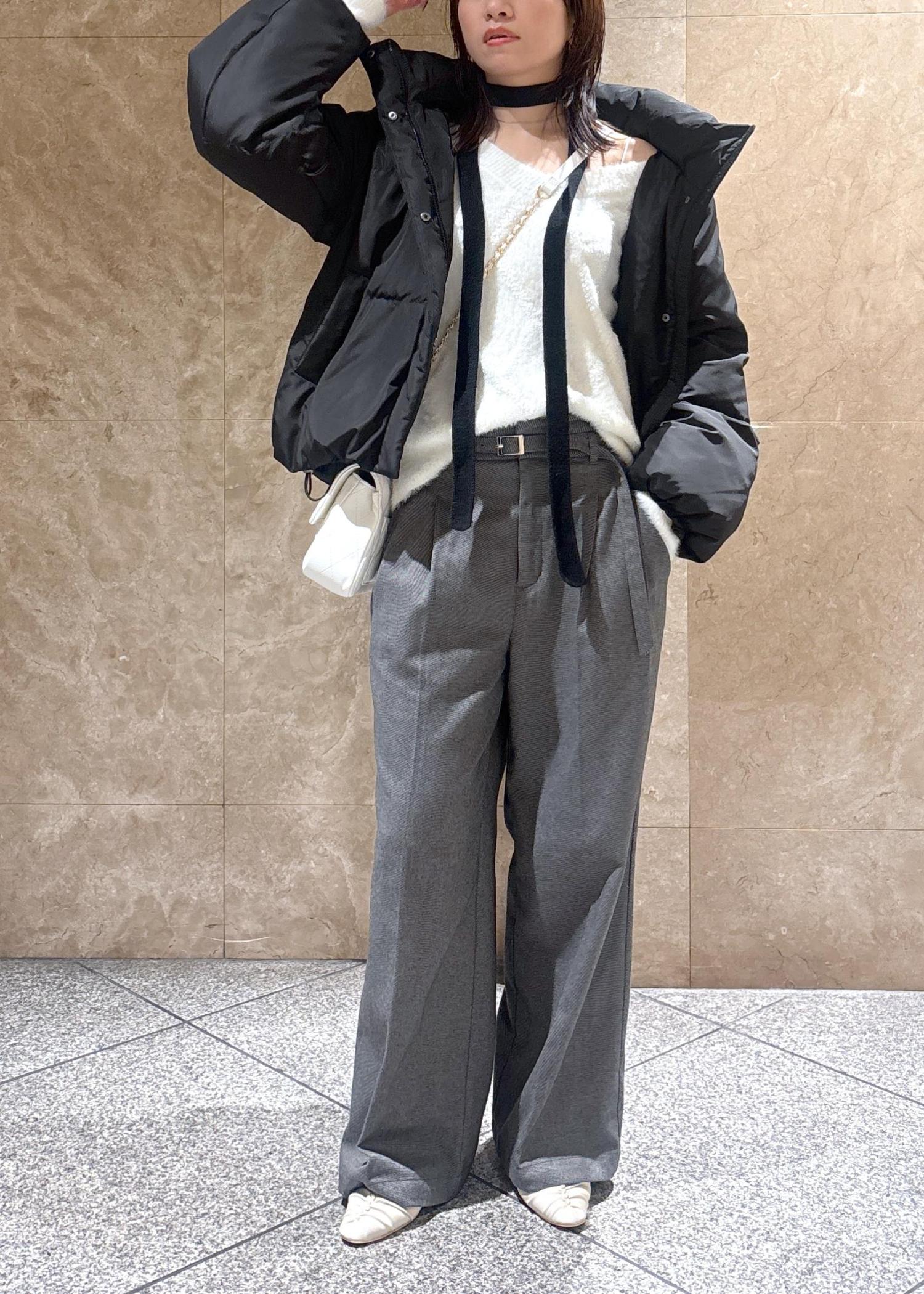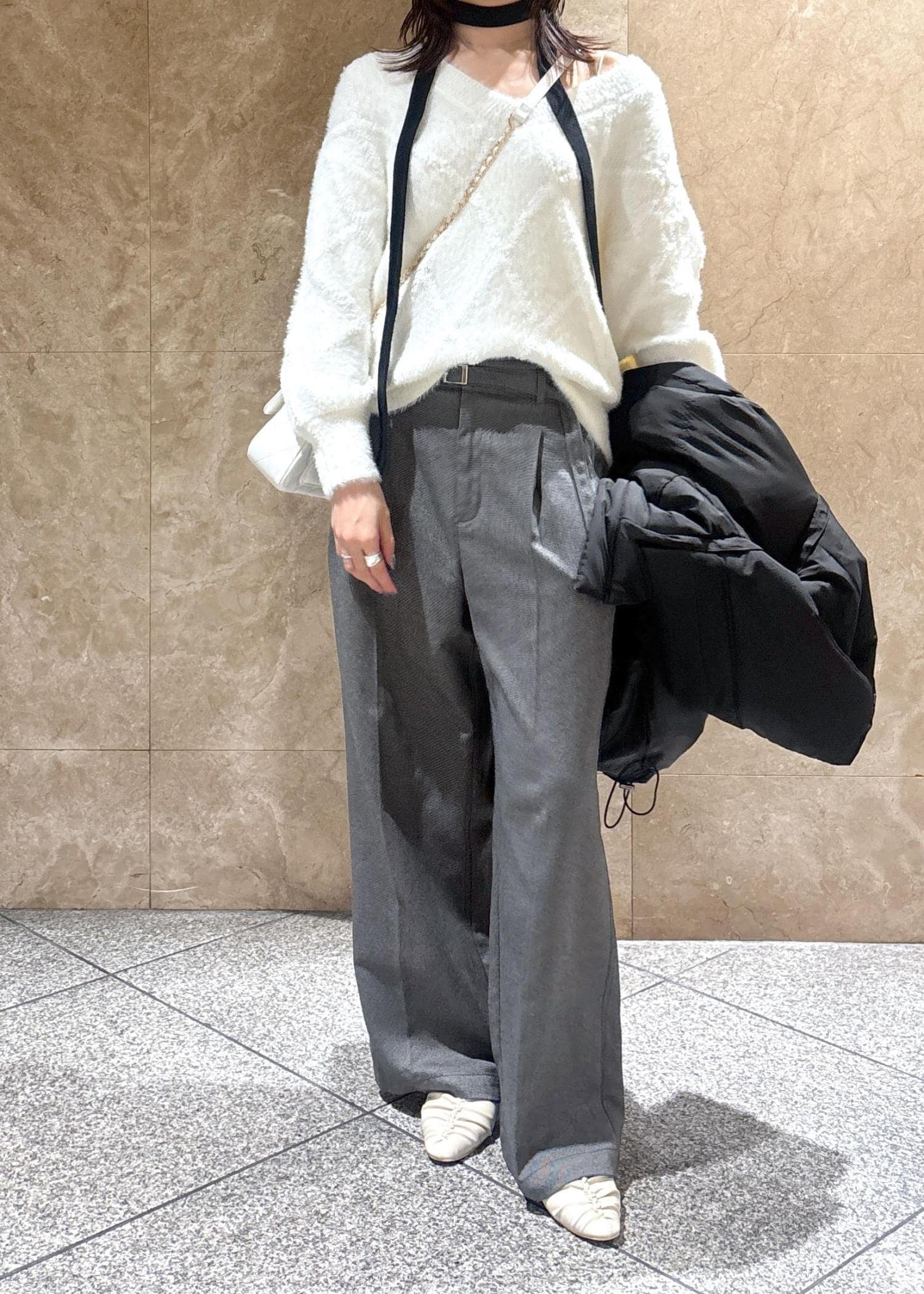 VIS起毛ウールライク版ベルトディテールタックワイドパンツグレー / M¥6,589レビューベルトをおへその位置でしっかりハイウエストで履くと足首が出る丈ですが、へそ下で履いてもシルエットが崩れなかったので、敢えて腰で落として着丈長めに着用しています。