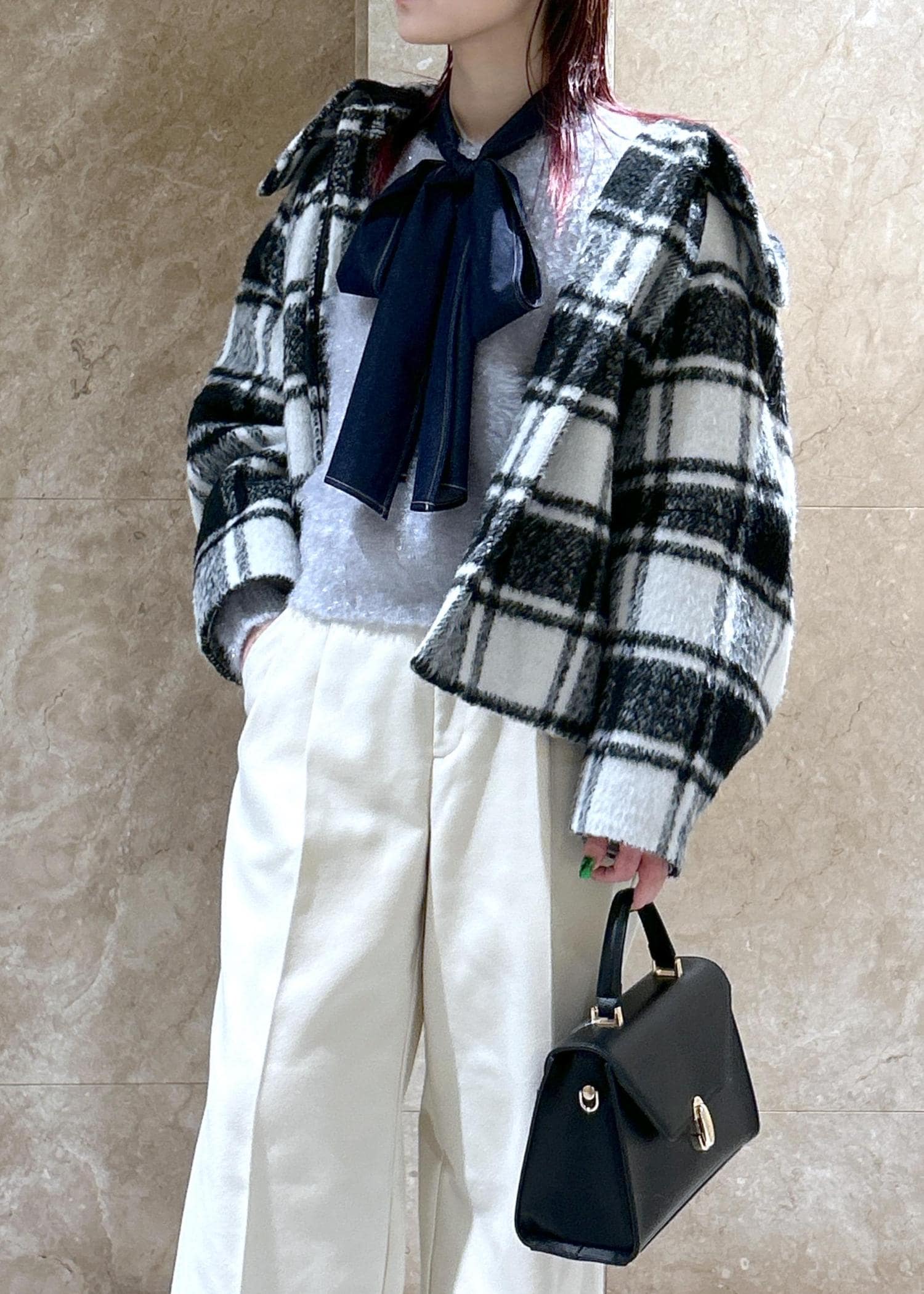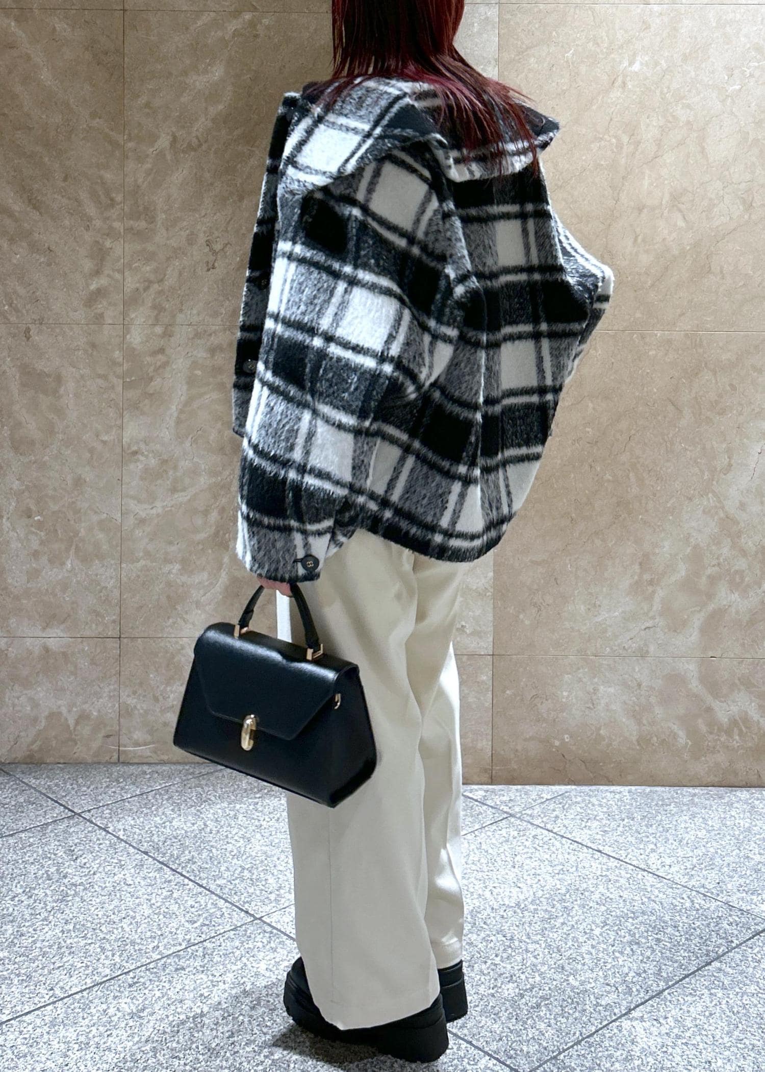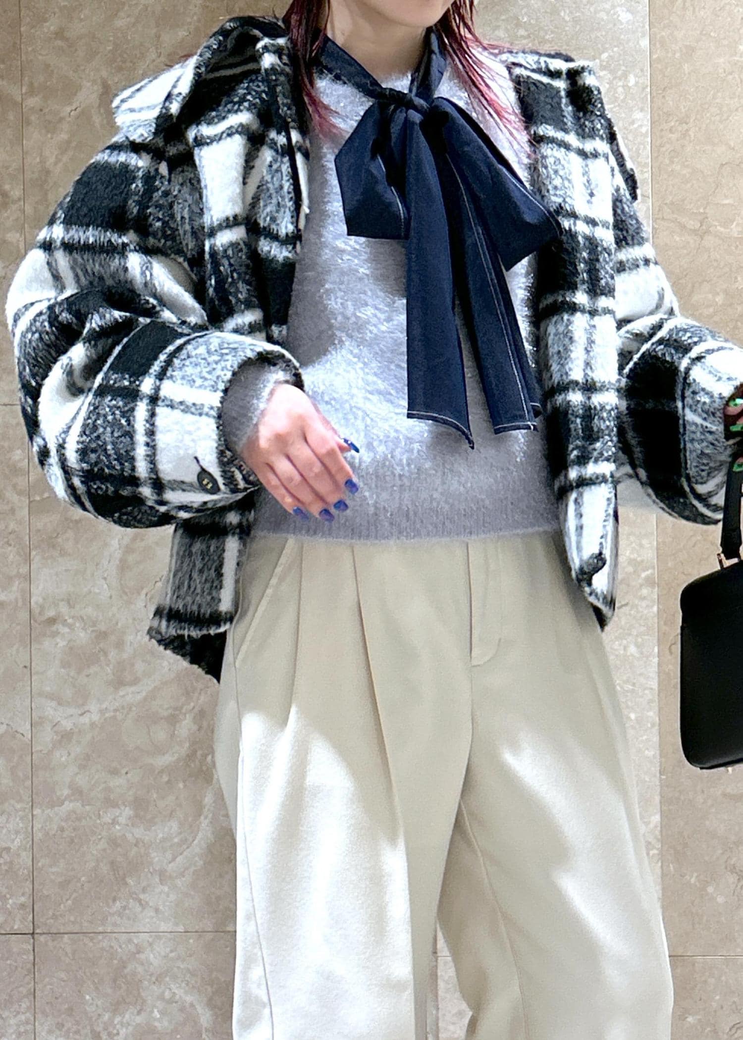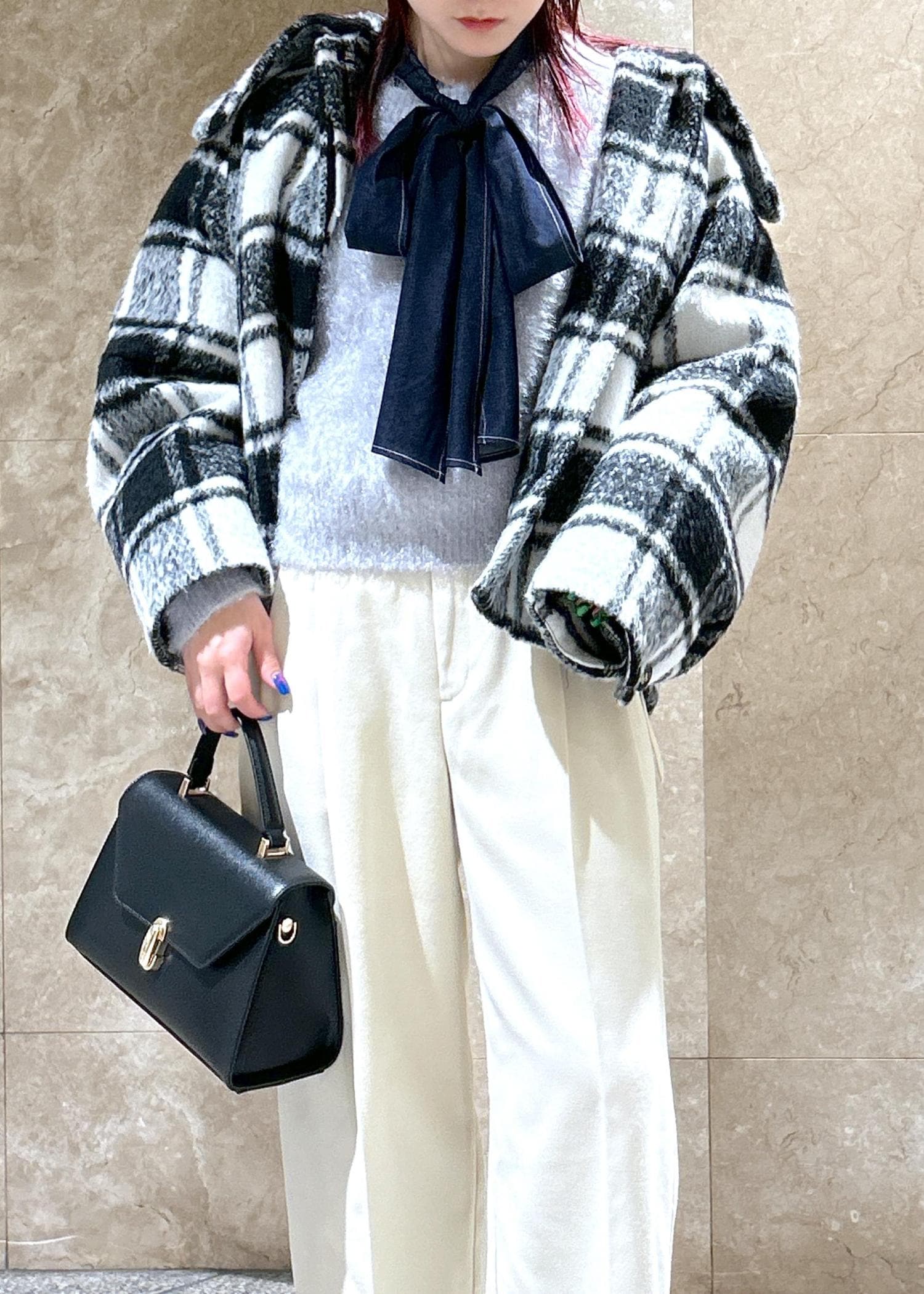 毛足の長いふわふわニットに、シンプルなコーデにアクセントとなるチェック柄のアウターを合わせました!