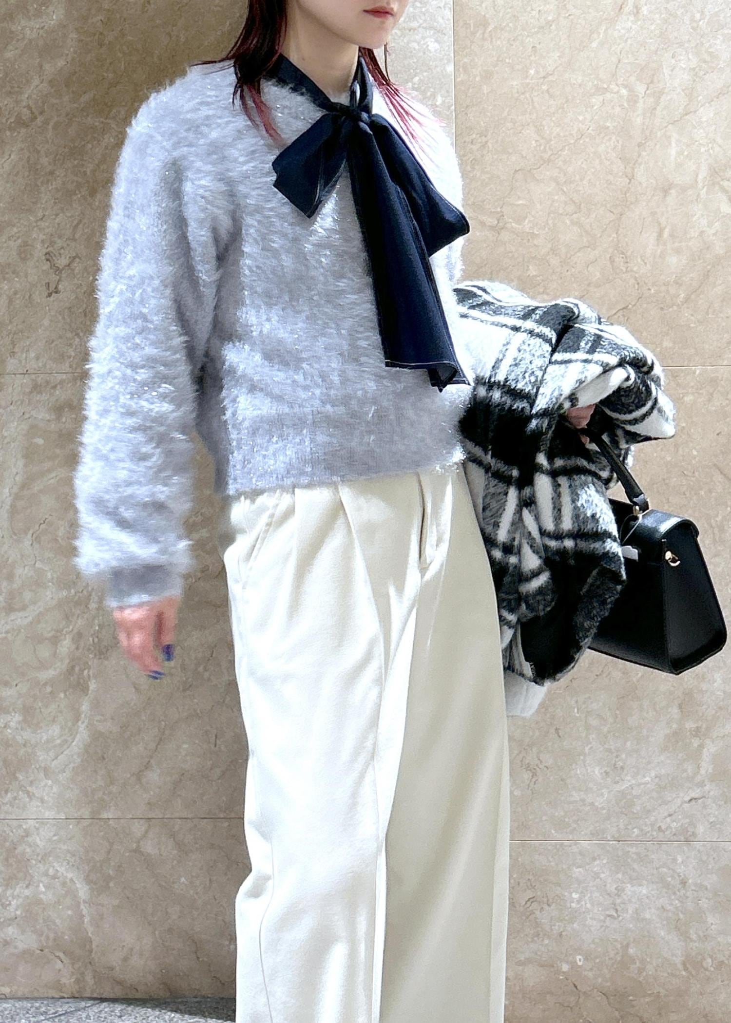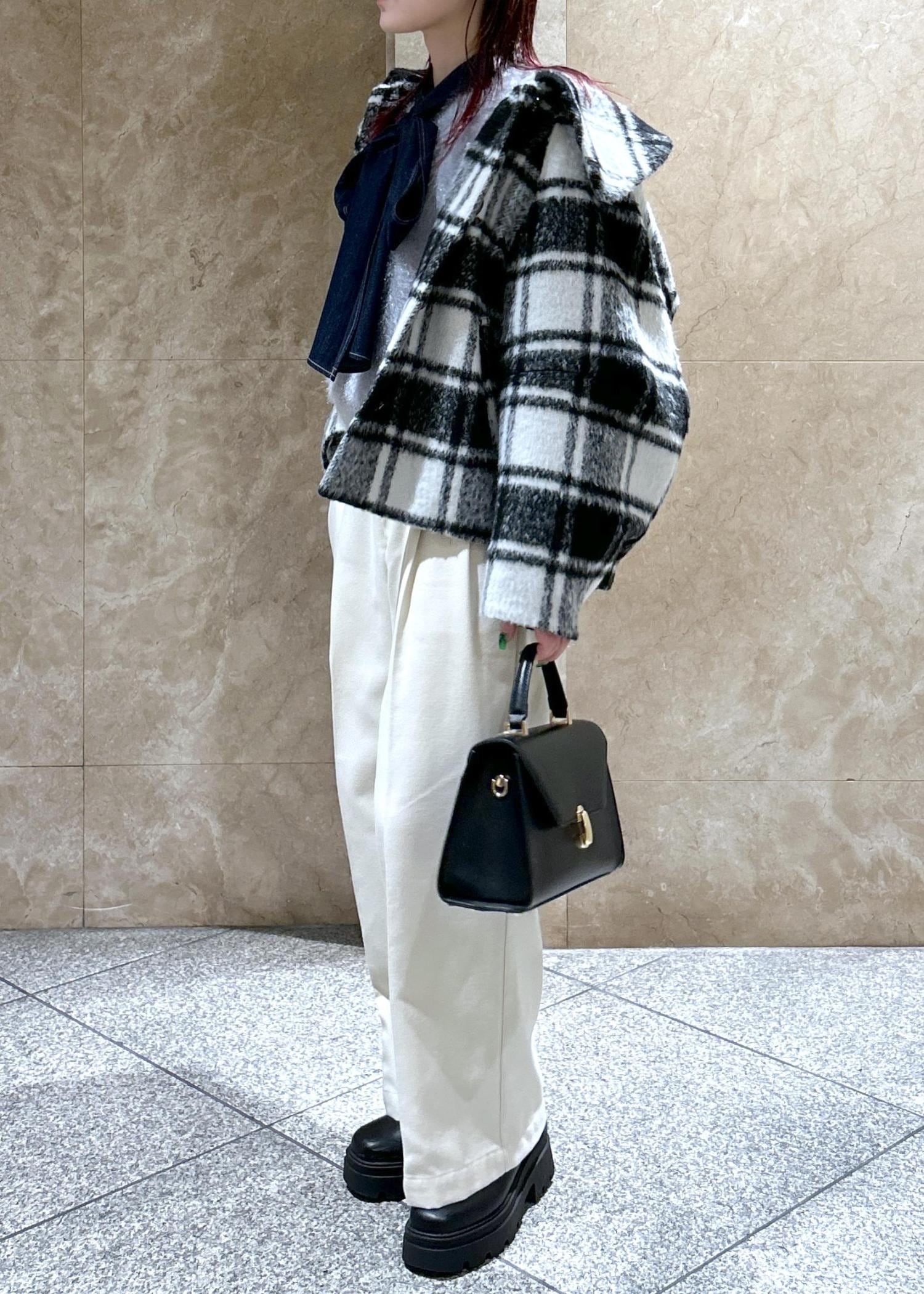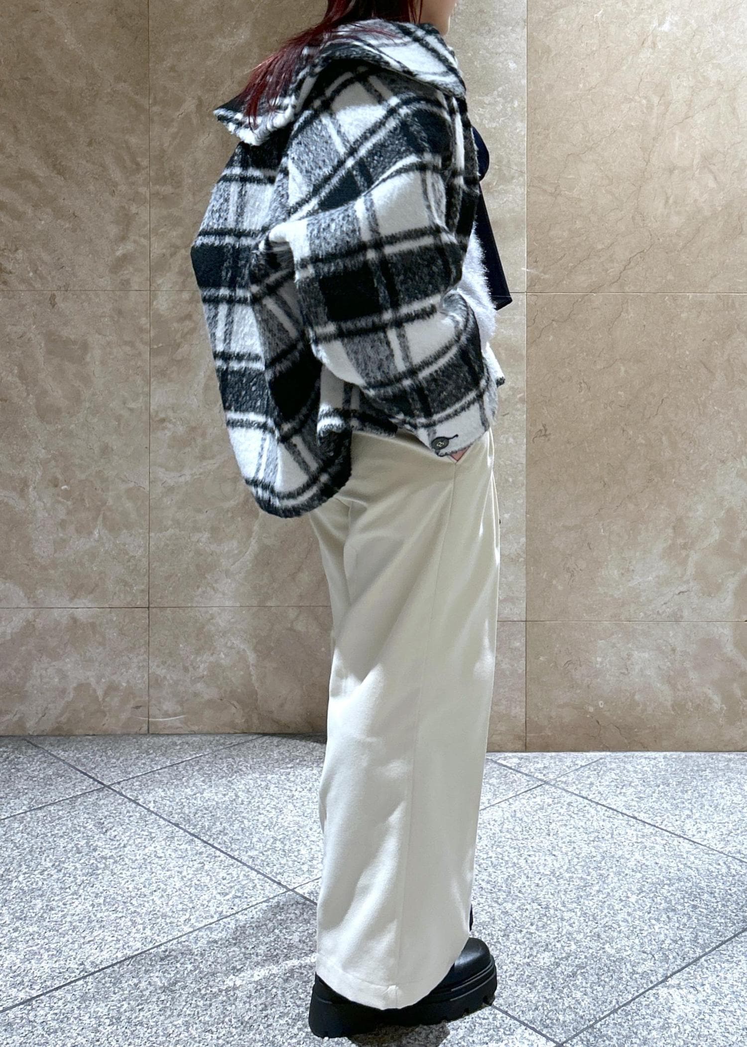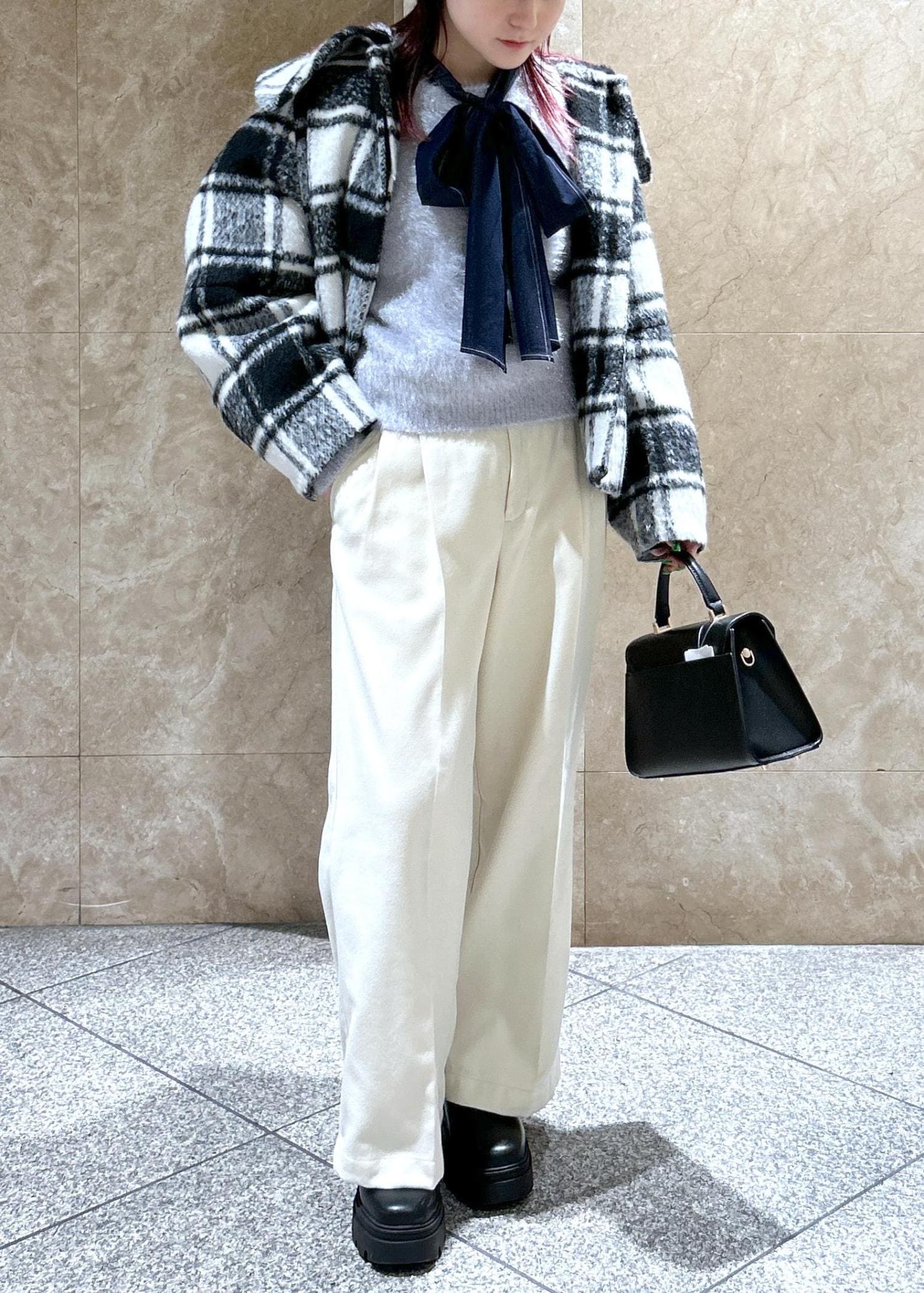 毛足の長いふわふわニットに、シンプルなコーデにアクセントとなるチェック柄のアウターを合わせました!