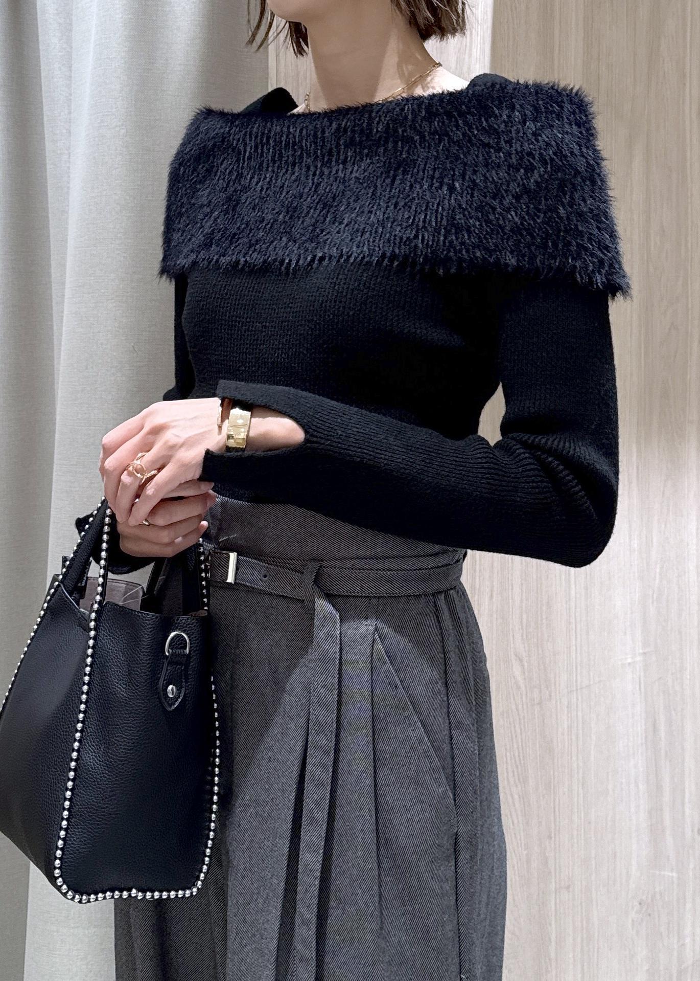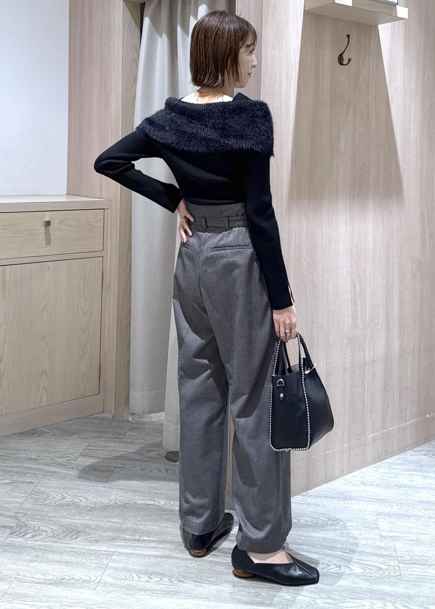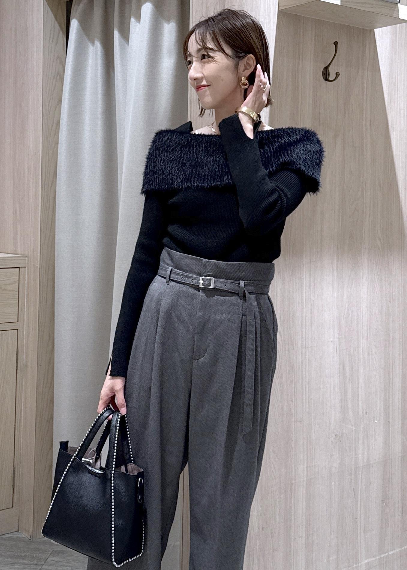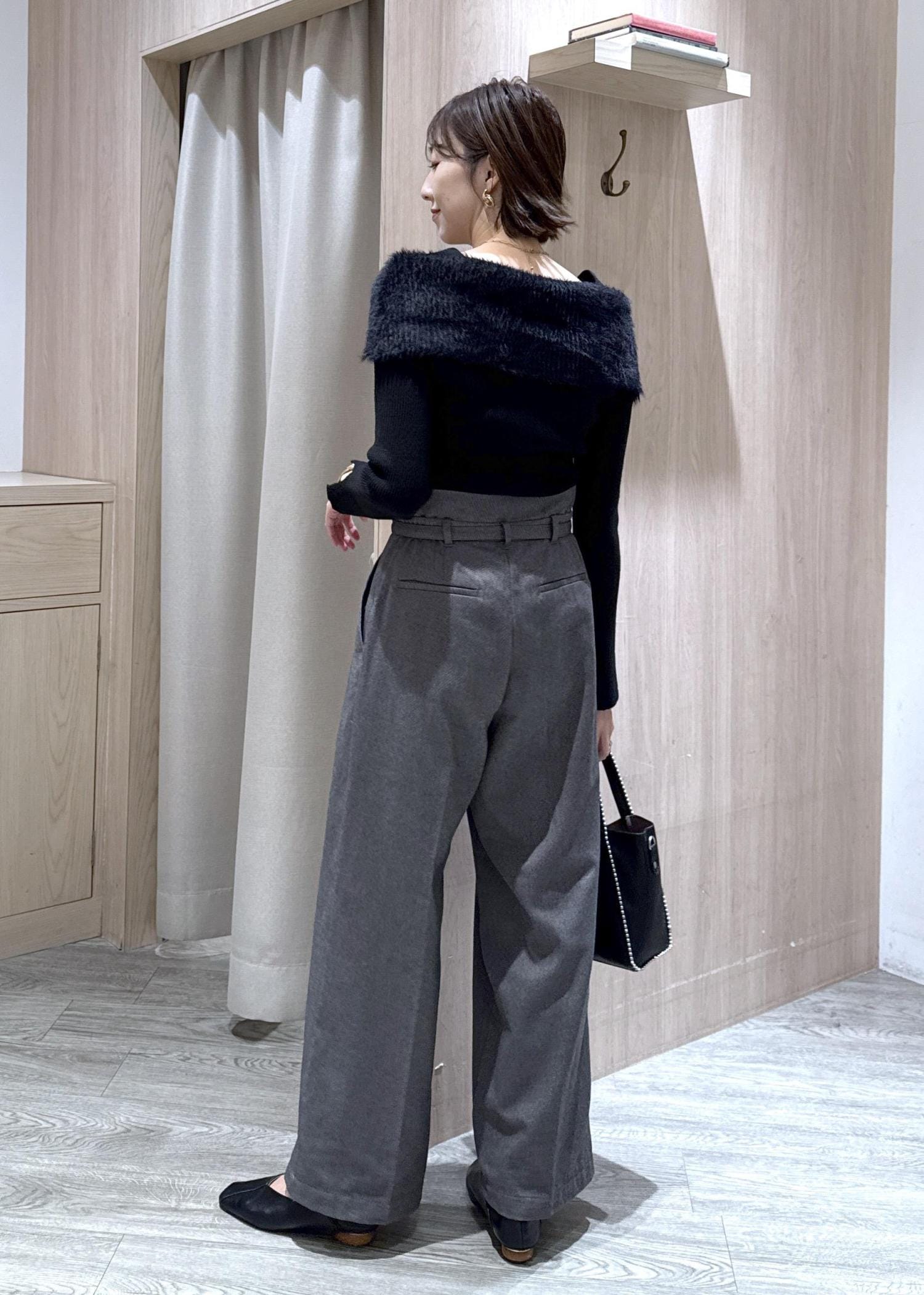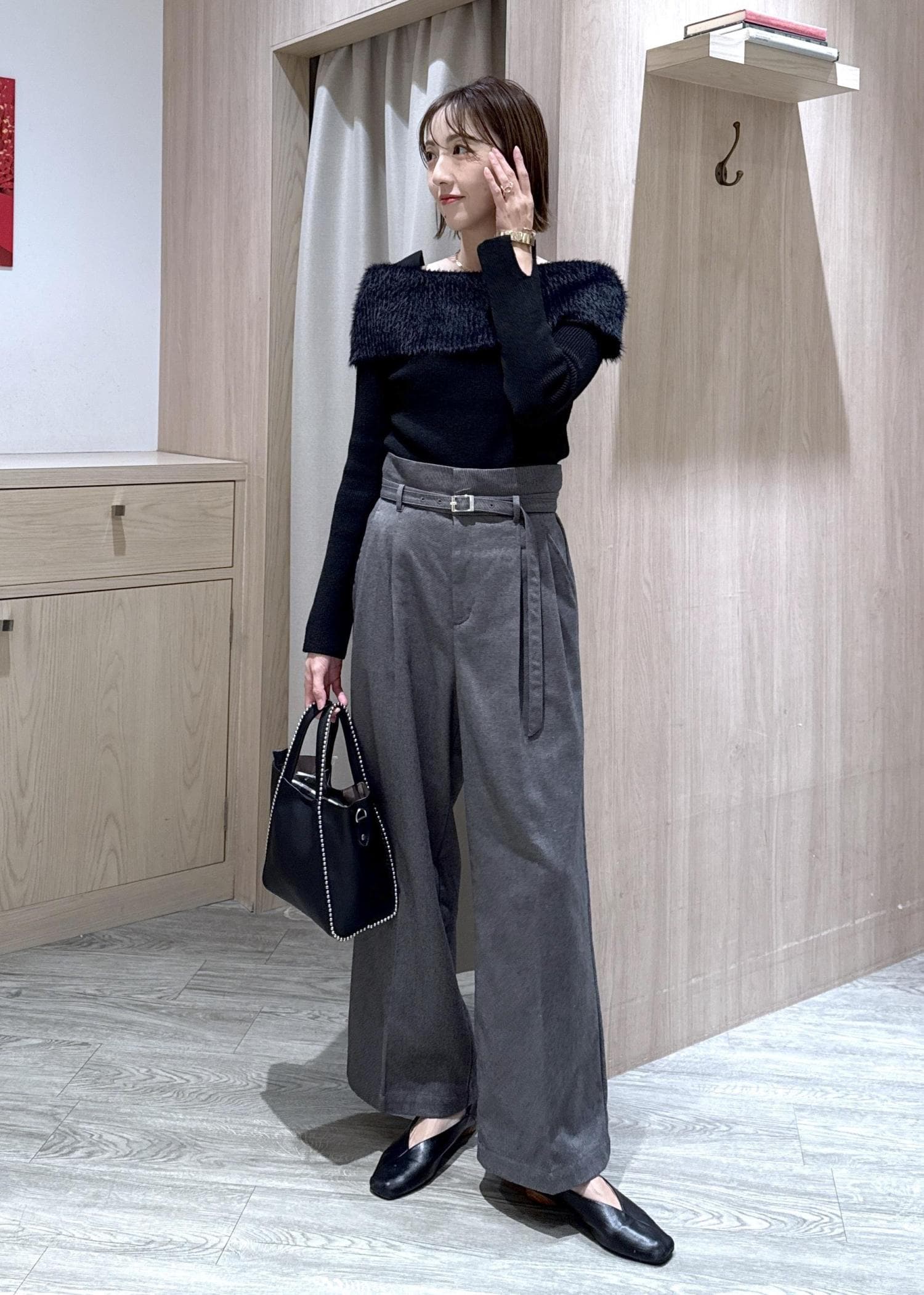 女性らしいオフショルニットにワイドパンツを合わせてキレイめすぎないスタイリングにしてみました!
