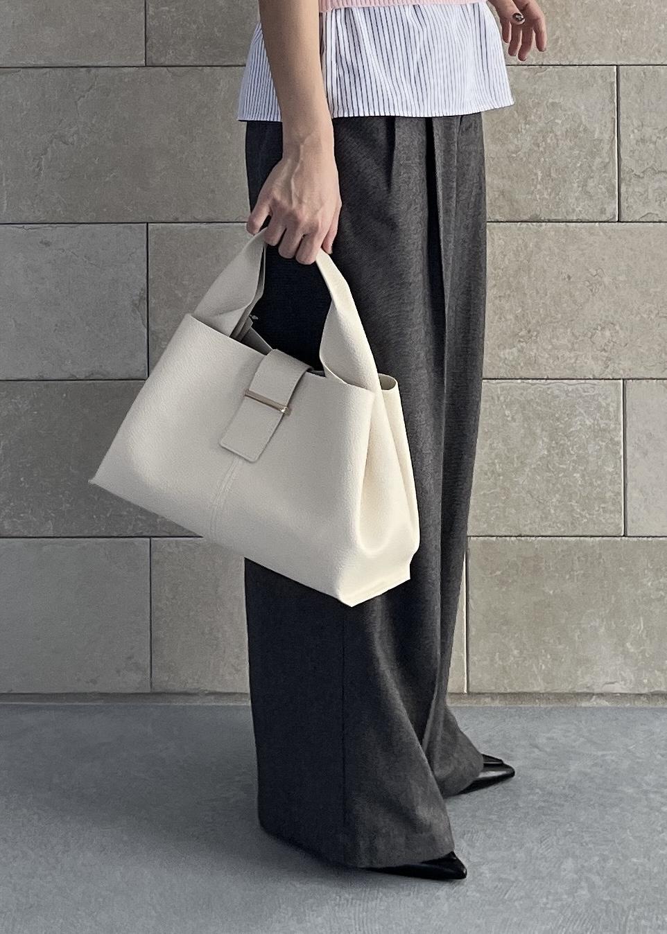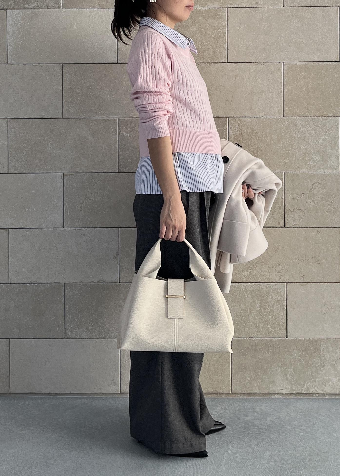 白バッグと同トーンのアウターを添えるだけで、一気に品のある春先取りスタイルに仕上がります。