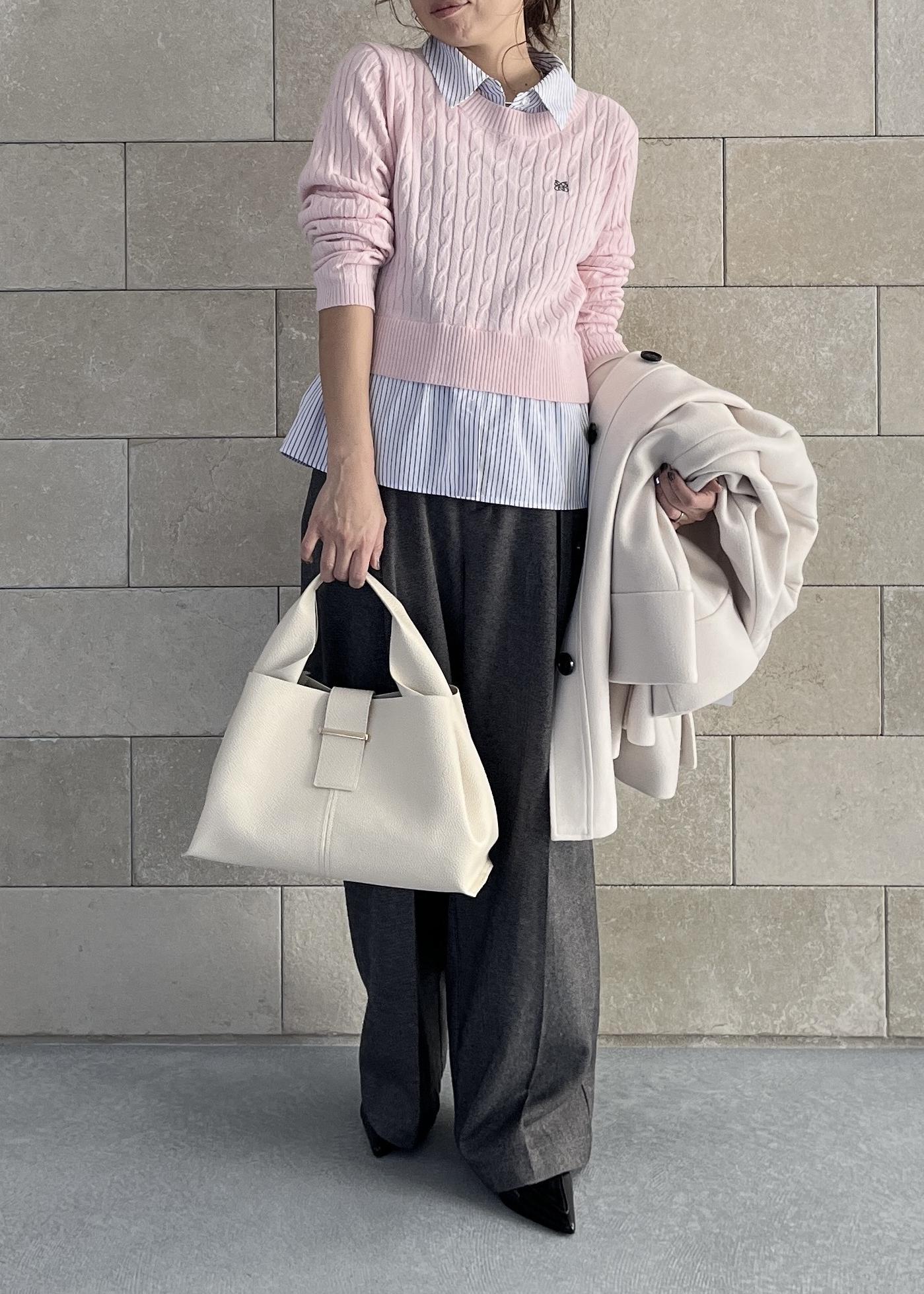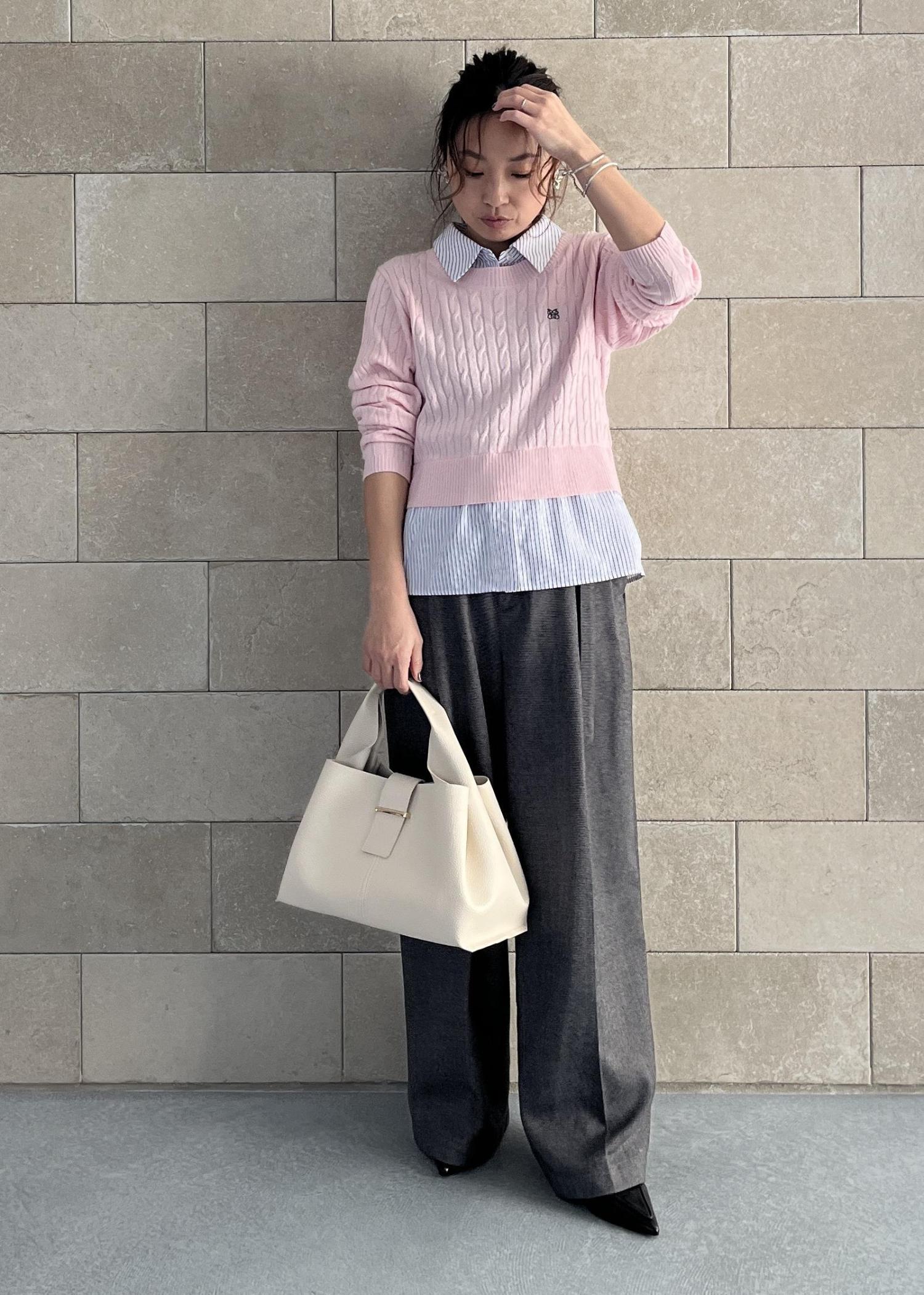 淡ピンクのケーブルニットにストライプシャツがドッキングした、大人かわいいスタイル。