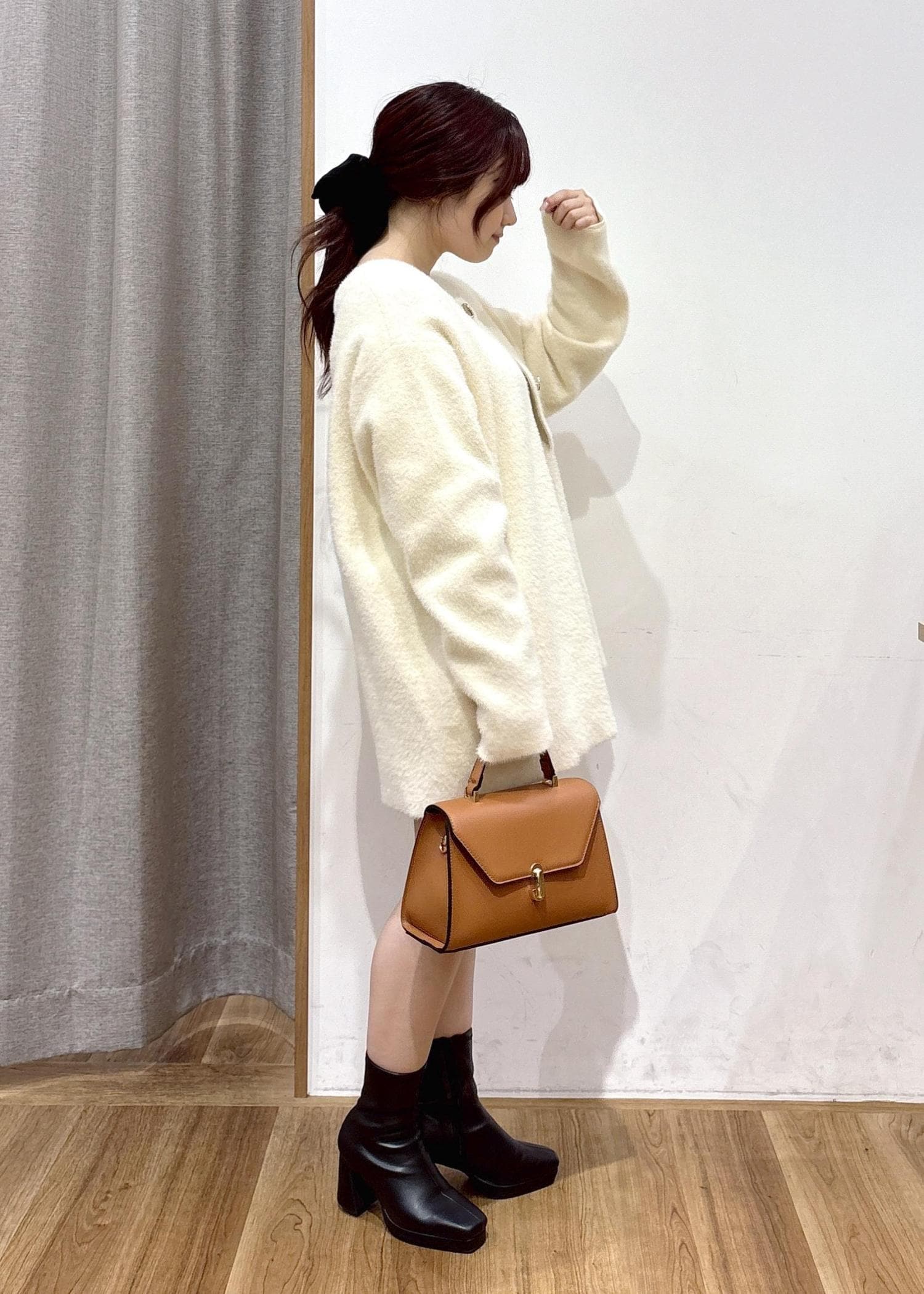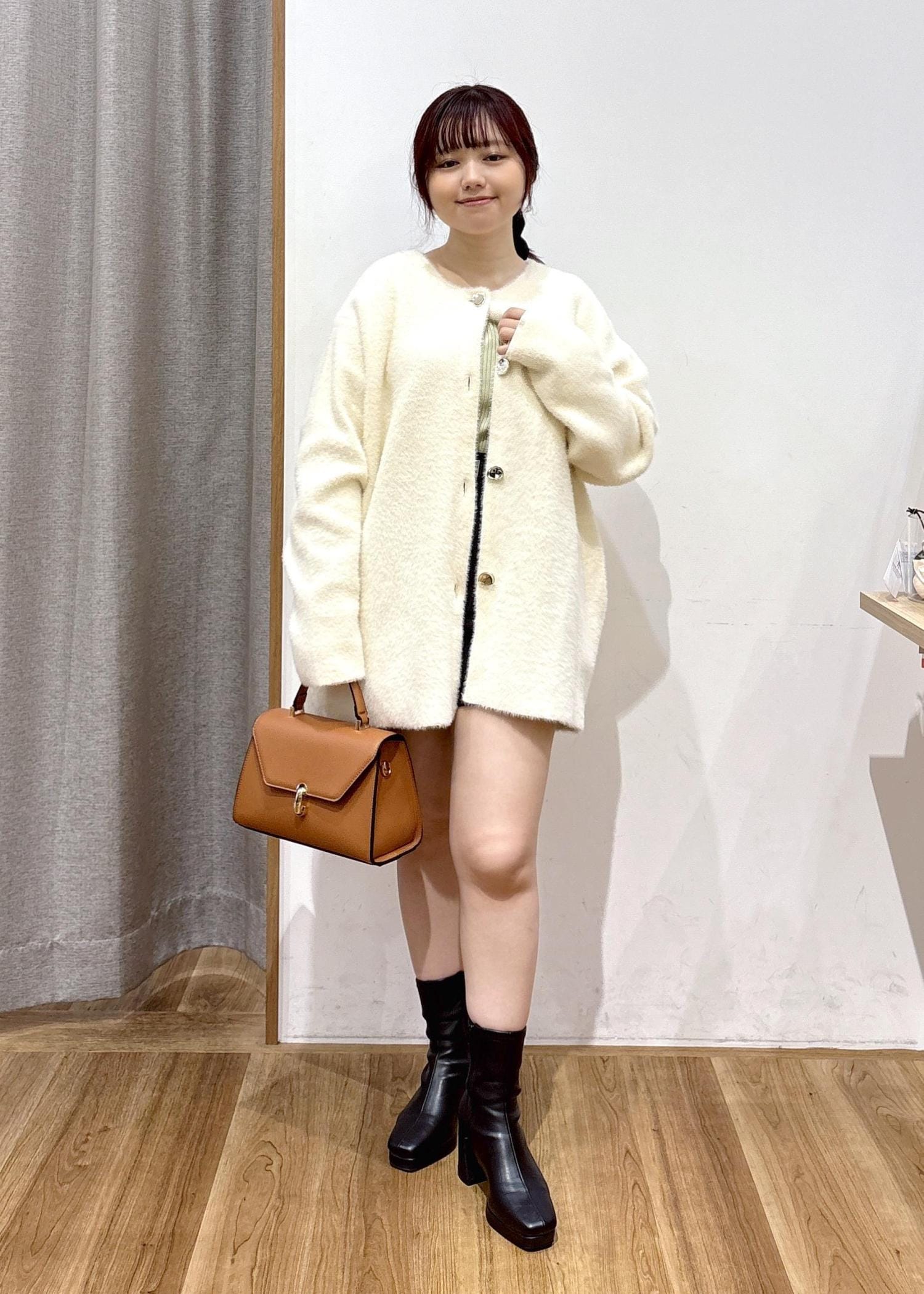 低身長の方でもバランスの取りやすい、やわらかくふんわりとした着心地のアウターをメインとしたコーディネートです。