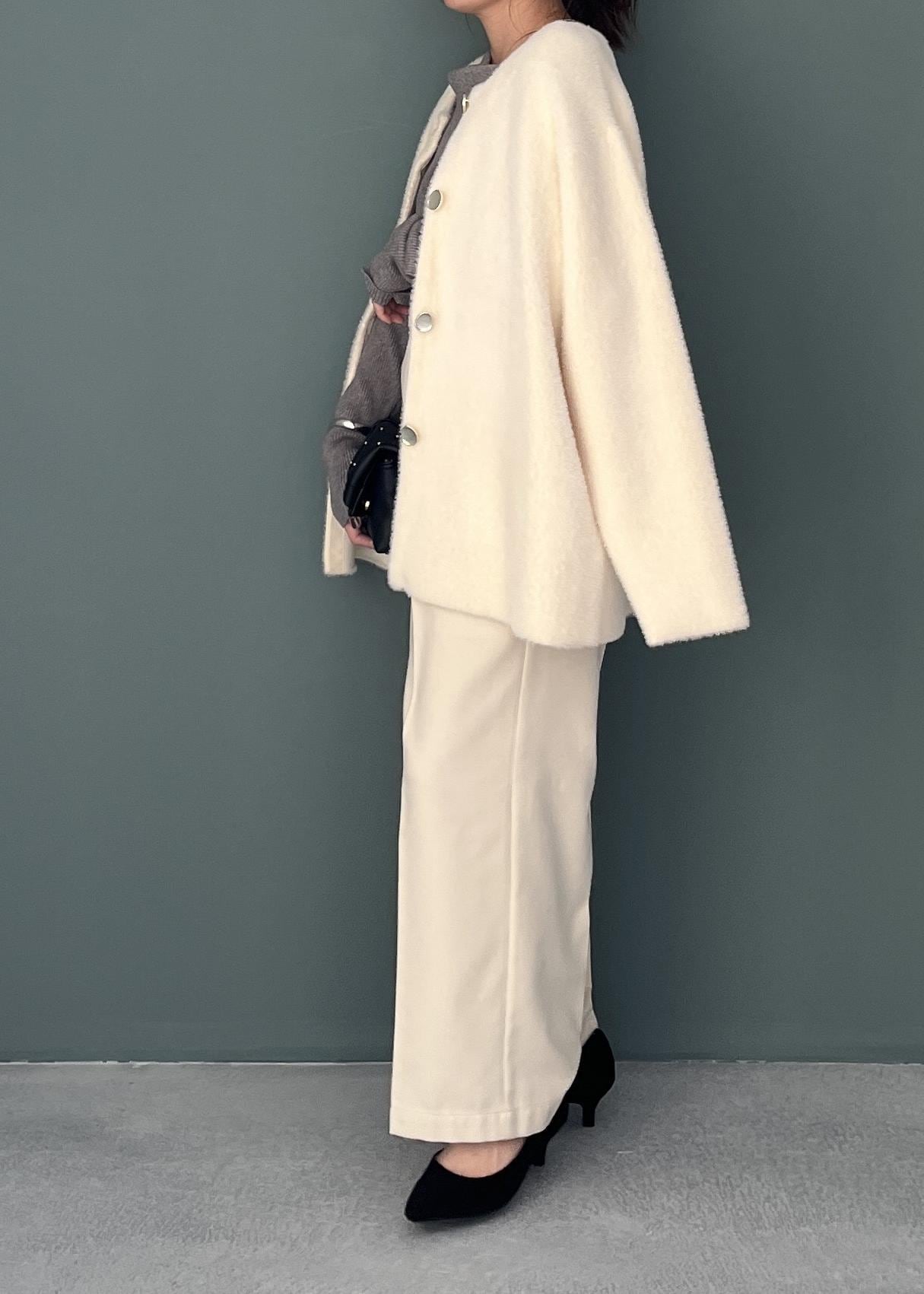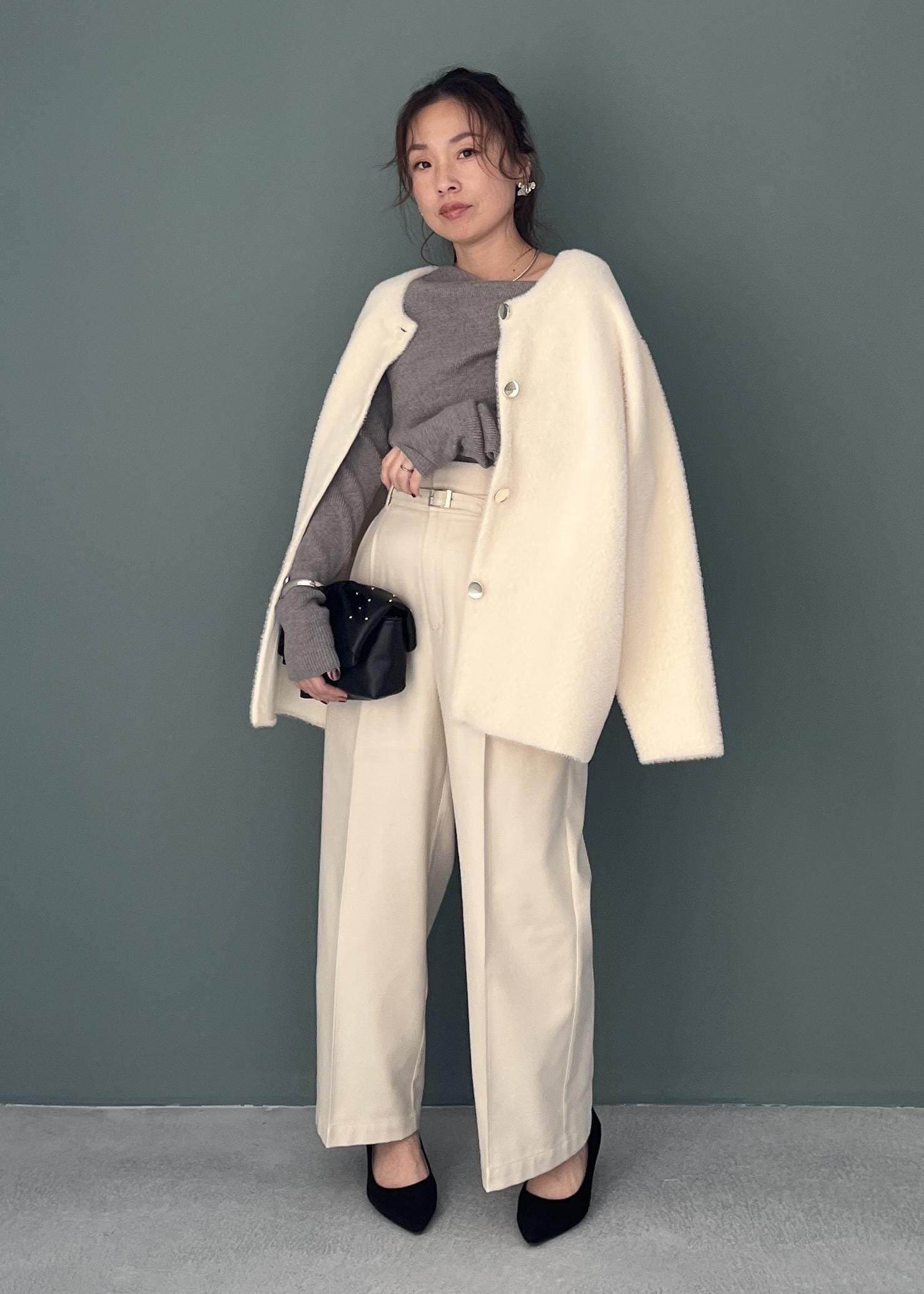 ふわっとした白アウターを羽織れば、冬の淡色コーデがぐっと洗練された雰囲気に。